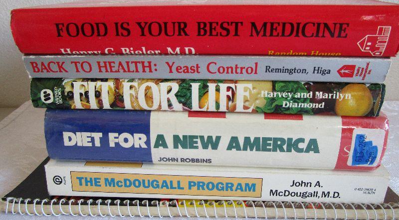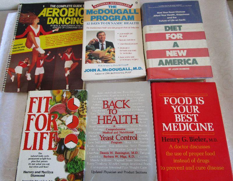 Six Books- Fit for Life, Food is You Best Medicine, Back to Health: Yeast Control, Diet For A New America, The McDougall Program, The Complete guide to Aerobic Dancing