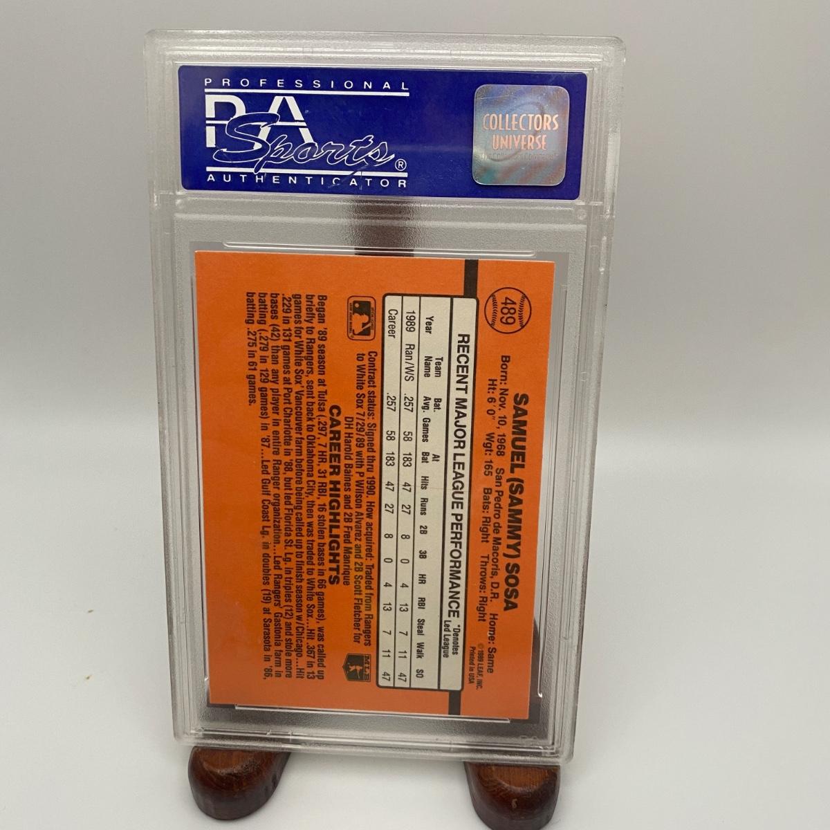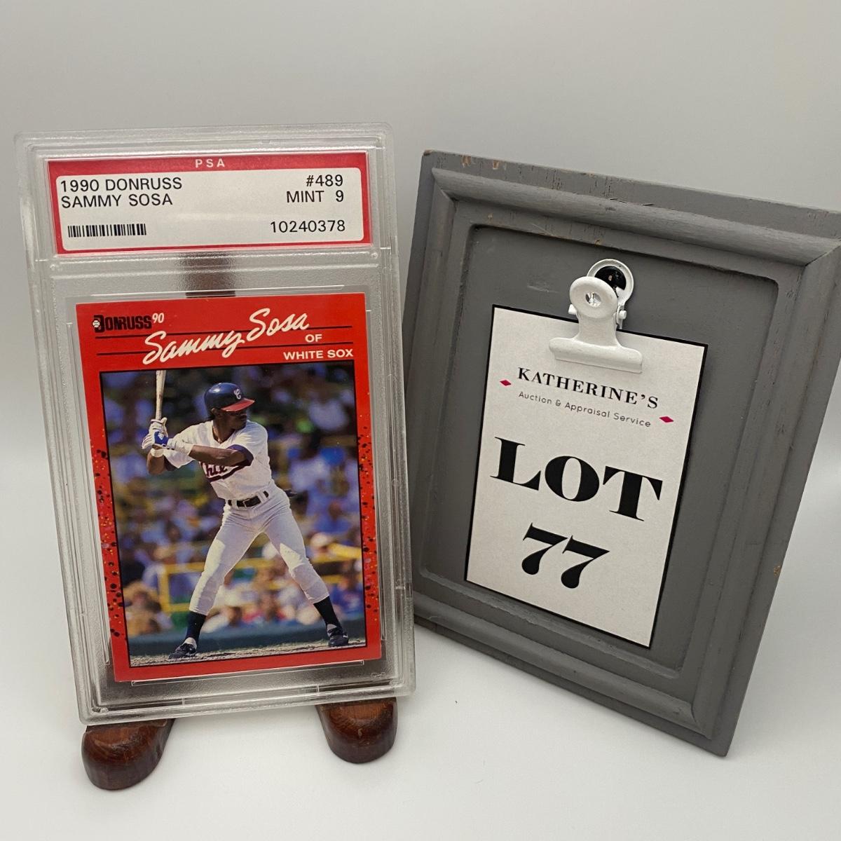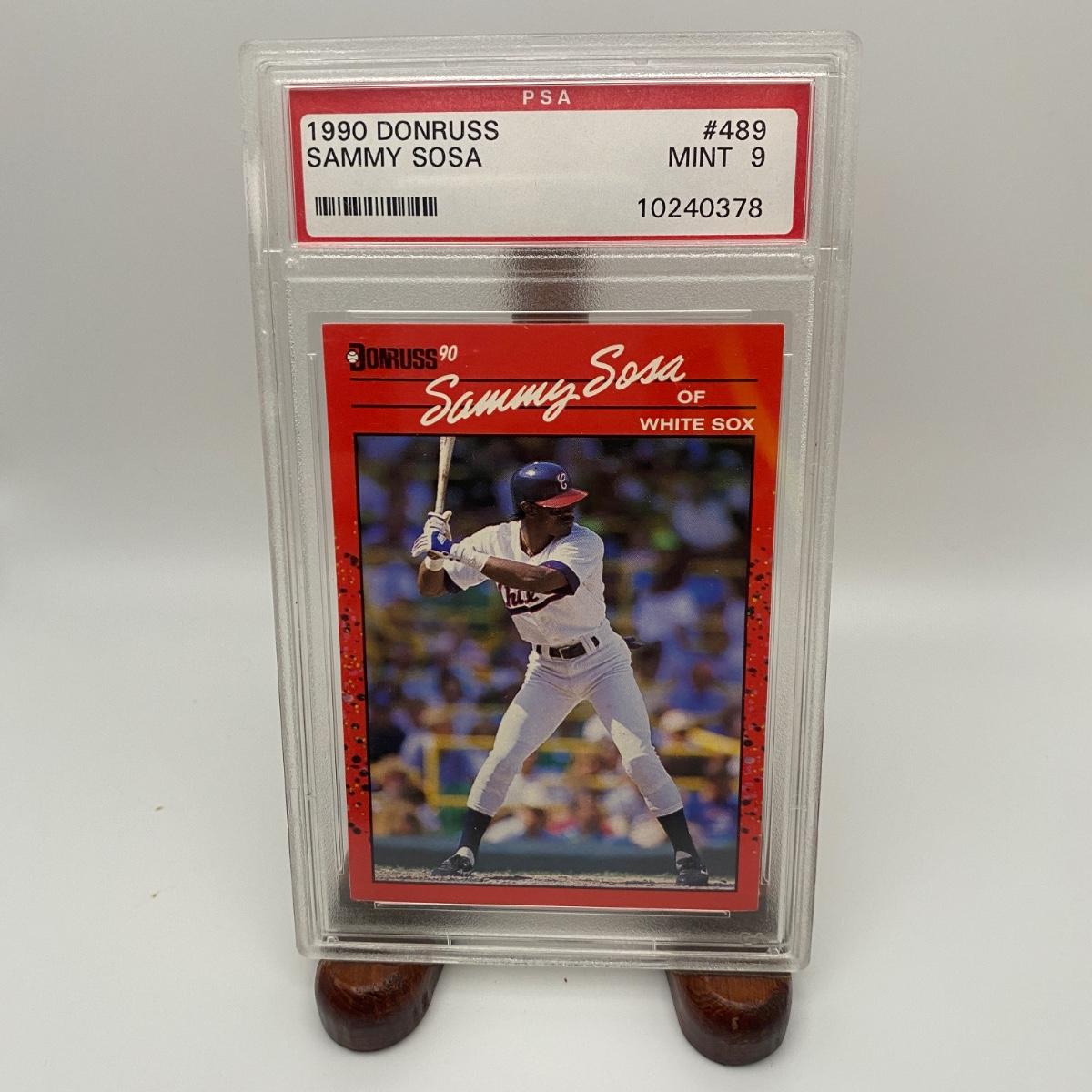 One 1990 Donruss Sammy Sosa graded card mint 9. Please see photos for details and condition. ::: Shipping is available on this lot. If you require shipping you must let us know at the close of the auction. We will coordinate with you after the item has been won. Shipping fees will include insurance up to or exceeding the value of all items being mailed. If you have any questions regarding this lot please contact the auctioneer either via this website, by direct email or by phone. PICK UP TIMES and other important information can be found in the TERMS and DESCRIPTION of the auction. Please take a look for pertinent information. Thanks!