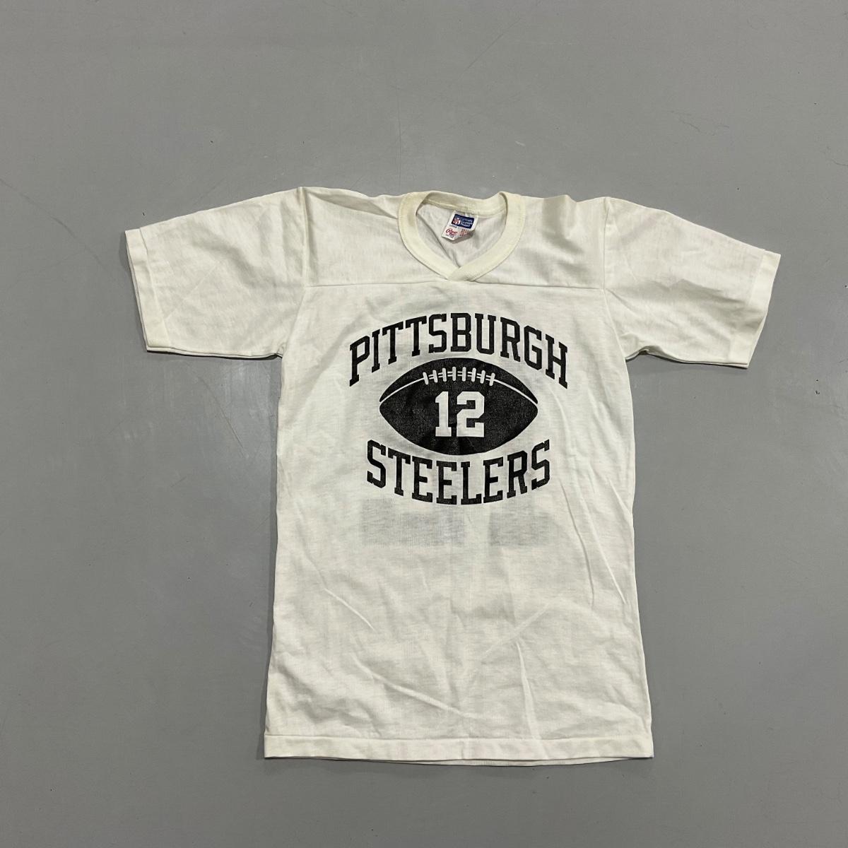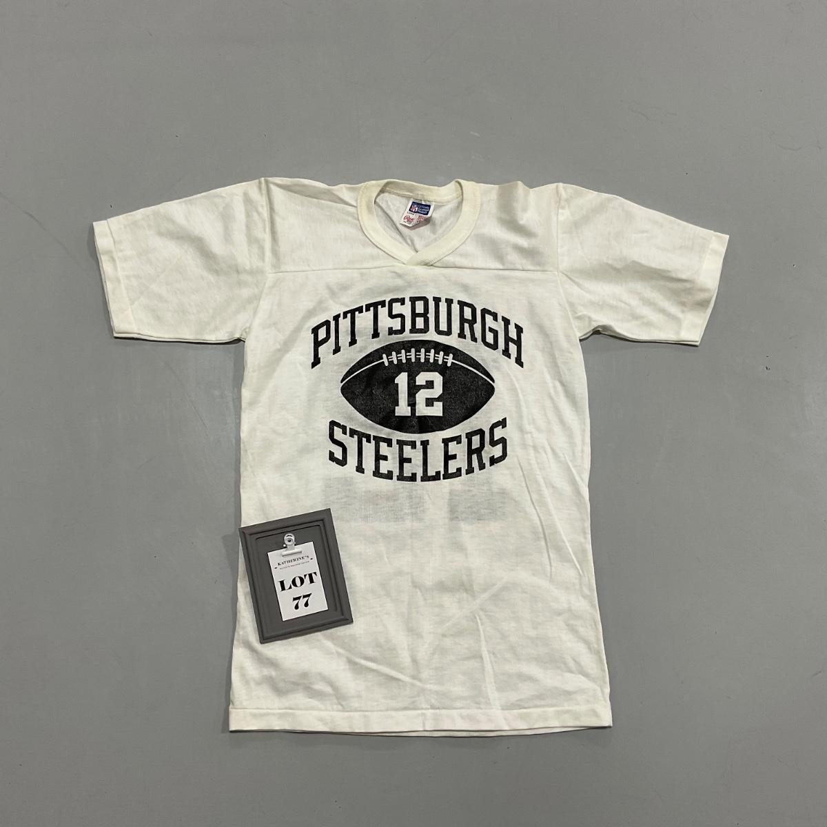 One 1970’s Terry Bradshaw Youth large 14-16 shirt, Pittsburgh Steelers Terry Bradshaw. Please see photos for details and condition. ::: Shipping is available on this lot. If you require shipping you must let us know at the close of the auction. We will coordinate with you after the item has been won. Shipping fees will include insurance up to or exceeding the value of all items being mailed. If you have any questions regarding this lot please contact the auctioneer either via this website, by direct email or by phone. PICK UP TIMES and other important information can be found in the TERMS and DESCRIPTION of the auction. Please take a look for pertinent information. Thanks!