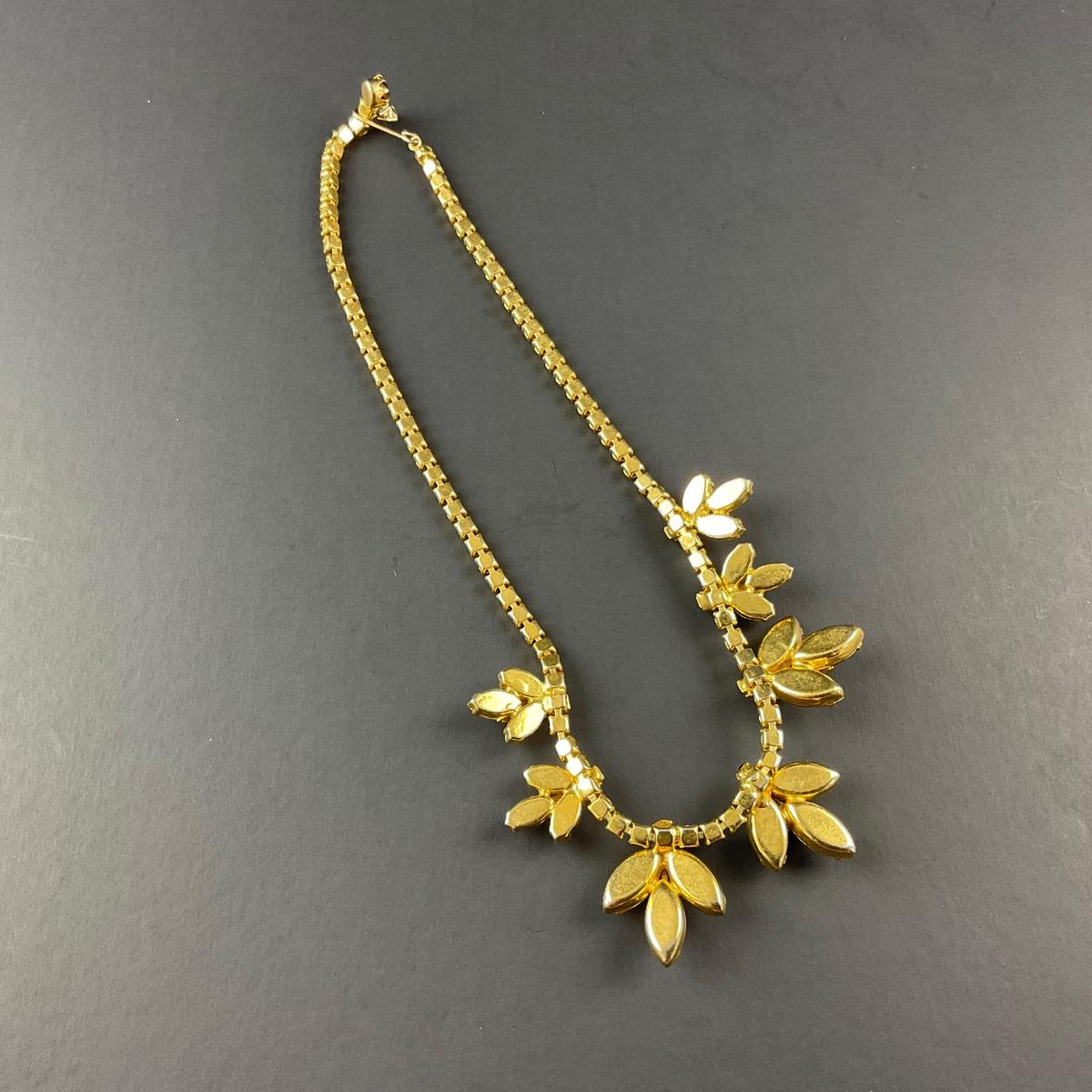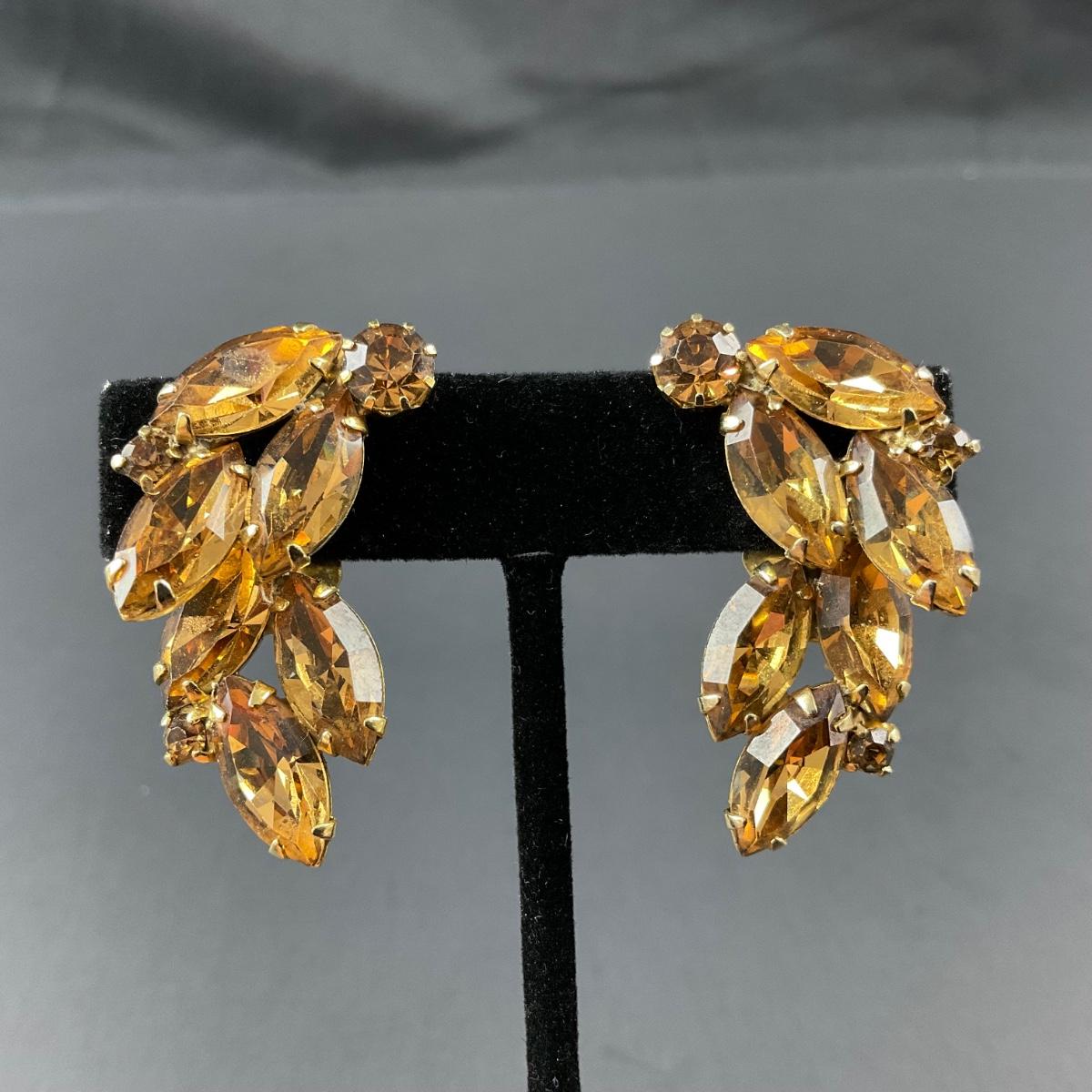 Three pieces of marked Weiss amber rhinestone jewelry including one necklace and clip earrings. Please see photos for details and condition. Any condition statement is given as a courtesy to a client, is an opinion, and should not be treated as a statement of fact. Reference to condition written, oral or within a condition report shall not be regarded as a full account of condition and may not include all defects, alterations, or restorations. Absence of a condition report does not imply a lot is flawless or lacking imperfections or damage. Katherine’s Auction & Appraisal Service shall have no responsibility for any error or omission. Returns shall not be accepted on the basis of condition. ::: Shipping is available on this lot. If you require shipping you must let us know at the close of the auction. We will coordinate with you after the item has been won. Shipping fees will include insurance up to or exceeding the value of all items being mailed. If you have any questions regarding this lot please contact the auctioneer either via this website, by direct email or by phone. PICK UP TIMES and other important information can be found in the TERMS and DESCRIPTION of the auction. Please take a look for pertinent information. Thanks!
