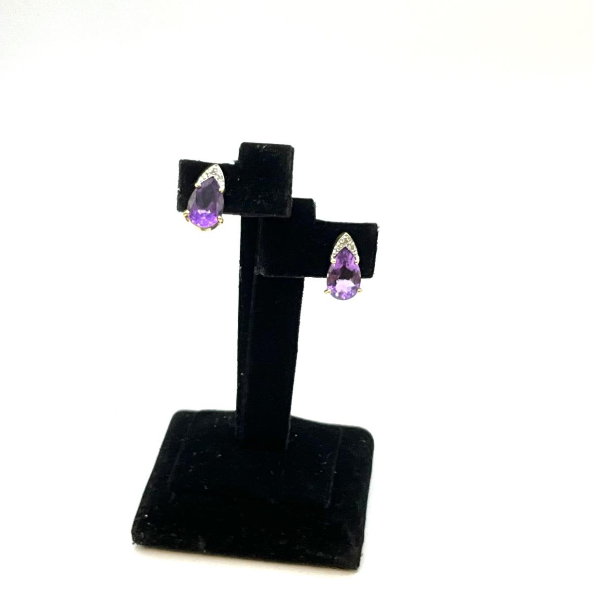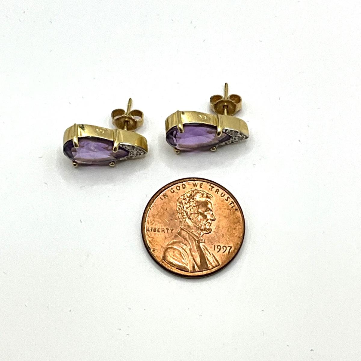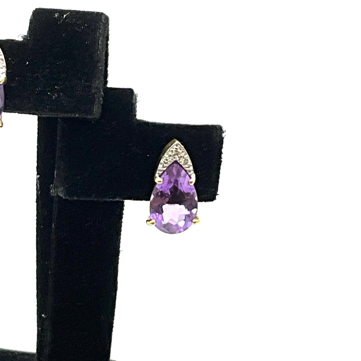 770 14k Yellow Gold Pear Shaped Amethyst and Diamond Pierced Earrings