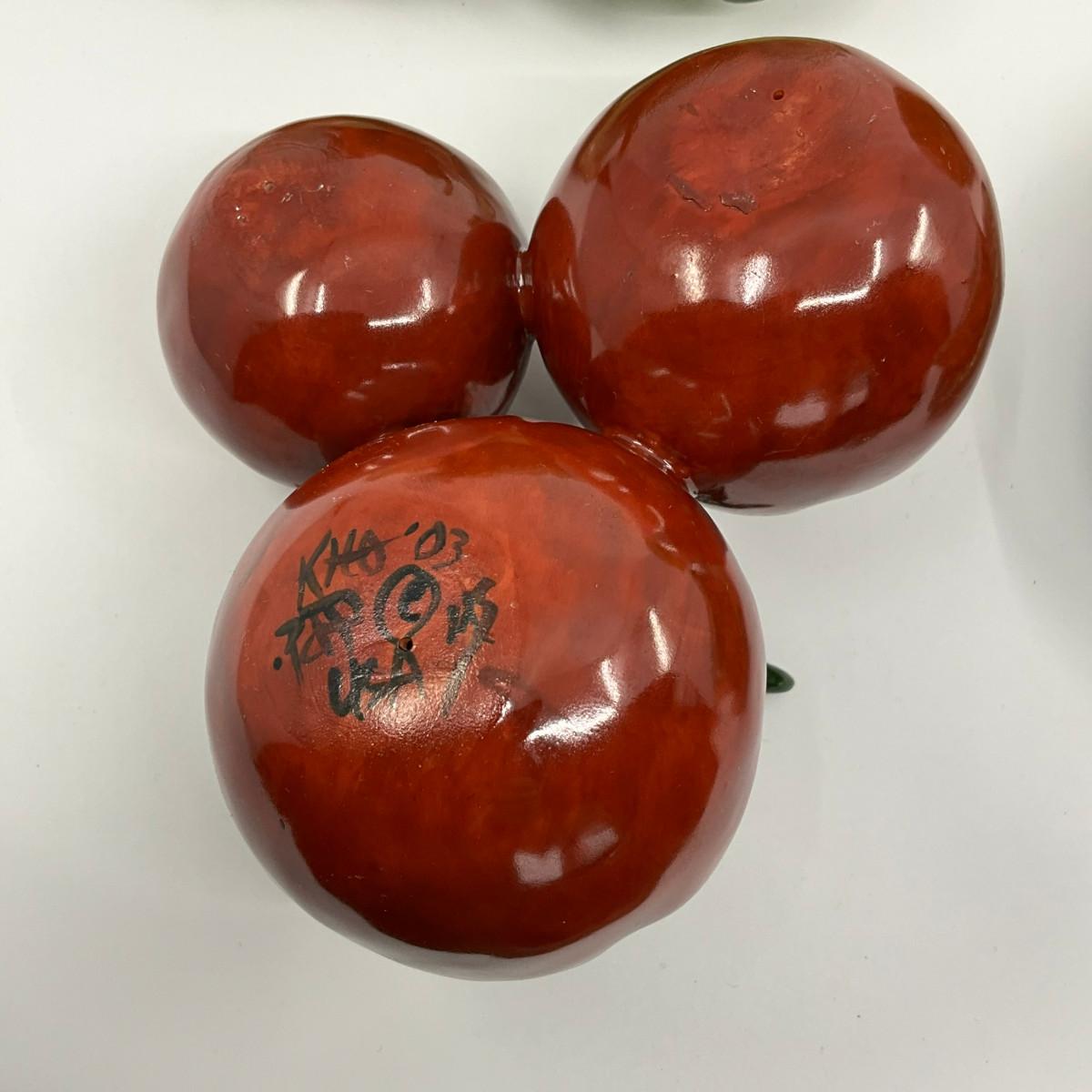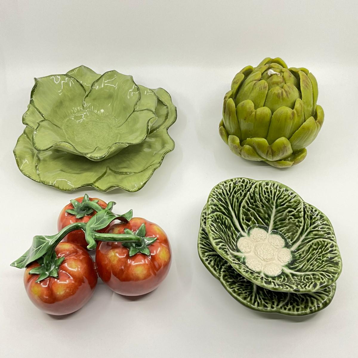 770 Signed Ceramic Tomatoes, Majolica Lettuce Bowl, Artichoke Candle, and Pottery Barn Bowl