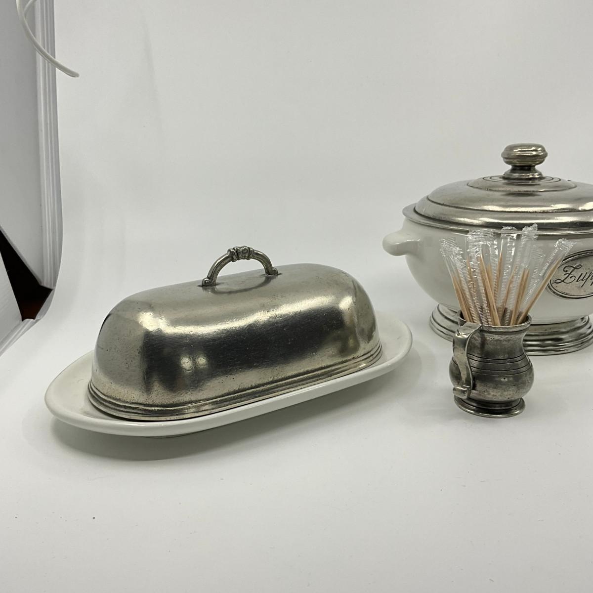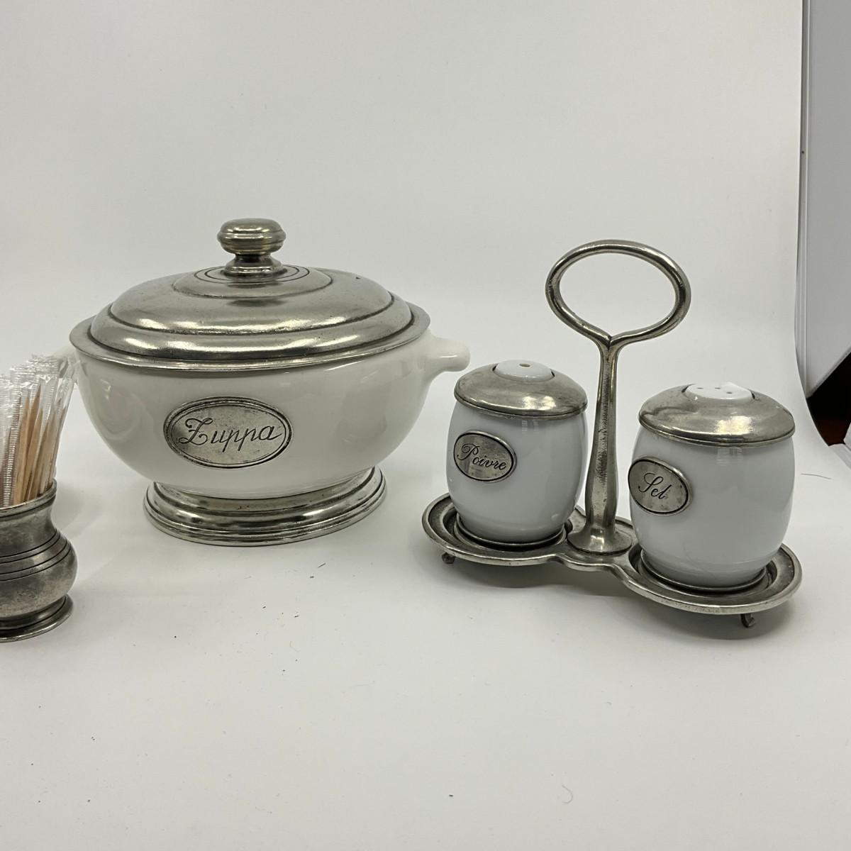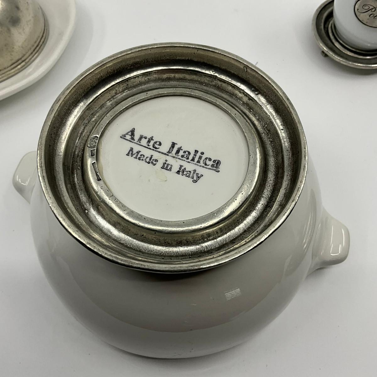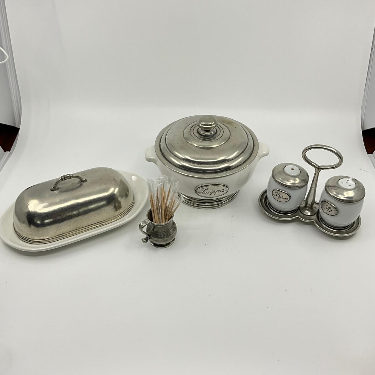 771 Italian Pewter Salt & Pepper Shakers, Butter Dish, Sugar Bowl, and Tooth Pick Holder
