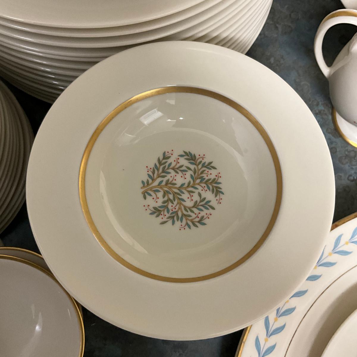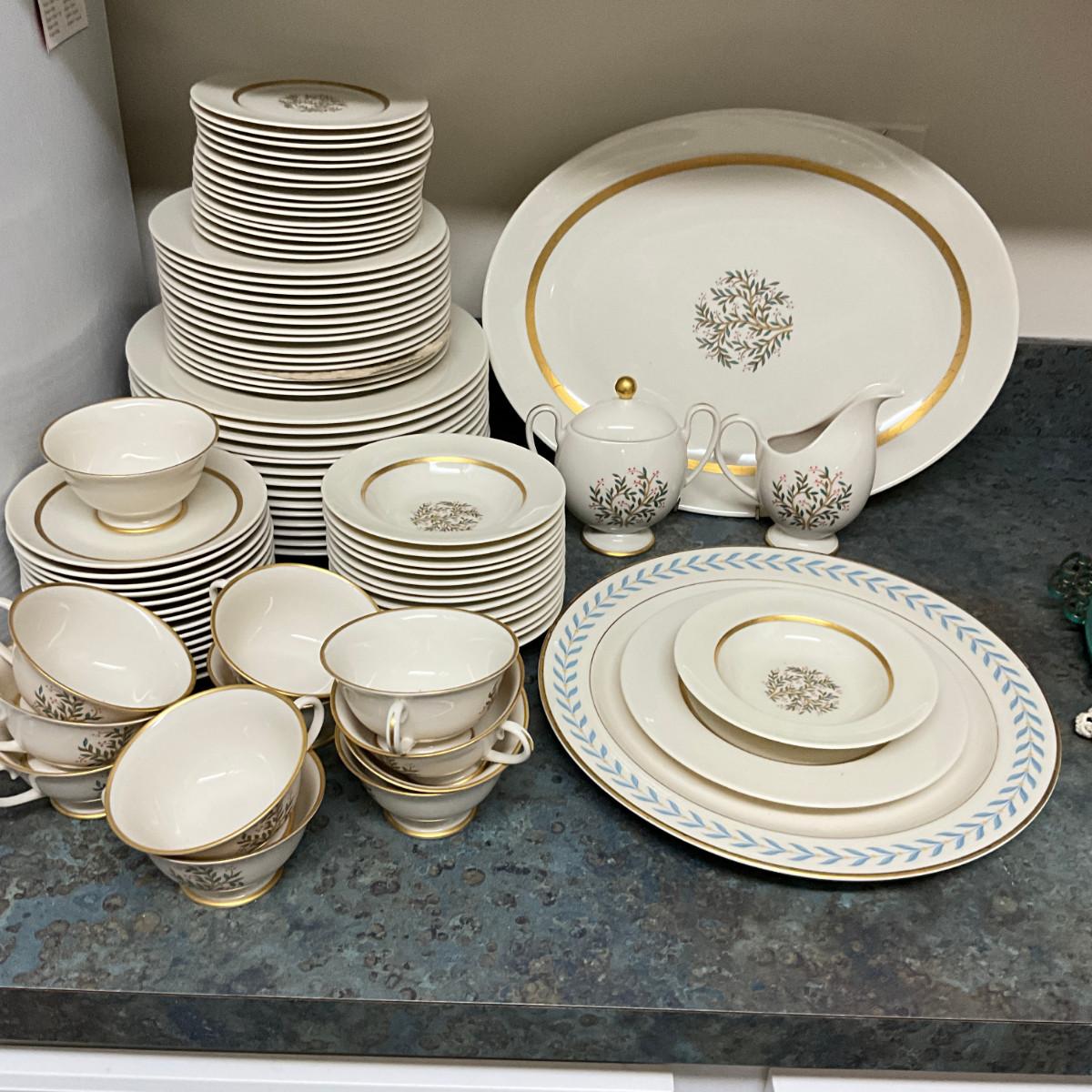 14 dinner plates (10"), 15 salad plates (8"), 14 bowls (6.25"), 15 bread & butter, 11 teacups, 13 saucers, two platters (12.25" x 16.25")