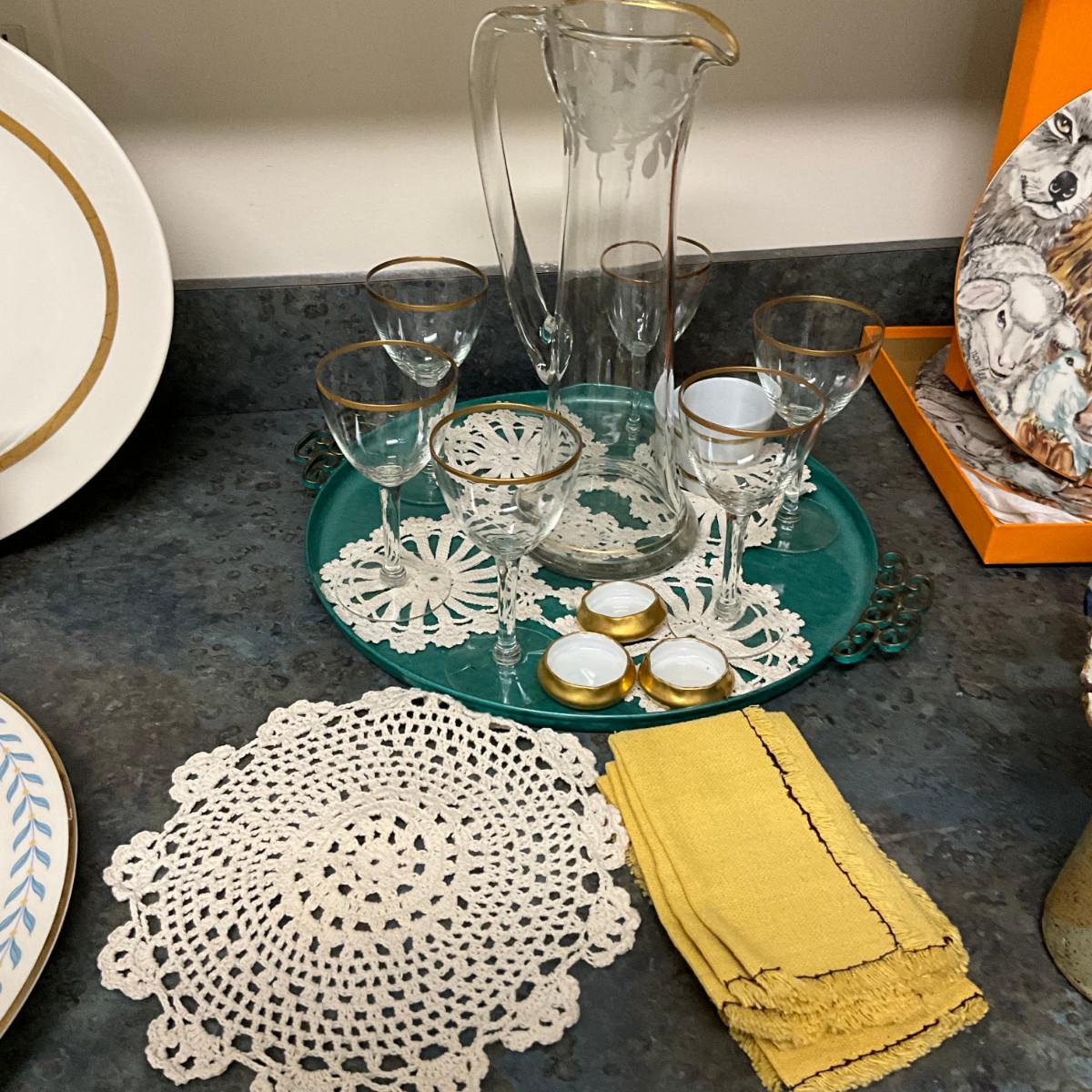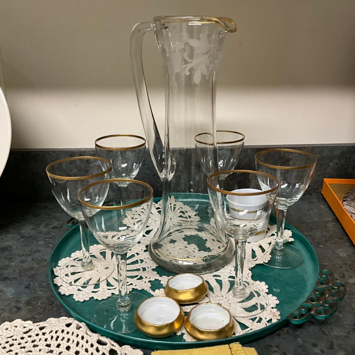 777 Lot of Six Crystal Wine With Etched Pitcher And Tray