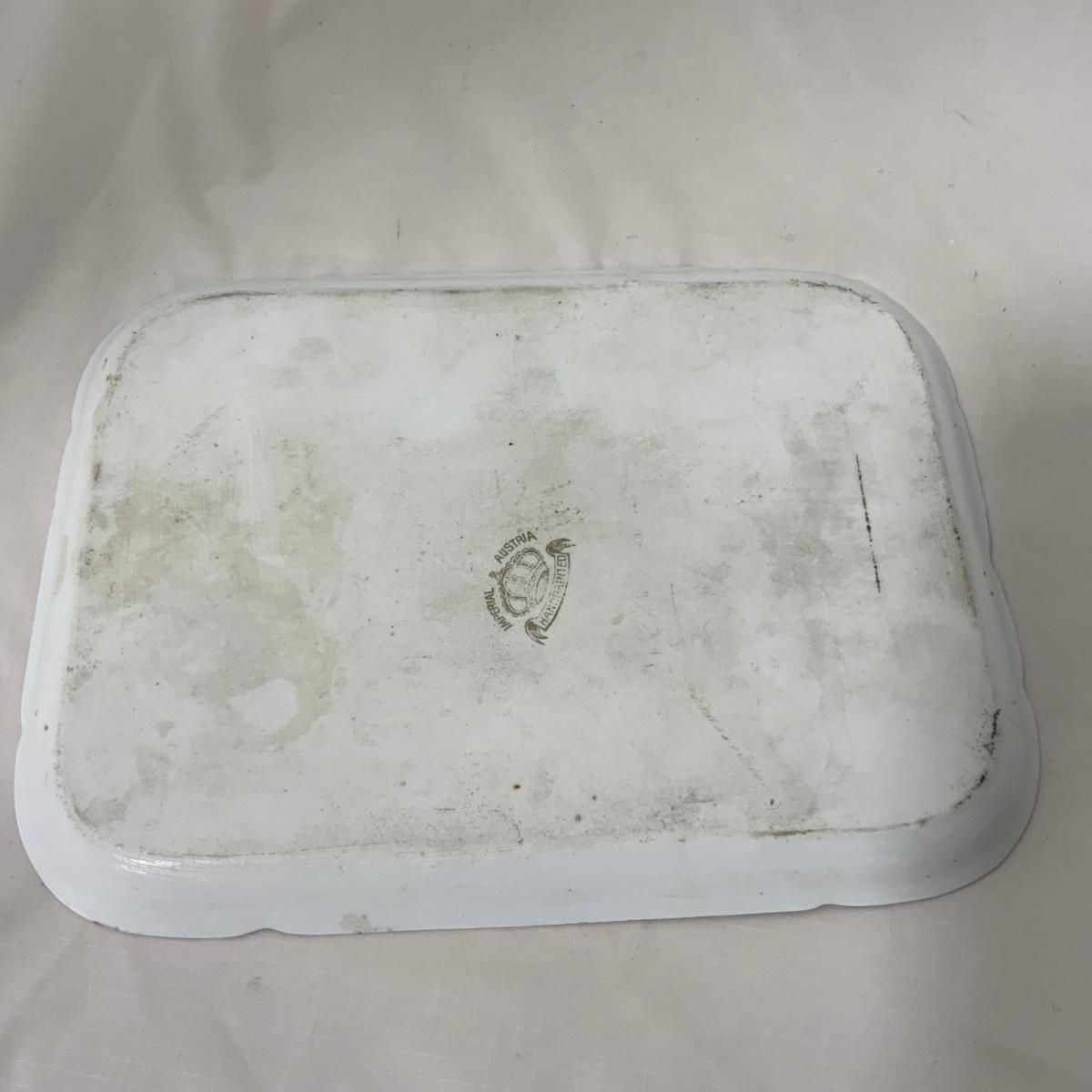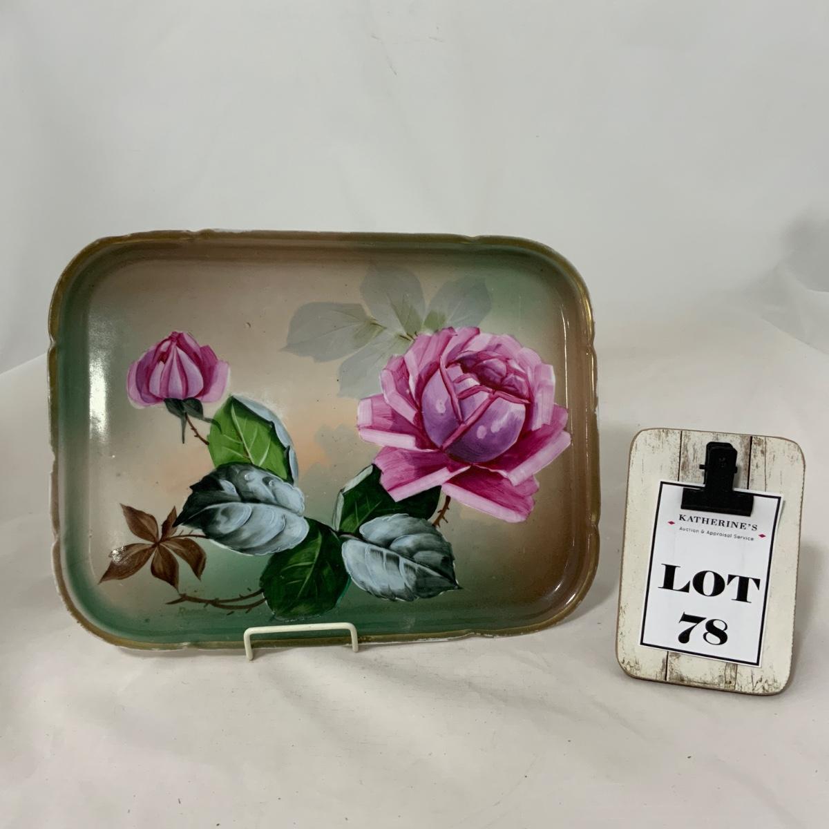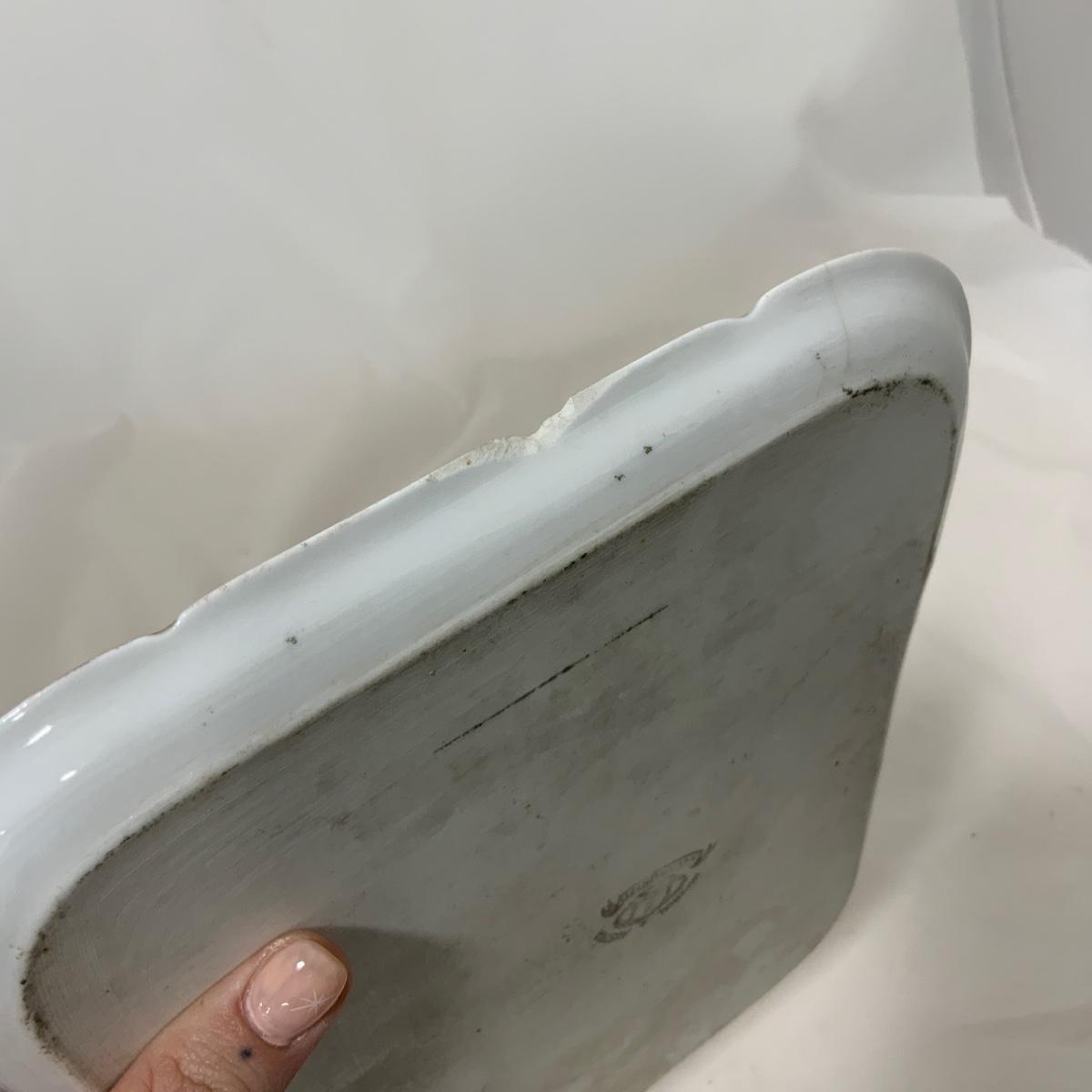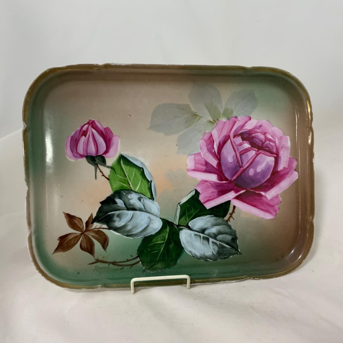 Beautiful Hand Painted Roses atop a rectangular tray. Produced in Austria, circa 1890. Tray does have one chip on the lower edge. This was likely caused by a plate hanger. It does not affect the overall appearance of the tray. Tray comes with a plate hanger, not pictured. Please see photos for details and condition. ::: Shipping is available on this lot. If you require shipping you must let us know at the close of the auction. We will coordinate with you after the item has been won. Shipping fees will include insurance up to or exceeding the value of all items being mailed. If you have any questions regarding this lot please contact the auctioneer either via this website, by direct email or by phone. PICK UP TIMES and other important information can be found in the TERMS and DESCRIPTION of the auction. Please take a look for pertinent information. Thanks!