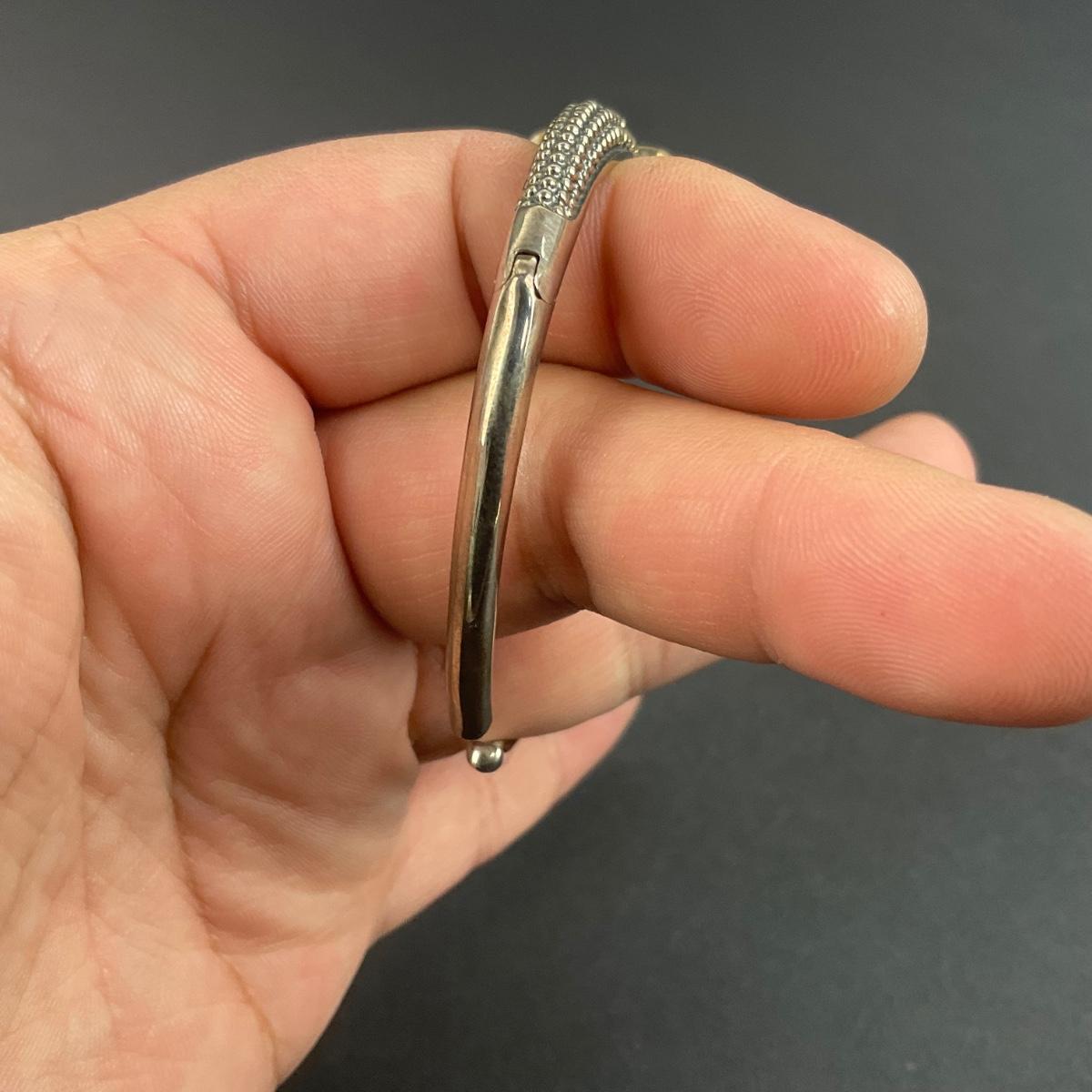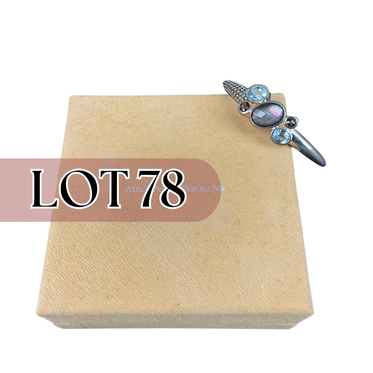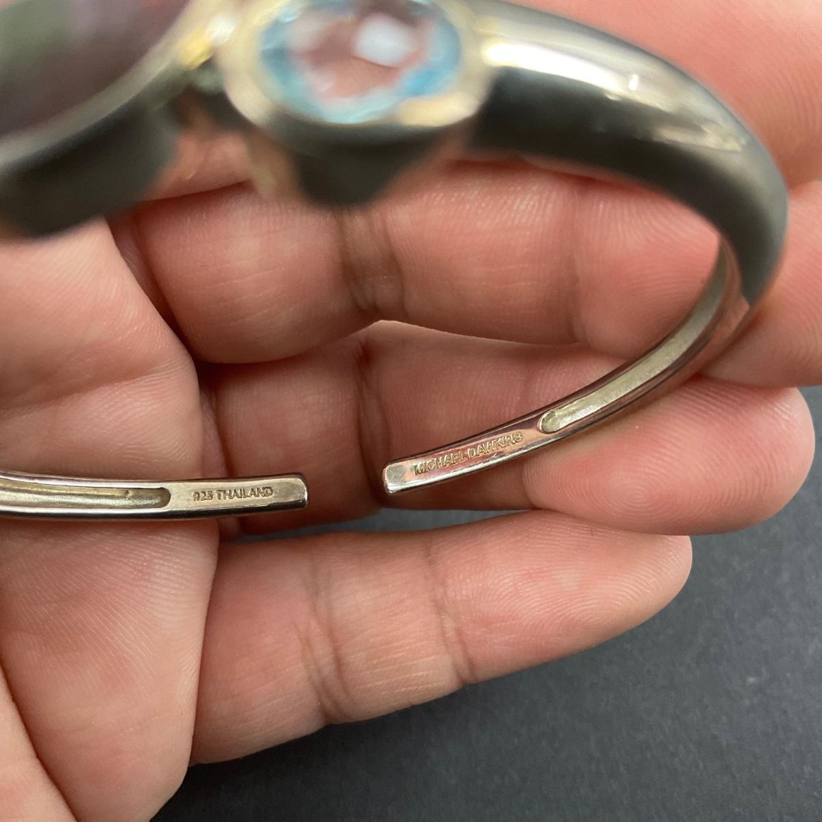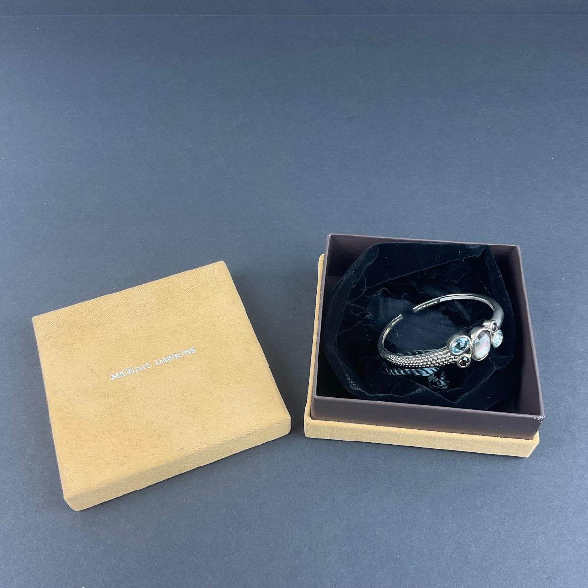 One new with box Michael Dawkins Thailand 925 marked bracelet with stones. This pieces total weight with stones is 21 grams. Please see photos for details and condition. Any condition statement is given as a courtesy to a client, is an opinion, and should not be treated as a statement of fact. Reference to condition written, oral or within a condition report shall not be regarded as a full account of condition and may not include all defects, alterations, or restorations. Absence of a condition report does not imply a lot is flawless or lacking imperfections or damage. Katherine’s Auction & Appraisal Service shall have no responsibility for any error or omission. Returns shall not be accepted on the basis of condition. ::: Shipping is available on this lot. If you require shipping you must let us know at the close of the auction. We will coordinate with you after the item has been won. Shipping fees will include insurance up to or exceeding the value of all items being mailed. If you have any questions regarding this lot please contact the auctioneer either via this website, by direct email or by phone. PICK UP TIMES and other important information can be found in the TERMS and DESCRIPTION of the auction. Please take a look for pertinent information. Thanks!