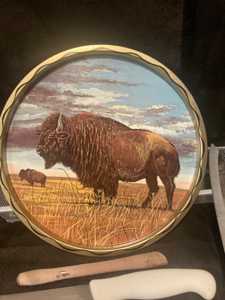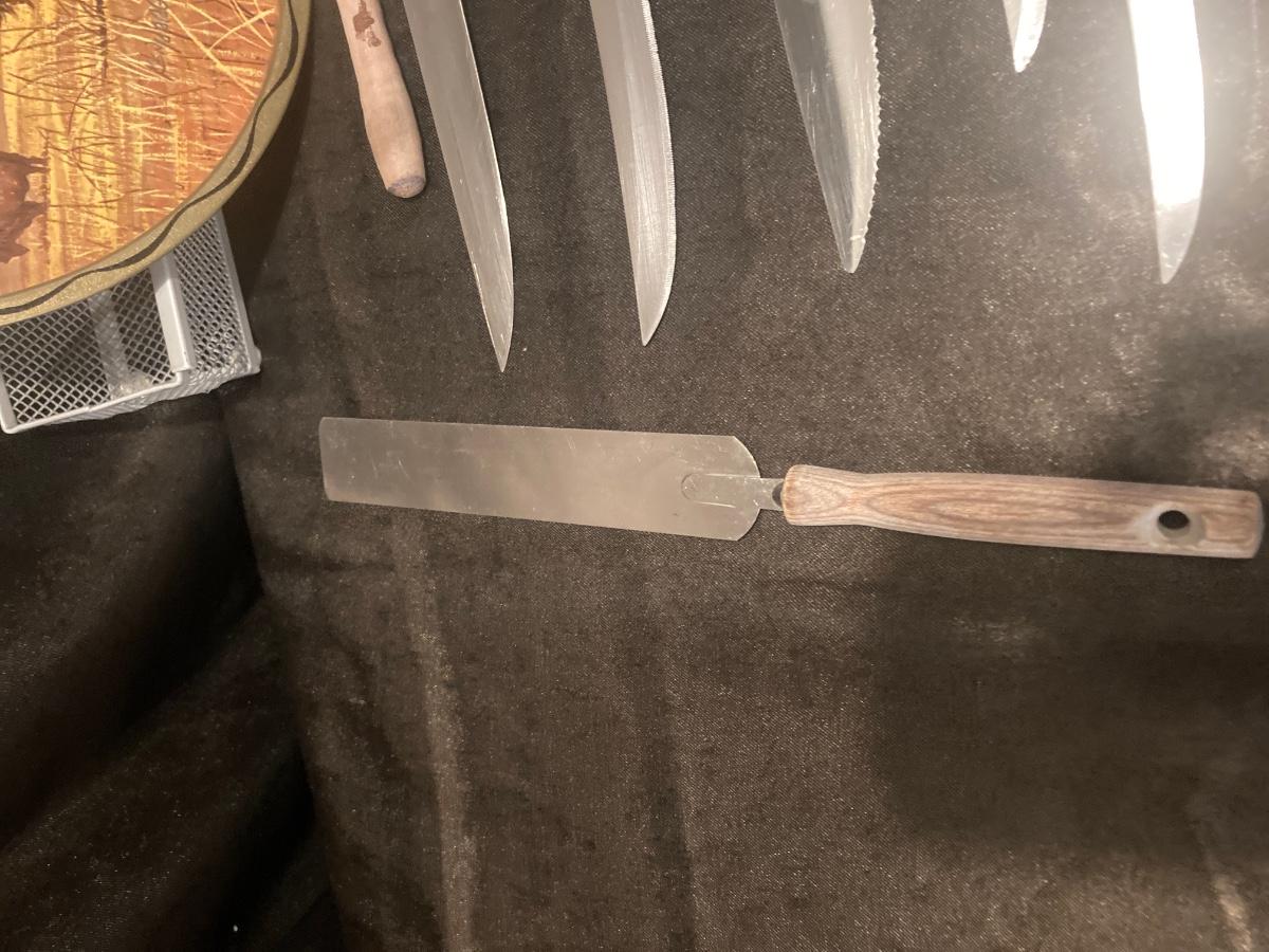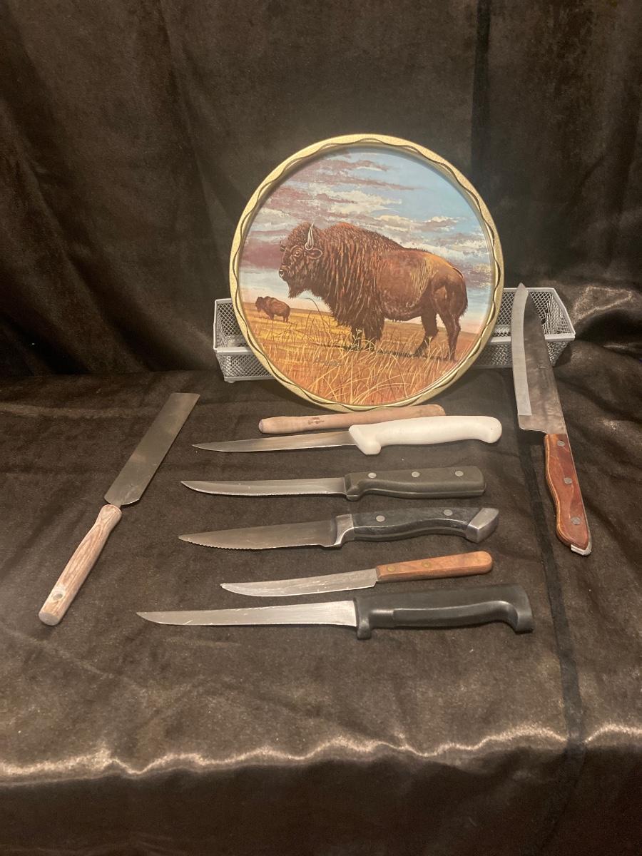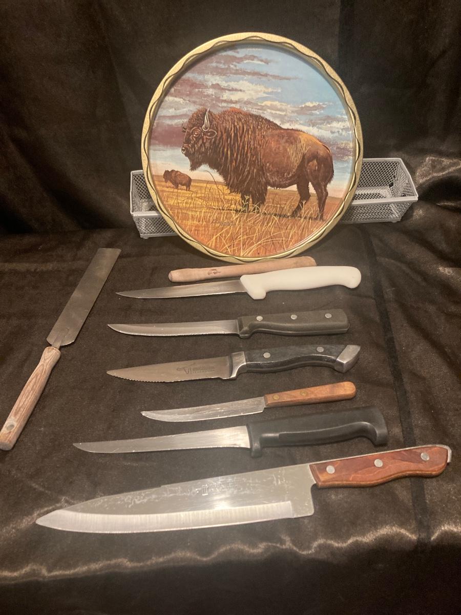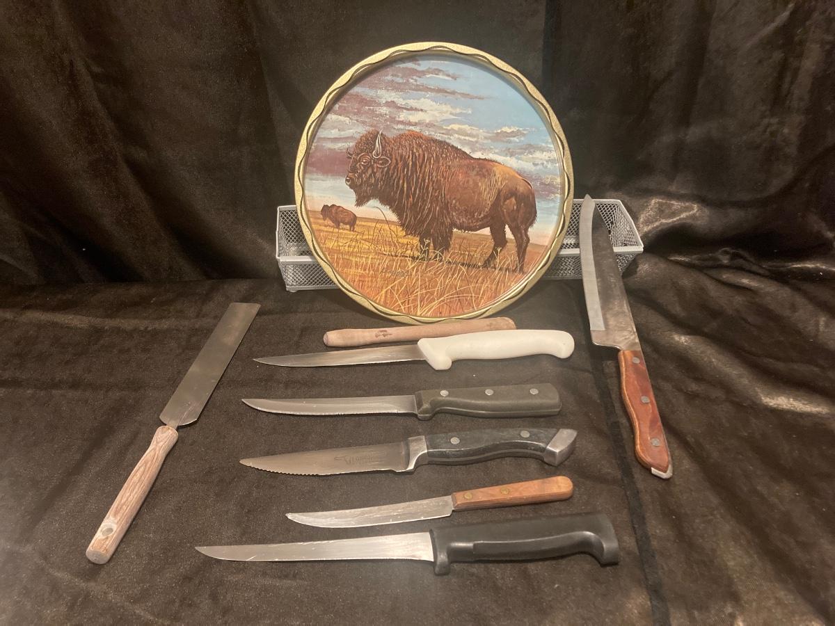 VINTAGE BUFFALO 🦆¬ TIN TRAY AND AN ASSORTMENT OF KNIVES