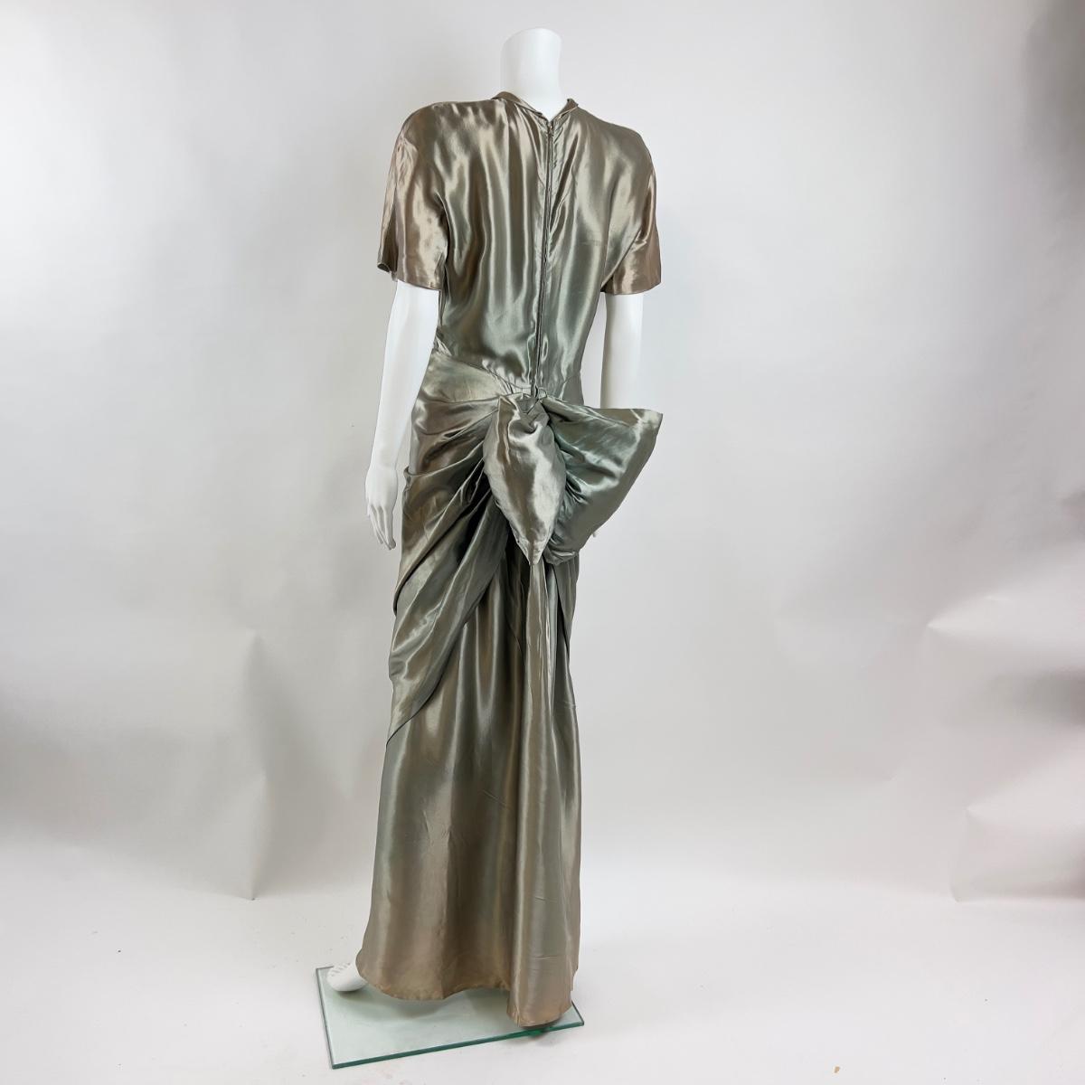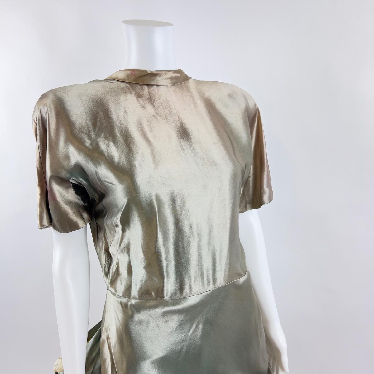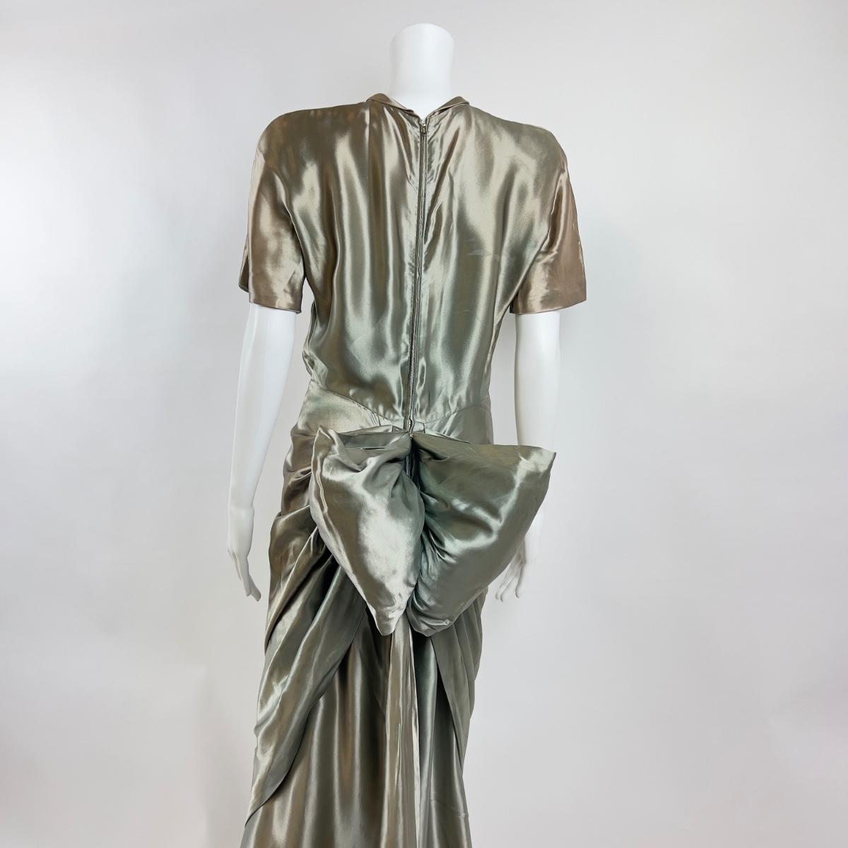 Dress is shades of green with a metallic sheen, the bow at the lower back is 3D, measures: