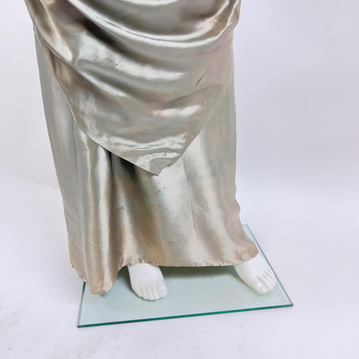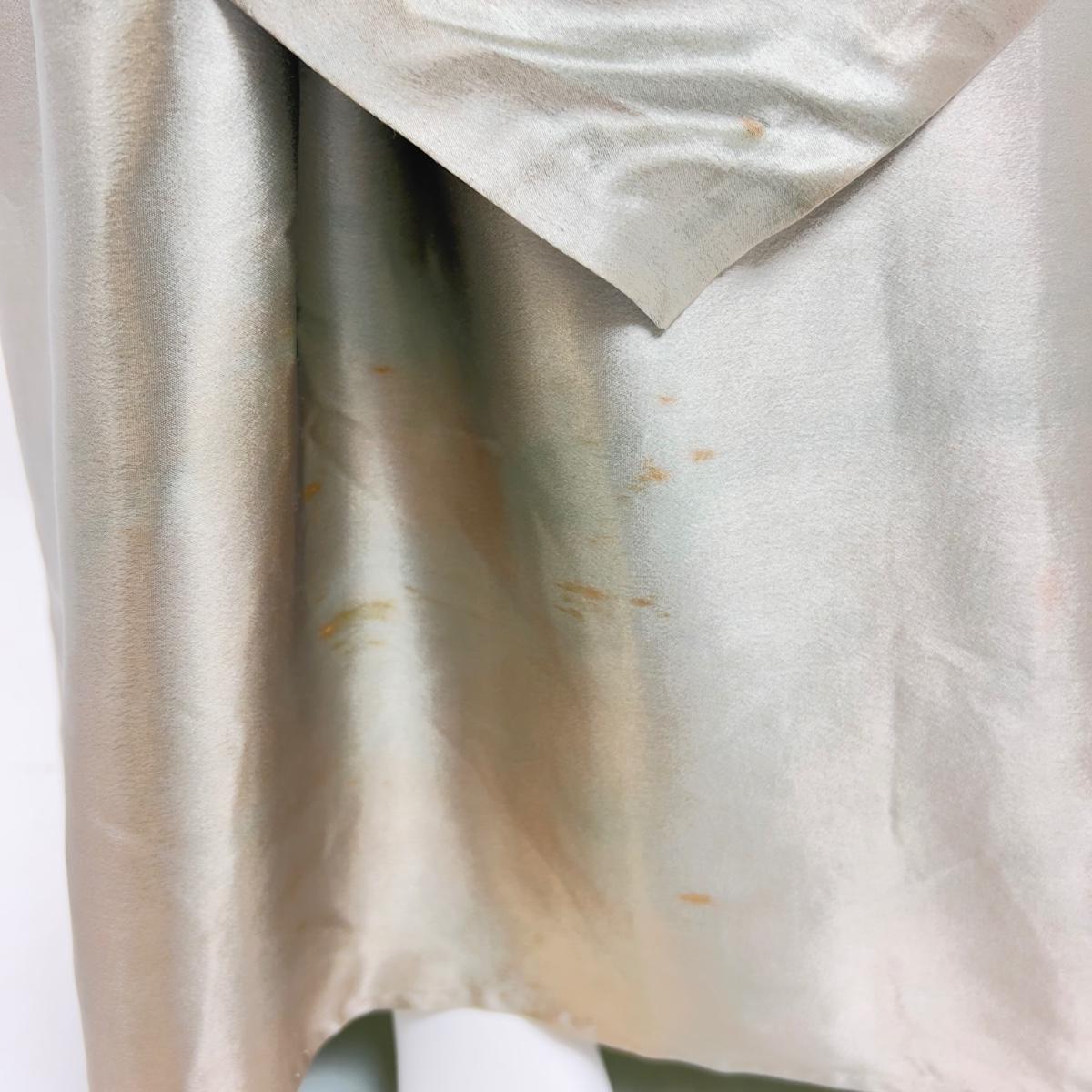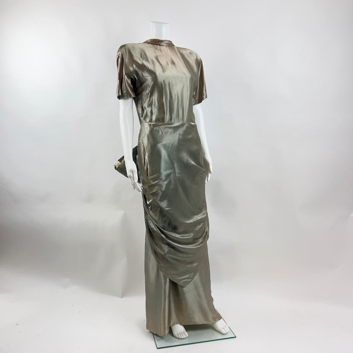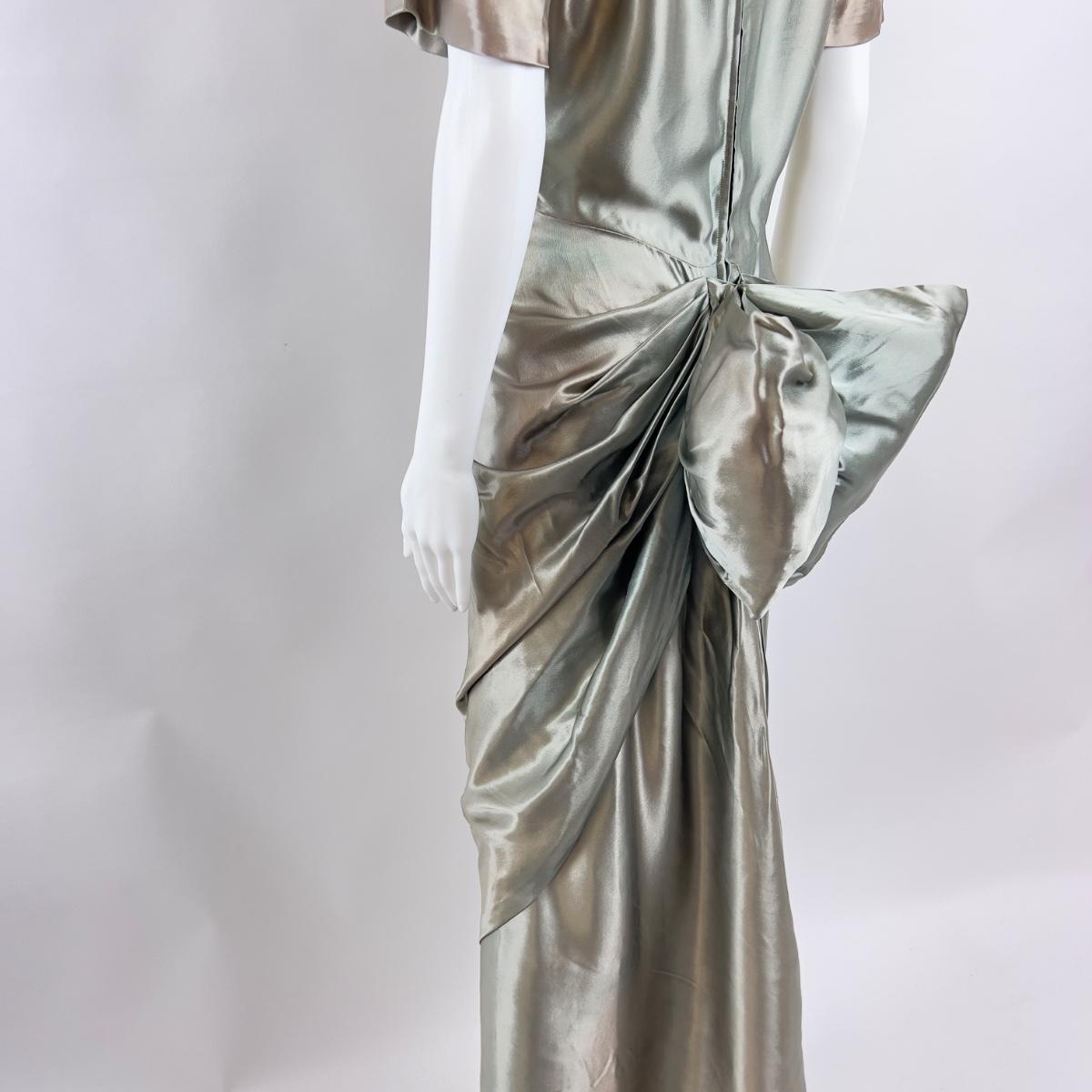 Dress is shades of green with a metallic sheen, the bow at the lower back is 3D, measures: