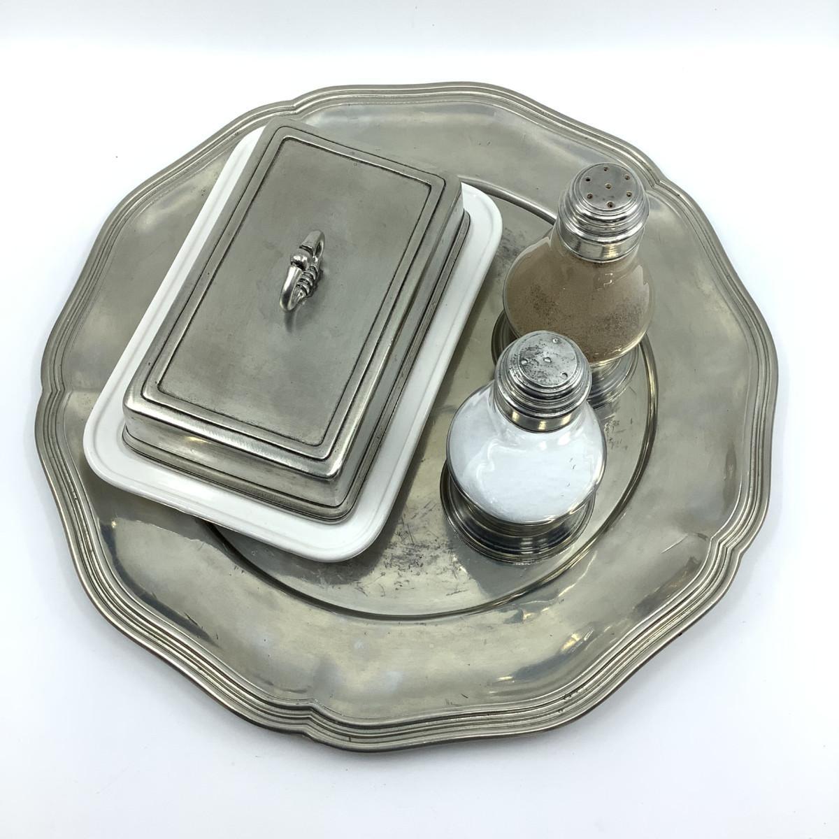 782 Pierre Deux Pewter Plate, Salt & Pepper, and Butter Disk by Arte Italica