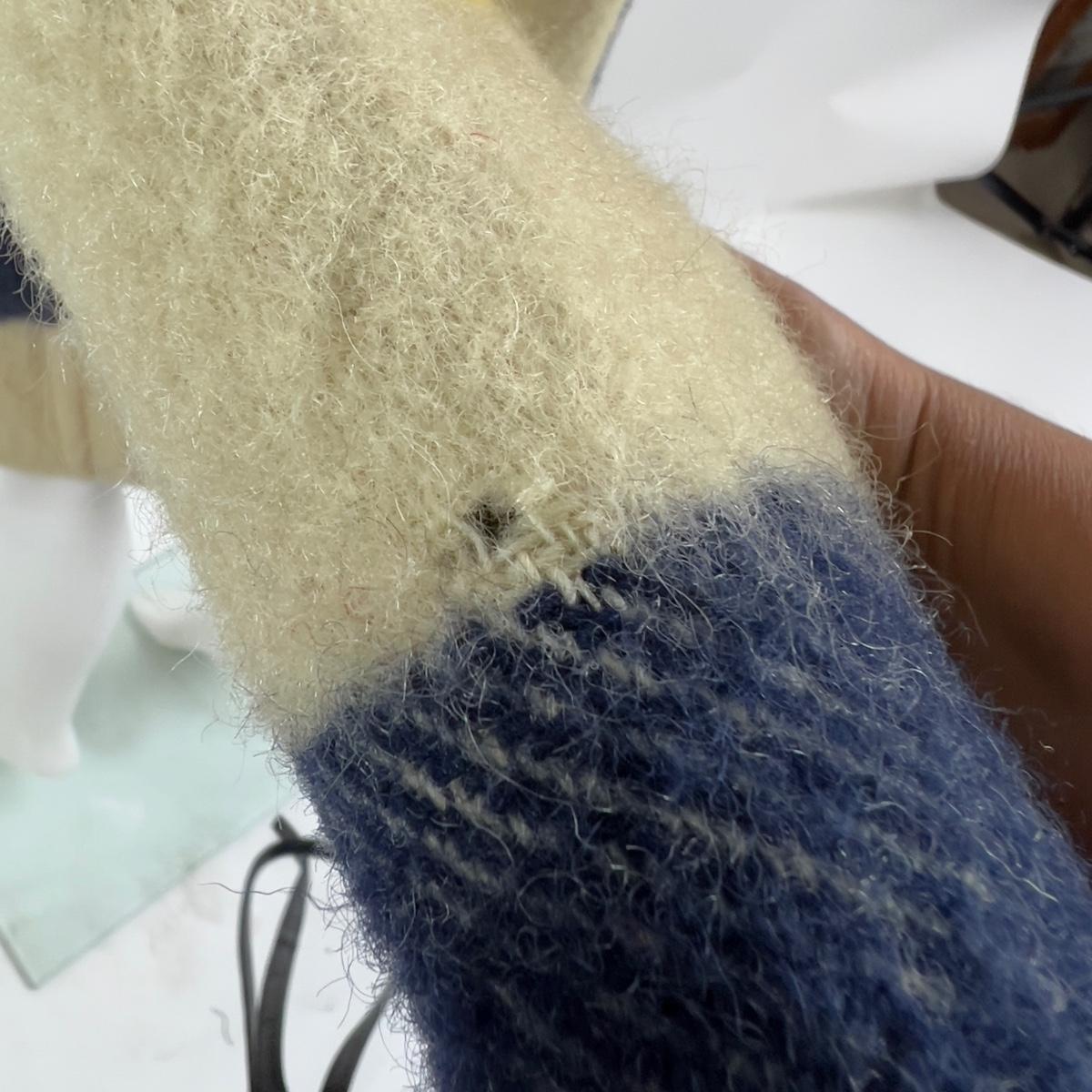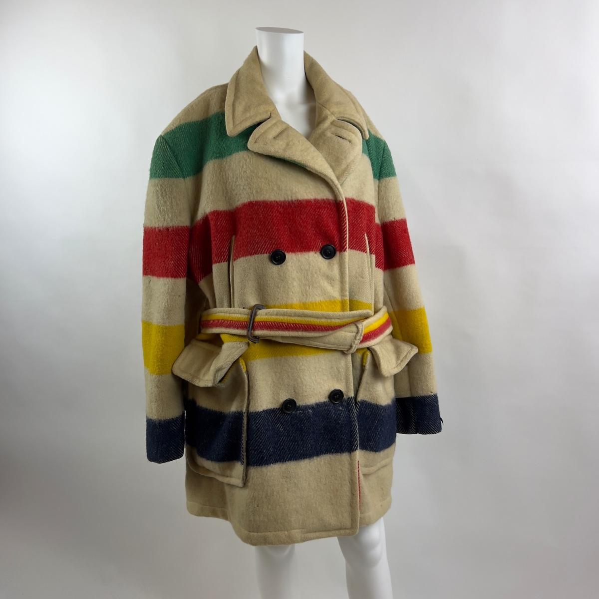 Coat is wool, constructed from a point blanket, there are areas of moth damage which has created tiny holes. Men's coat with belt, measures 21.5" from armpit to armpit, 37" overall length, 25" sleeve length.