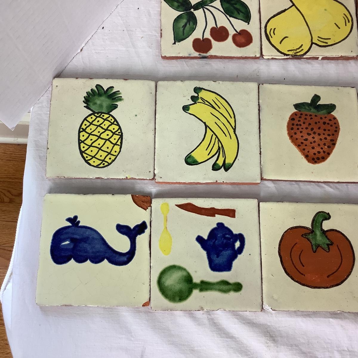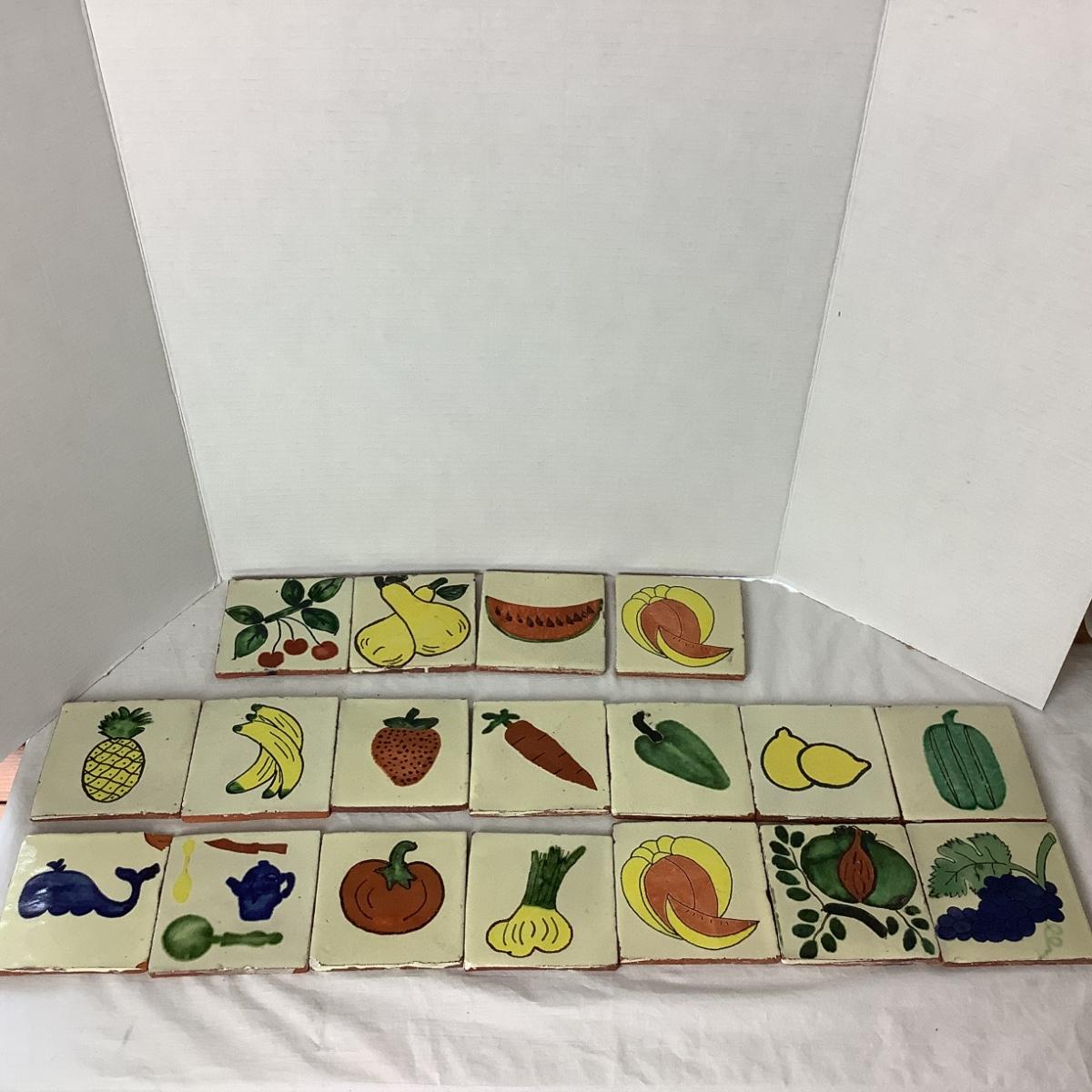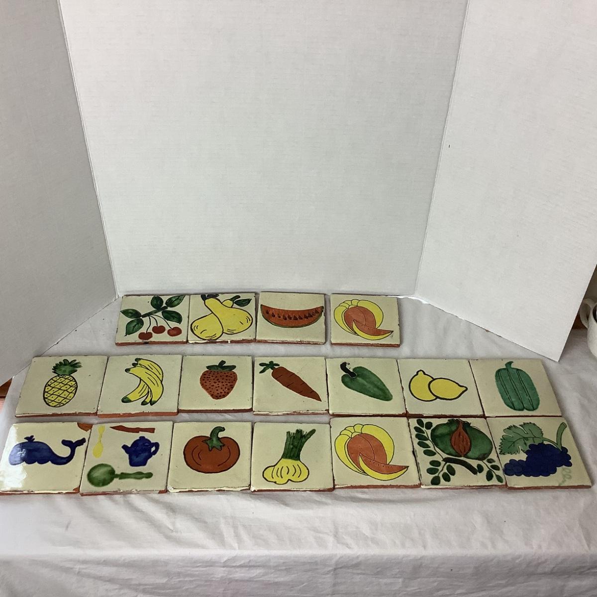 There are 18 Square Hand painted Vegetable Tiles Terra Cotta Tiles that are 4” square.