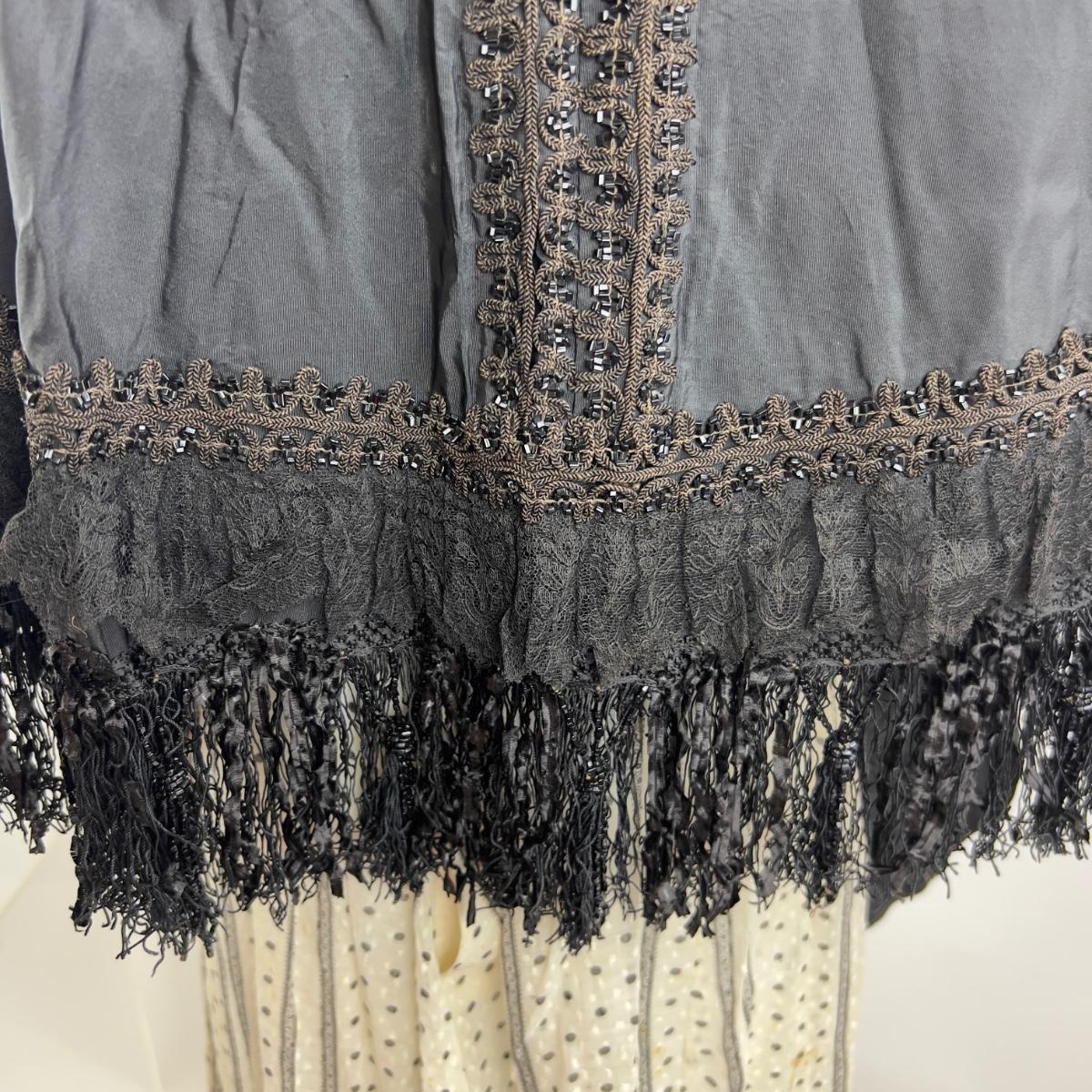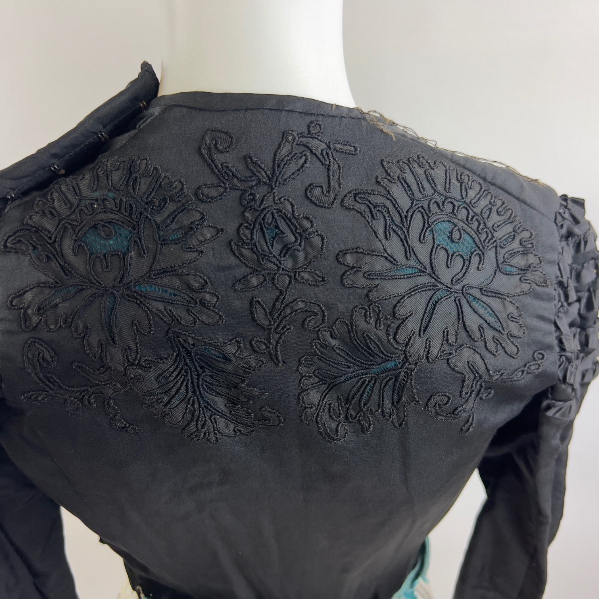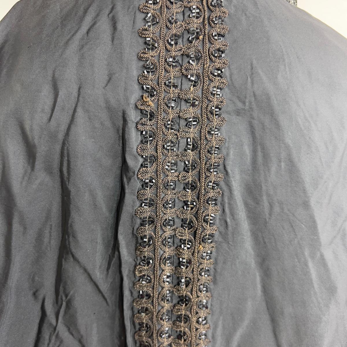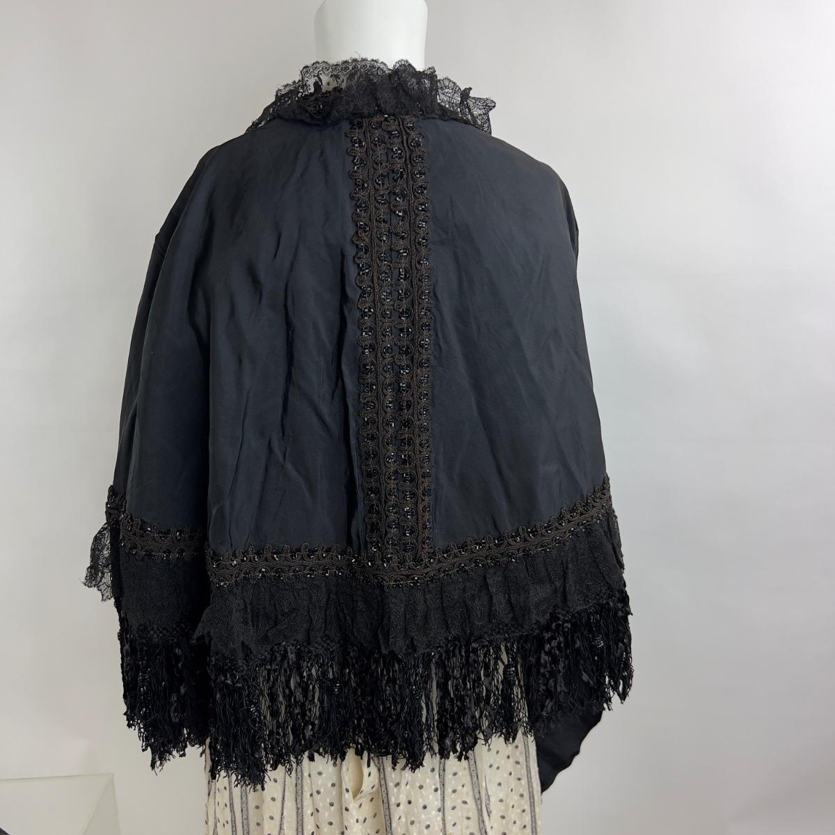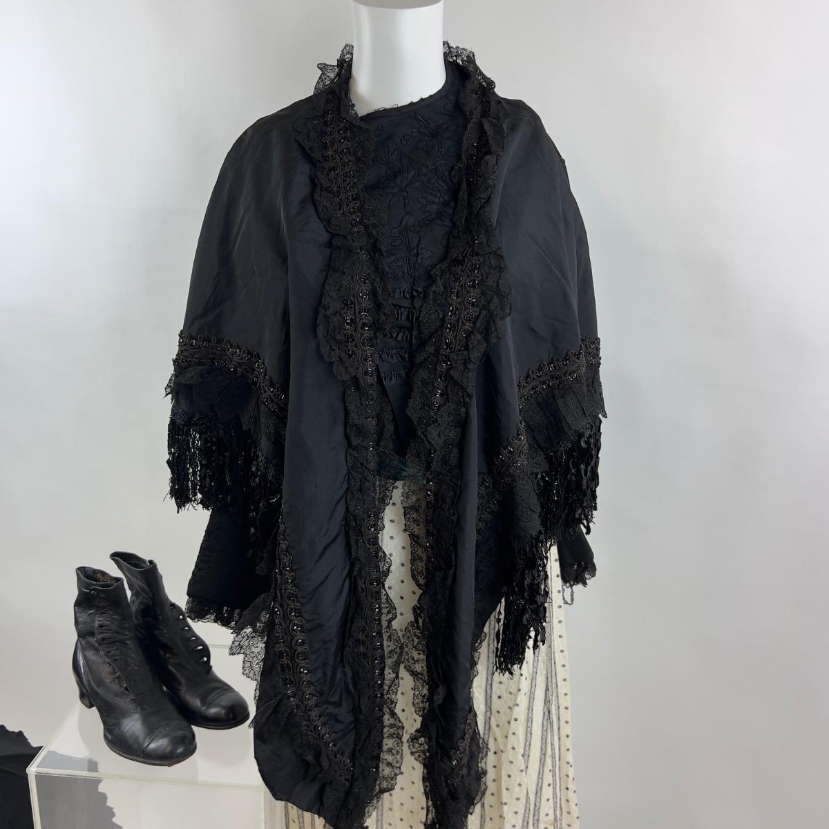The outfit consists of skirt, top, cape, boots and parasol. The shoes are leather and made by N. Hess & Sons Baltimore Md and are size 6. The skirt measures 12" from hip to hip when flat, 40" overall length. The top measures 15" from armpit to armpit16" overall length, sleeve length is 22".