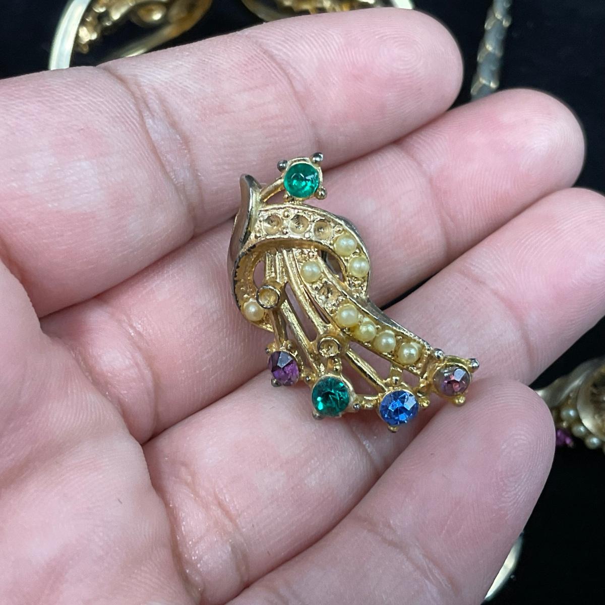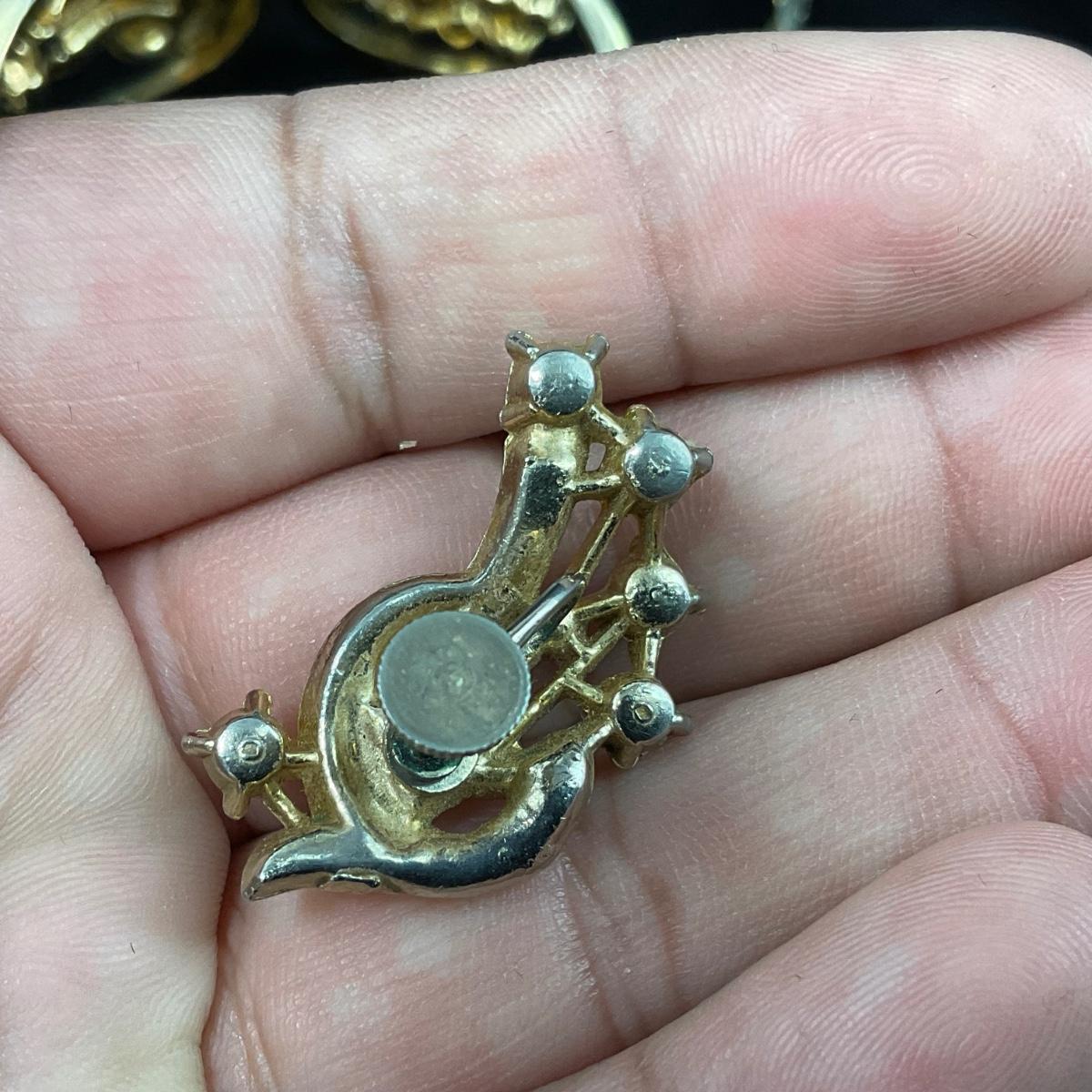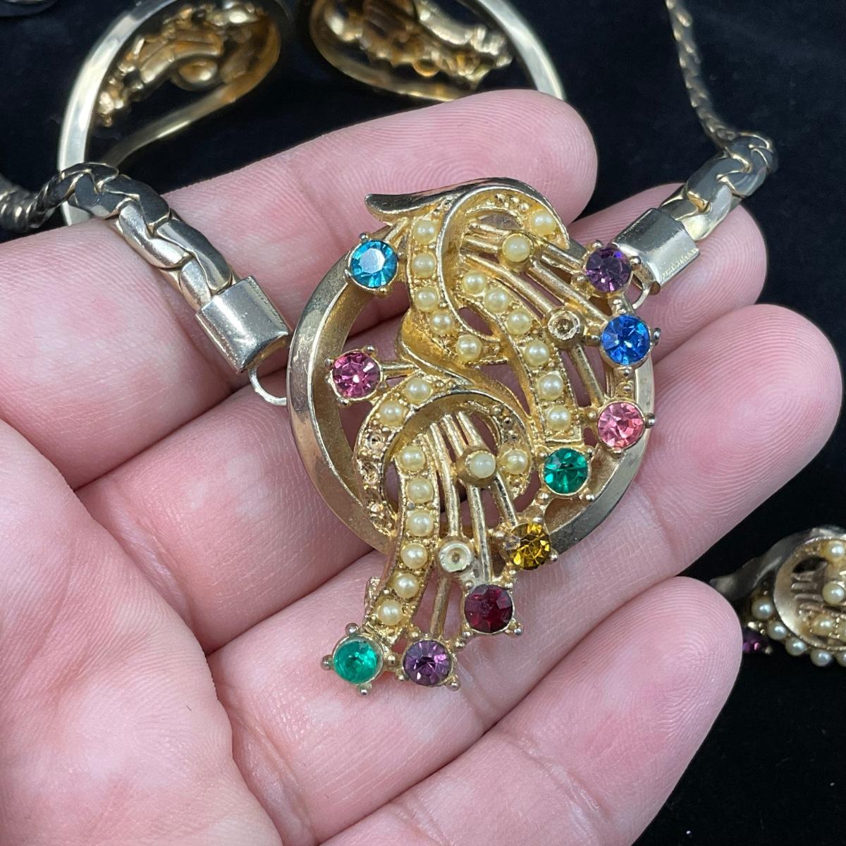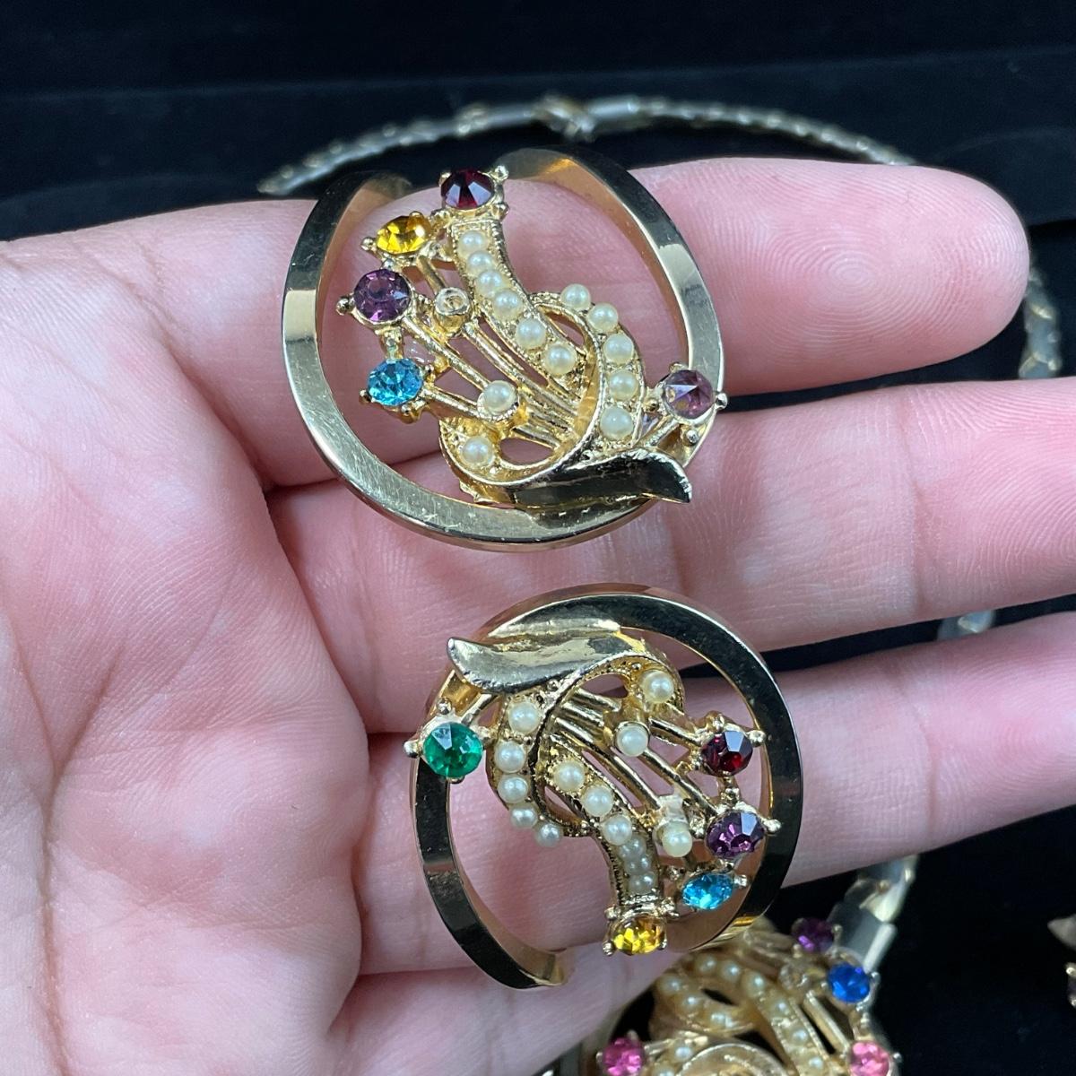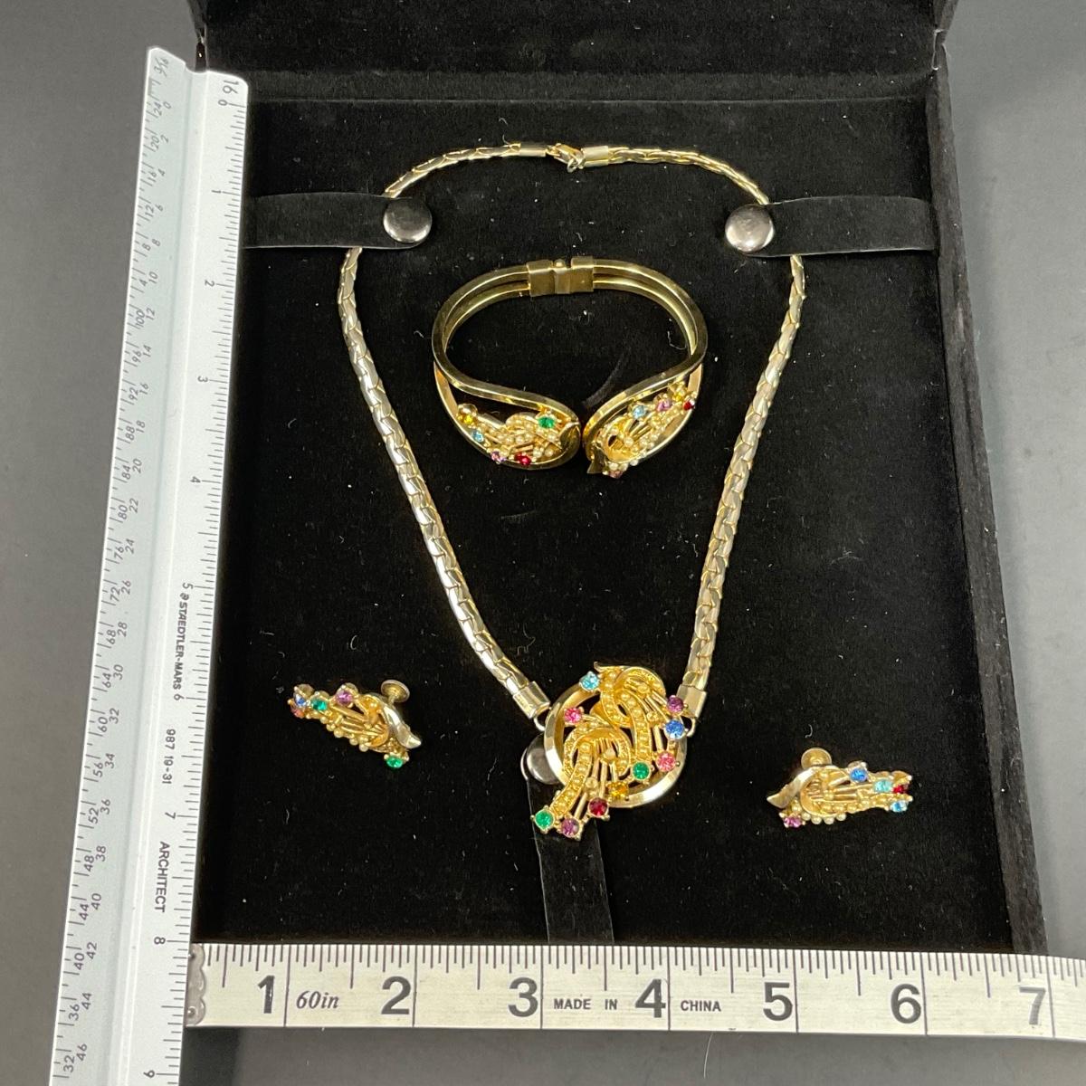 One vintage Oleg Cassini choker 24kg plated set in box includes one vintage bracelet, one pair of post earrings, and one necklace. This piece does have some scuffs, scratches, marks, or slight damage, but otherwise appears to be in great shape. Please see photos for details and condition. Any condition statement is given as a courtesy to a client, is an opinion, and should not be treated as a statement of fact. Reference to condition written, oral or within a condition report shall not be regarded as a full account of condition and may not include all defects, alterations, or restorations. Absence of a condition report does not imply a lot is flawless or lacking imperfections or damage. Katherine’s Auction & Appraisal Service shall have no responsibility for any error or omission. Returns shall not be accepted on the basis of condition. ::: Shipping is available on this lot. If you require shipping you must let us know at the close of the auction. We will coordinate with you after the item has been won. Shipping fees will include insurance up to or exceeding the value of all items being mailed. If you have any questions regarding this lot please contact the auctioneer either via this website, by direct email or by phone. PICK UP TIMES and other important information can be found in the TERMS and DESCRIPTION of the auction. Please take a look for pertinent information. Thanks!