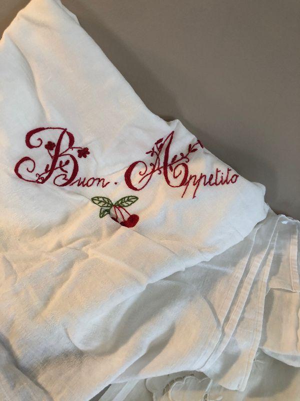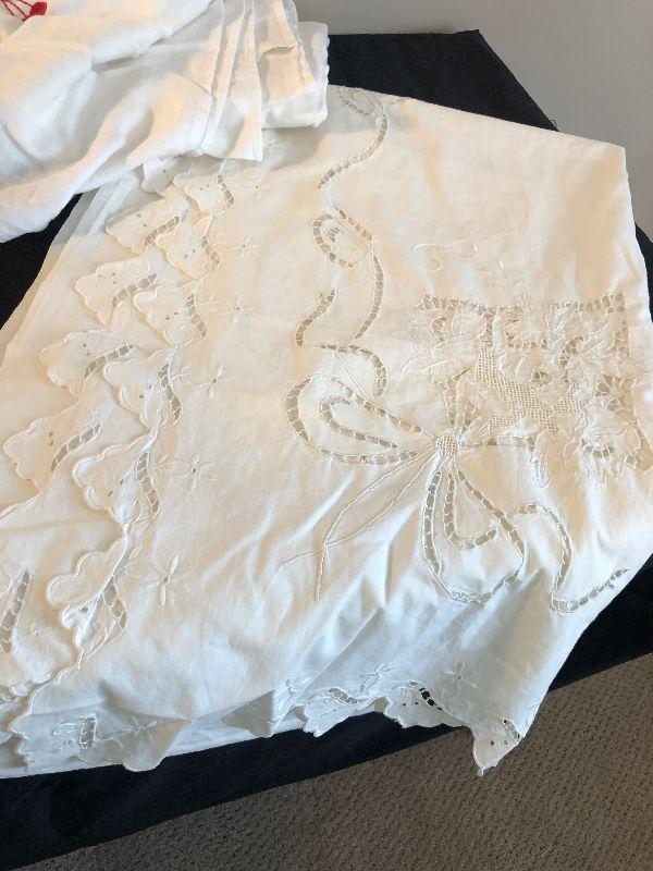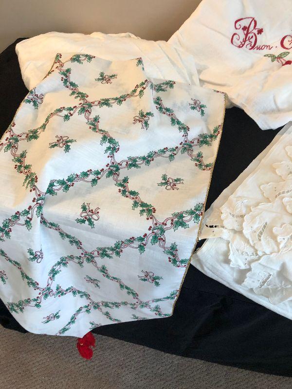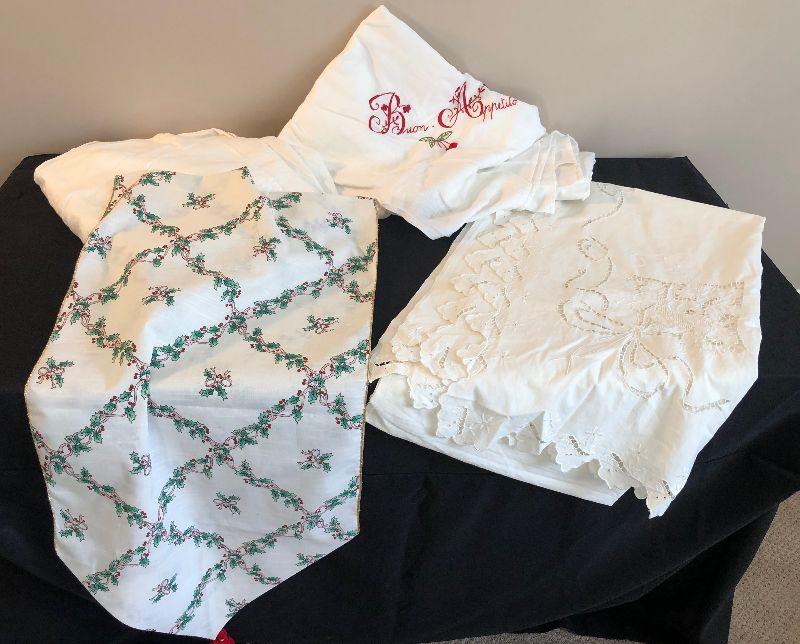 Runner (1), table Clothes (3)  Plus Bonus of Napkins. This is an ONSITE Auction all items will need to be picked up on location. Please see auction description for pick up procedures. Shipping is available on smaller items.