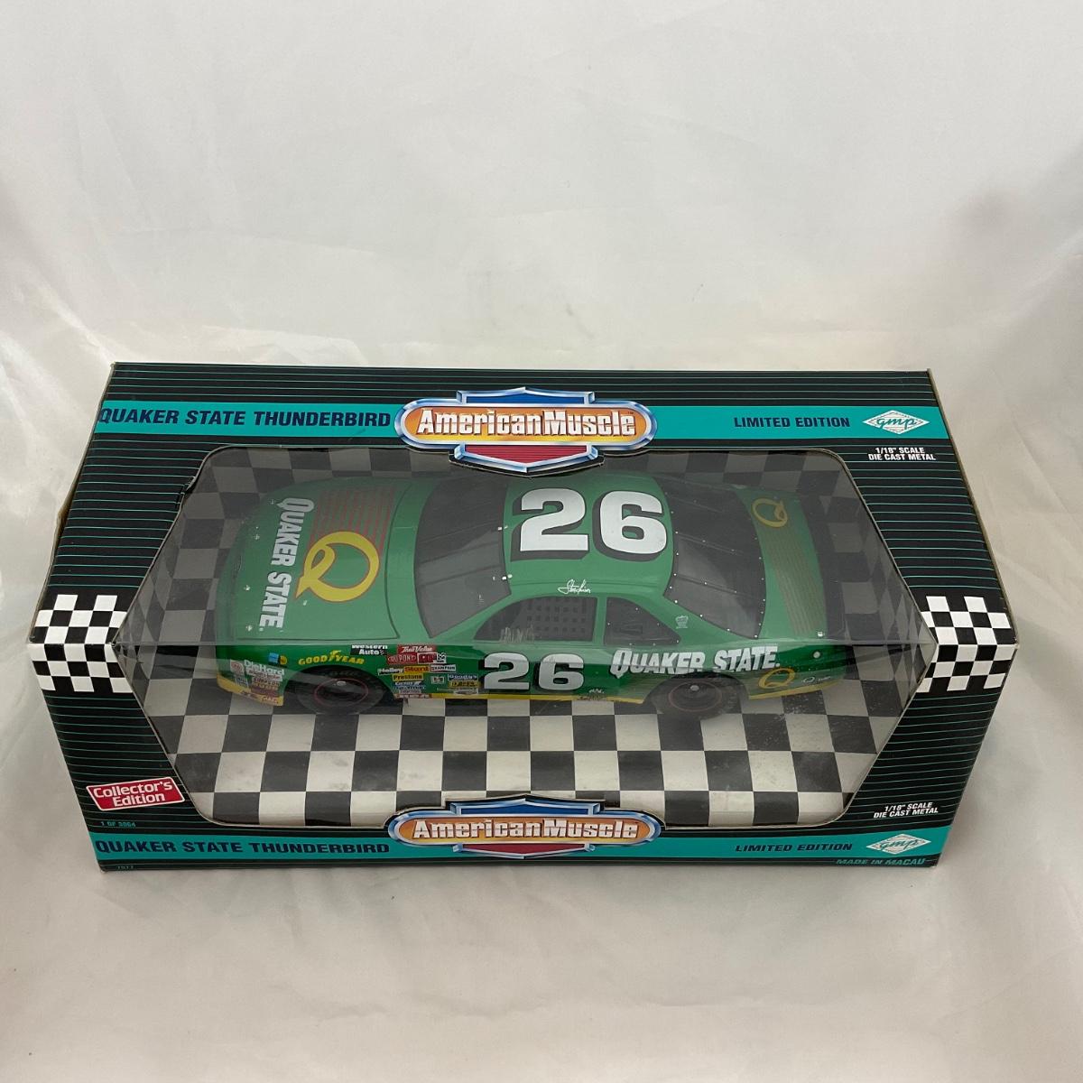 One NASCAR die cast 1:18 scale Quaker State Thunderbird in box. Please see photos for details and condition. ::: Shipping is available on this lot. If you require shipping you must let us know at the close of the auction. We will coordinate with you after the item has been won. Shipping fees will include insurance up to or exceeding the value of all items being mailed. If you have any questions regarding this lot please contact the auctioneer either via this website, by direct email or by phone. PICK UP TIMES and other important information can be found in the TERMS and DESCRIPTION of the auction. Please take a look for pertinent information. Thanks!