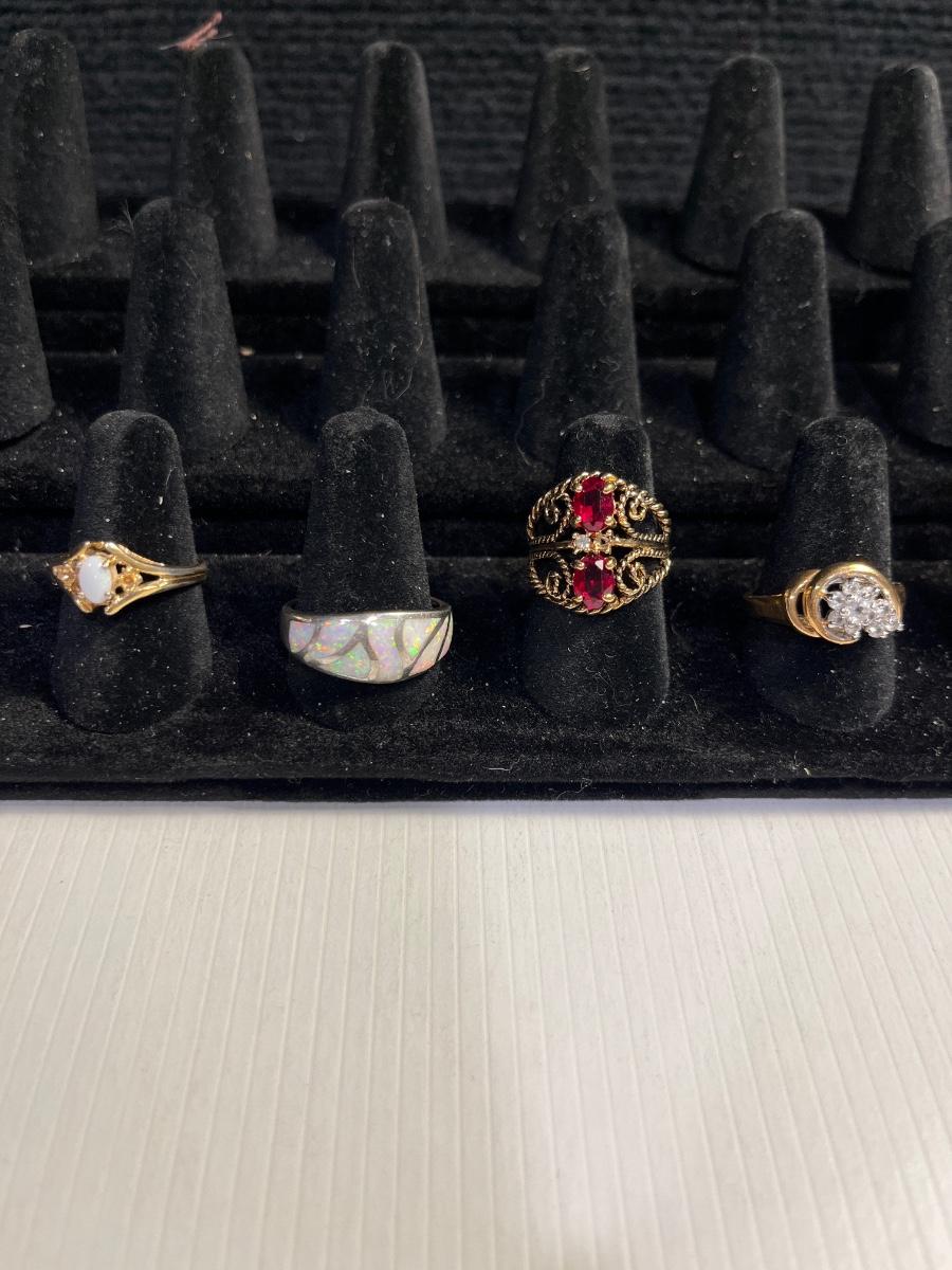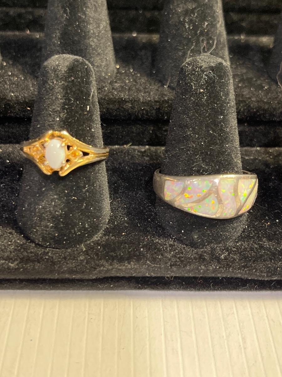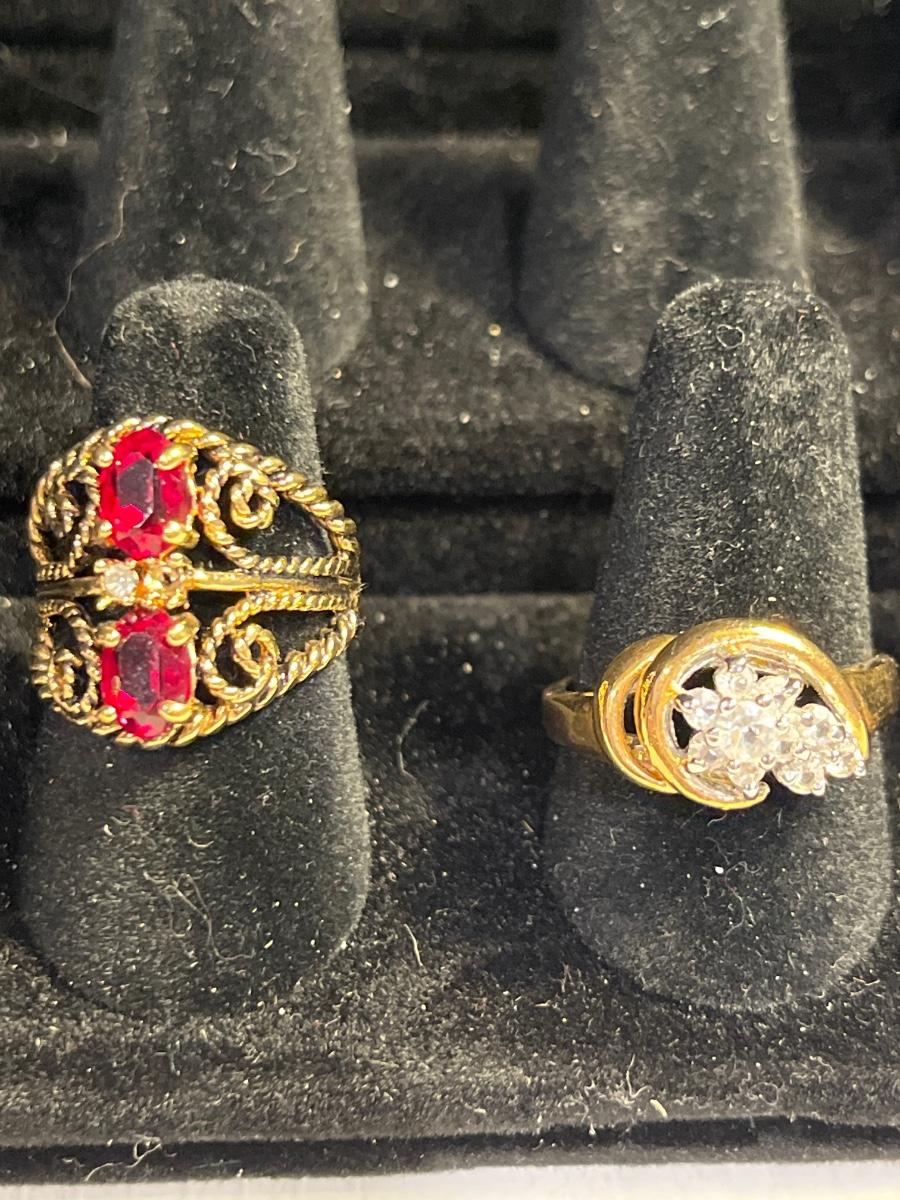 18K GE gold/red stone ring, 14KGE gold/CZ ring, silver tone opal, & gold/white stone