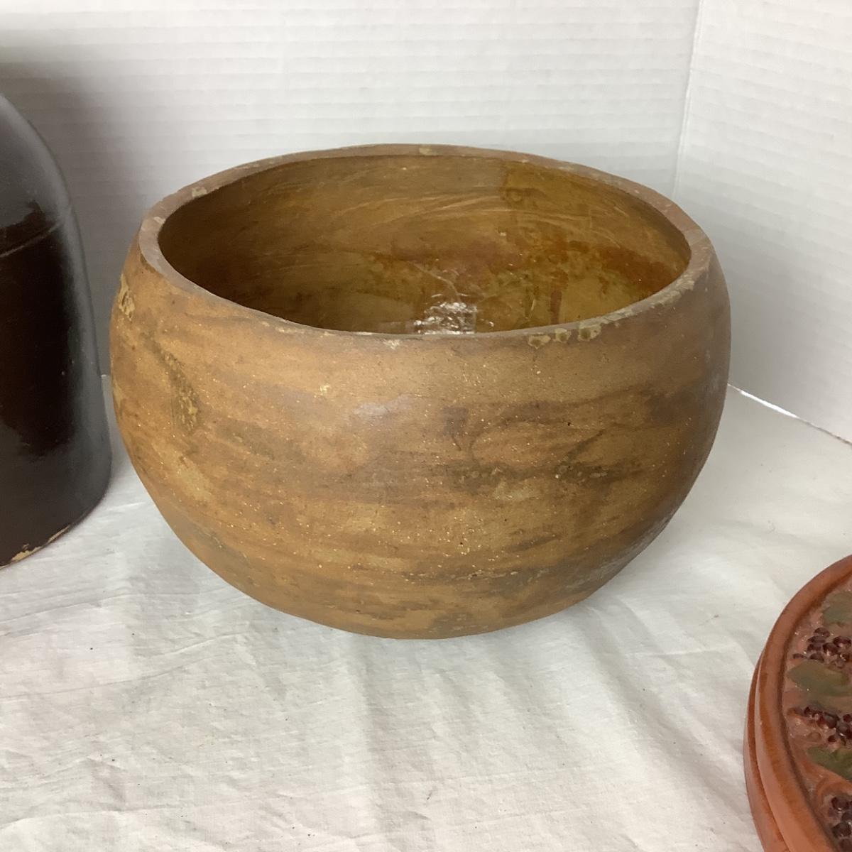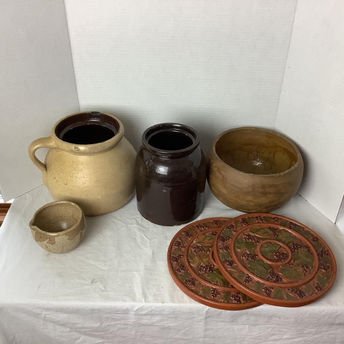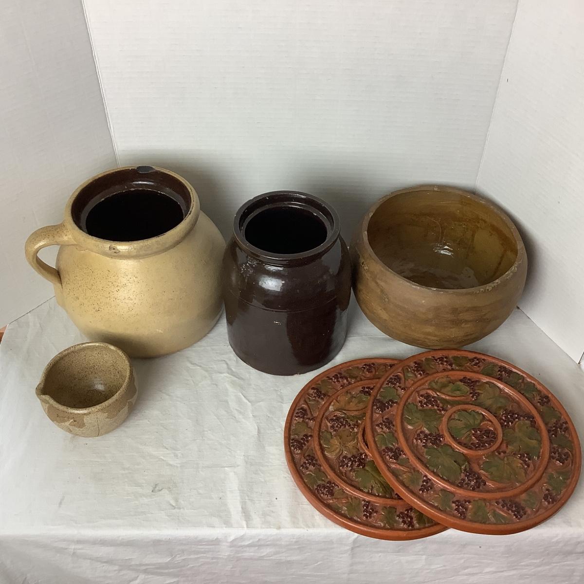 790 Pair of Terra Cotta Warming Plates and Various Crocks