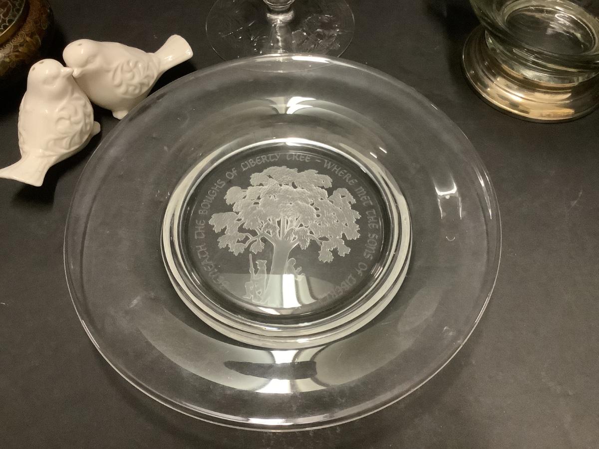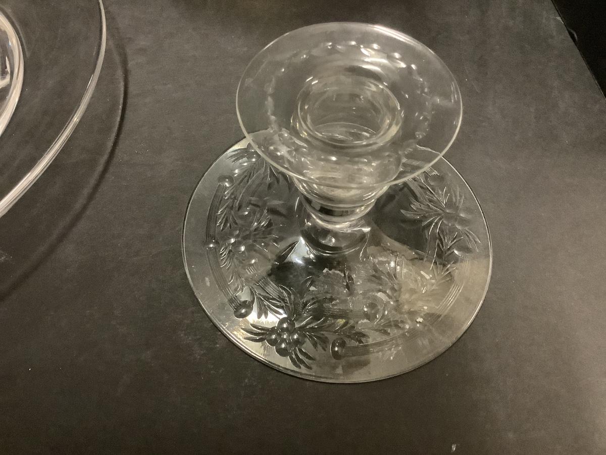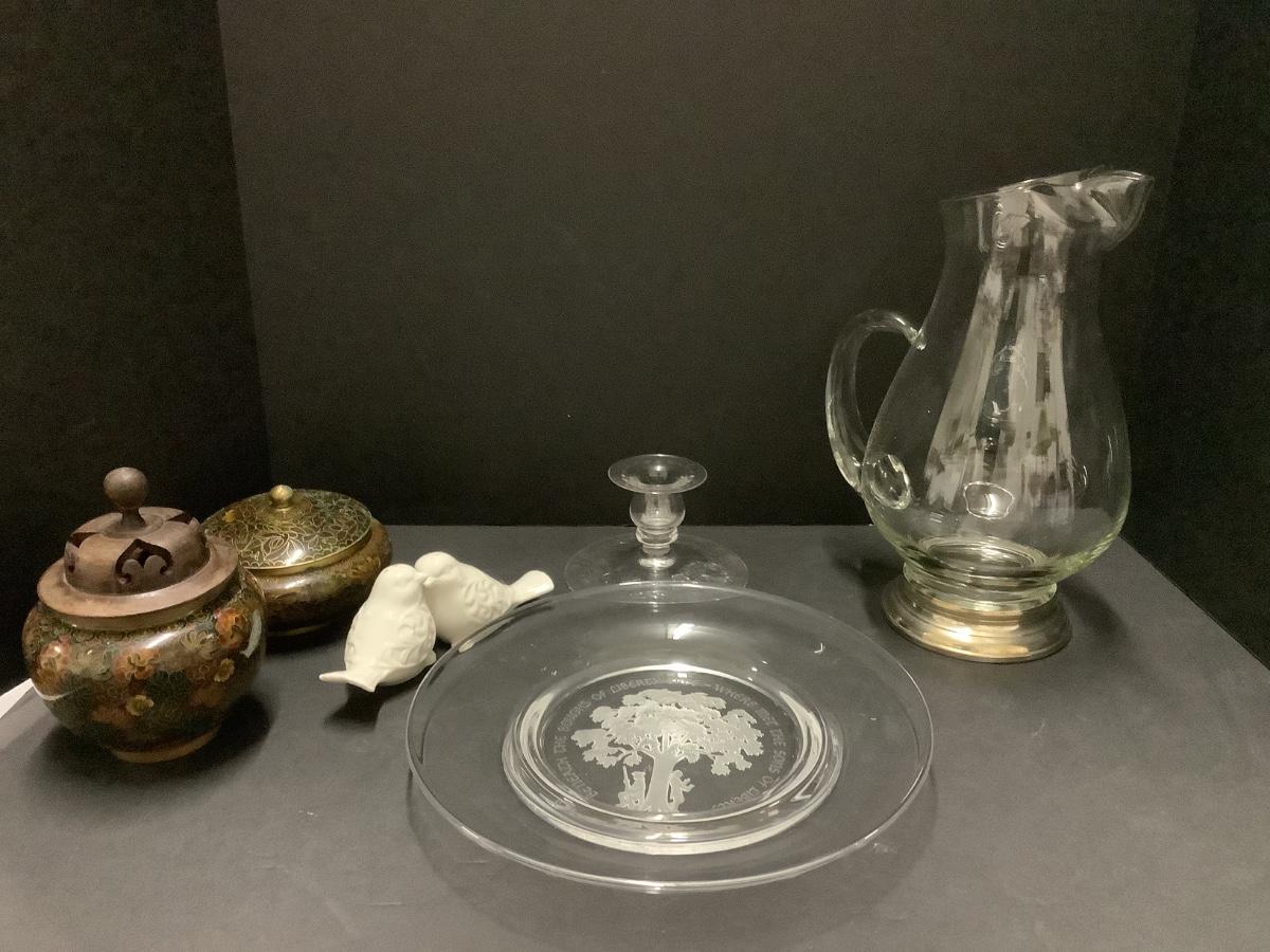 Salt and pepper shakers, Orrefors plate, webb crystal candlesticks, cloisonné covered bowls
