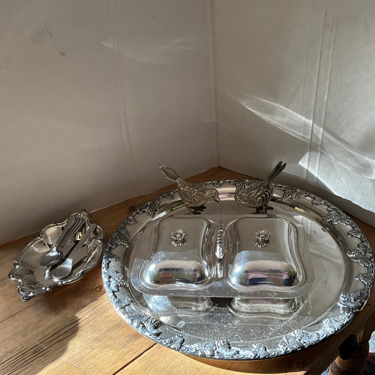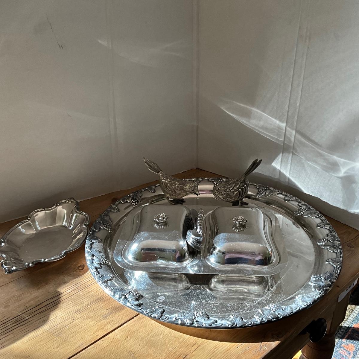 Pair of birds, double silverplate covered dish, oval dish