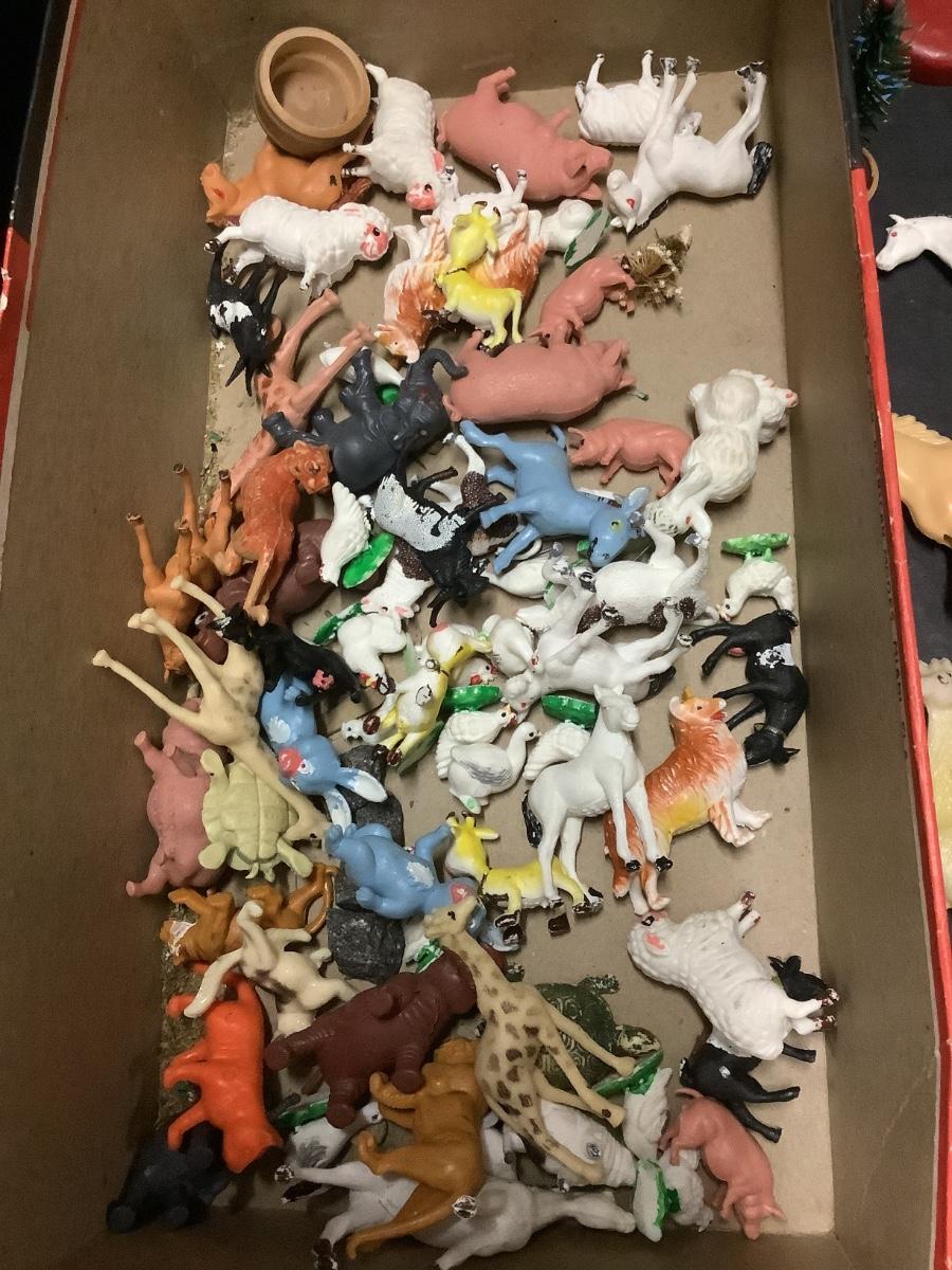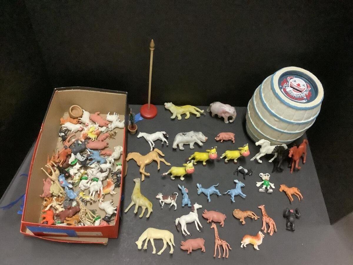 Lot of vintage plastic animals and vintage salt water taffy bank