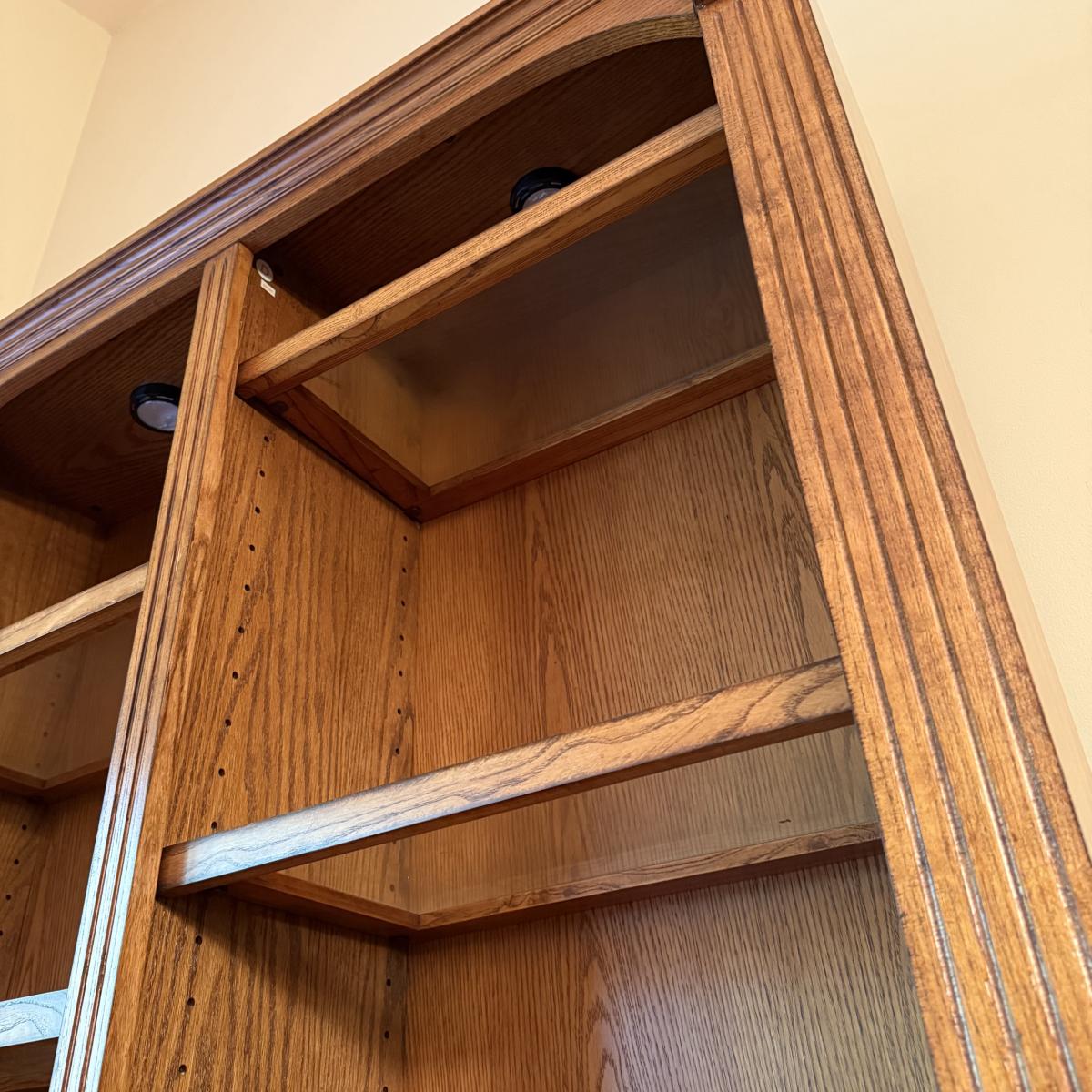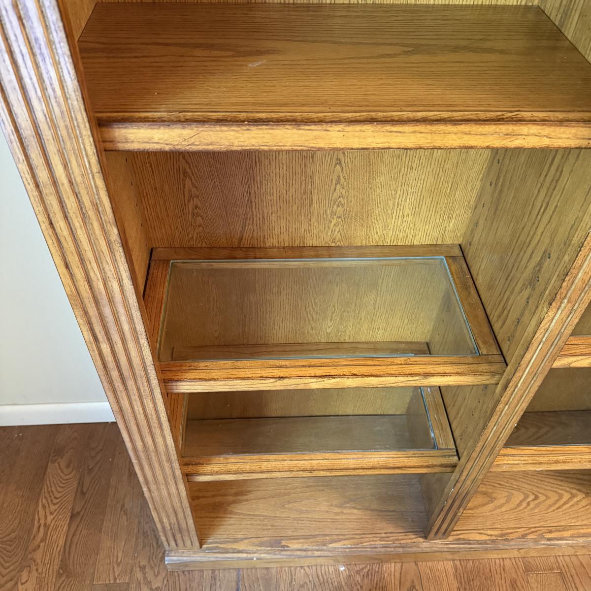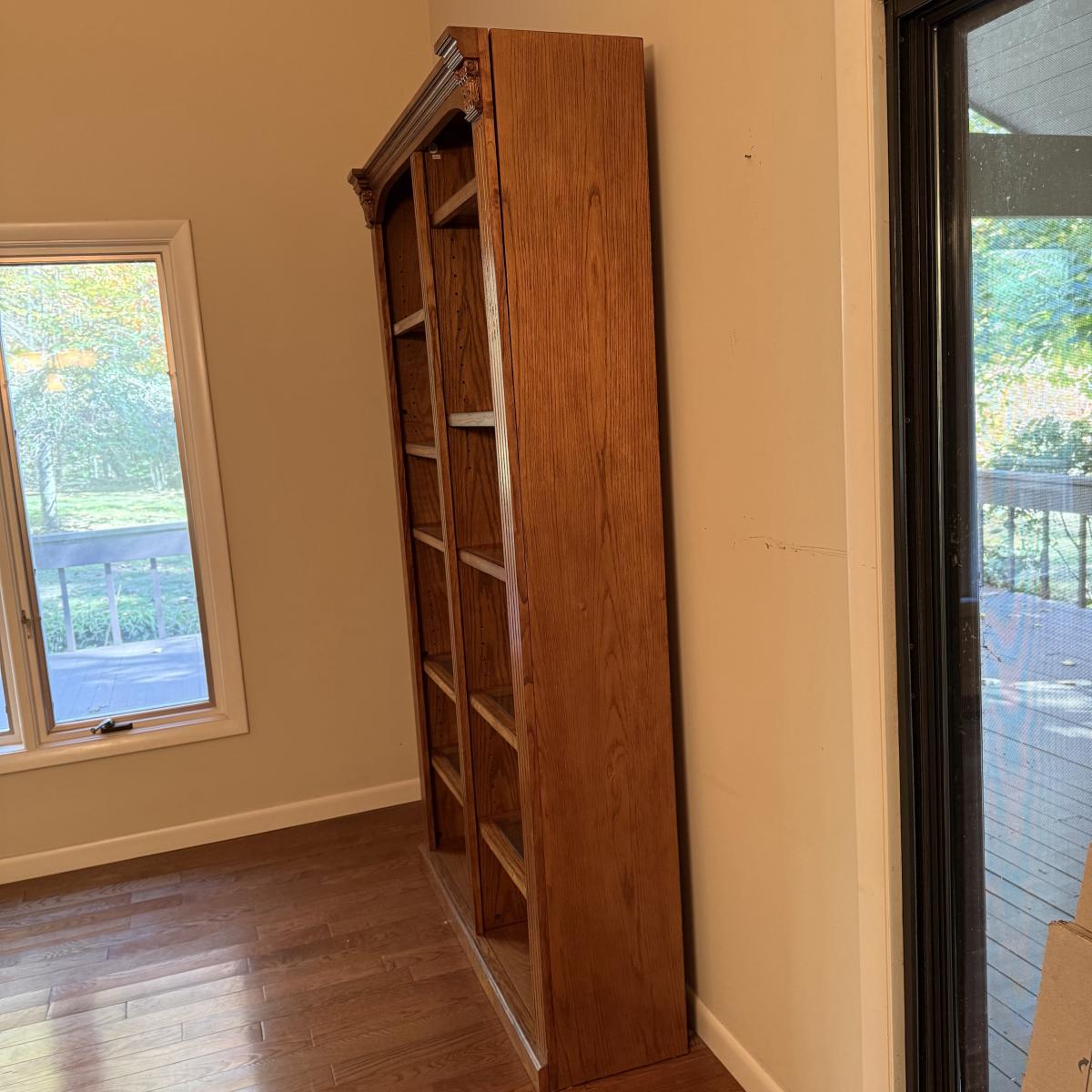 Large bookshelf measures 48” x 15” x 84”H. It has two permanent solid wood middle shelves and eight more adjustable glass/wood shelves between the left and right sides. Each top section has a light that turned on when plugged in. Shelf is one piece, it is heavy and sturdy. The top right side is separated, it appears to be an easy fix, another area on the right has a screw poking through to the front, see images. Bring help to load. Shelf is on the main level.