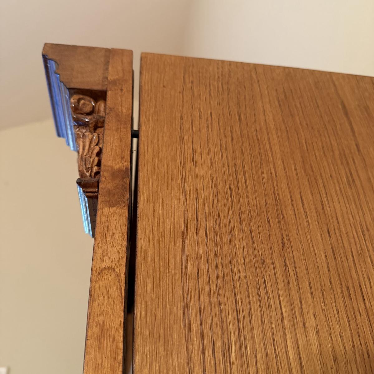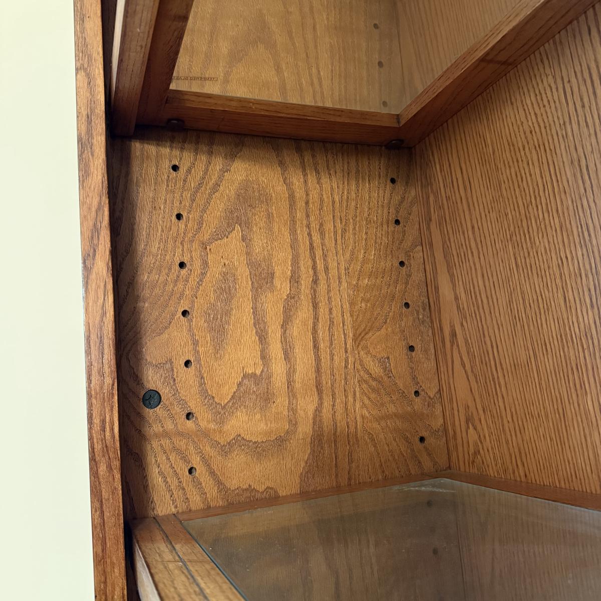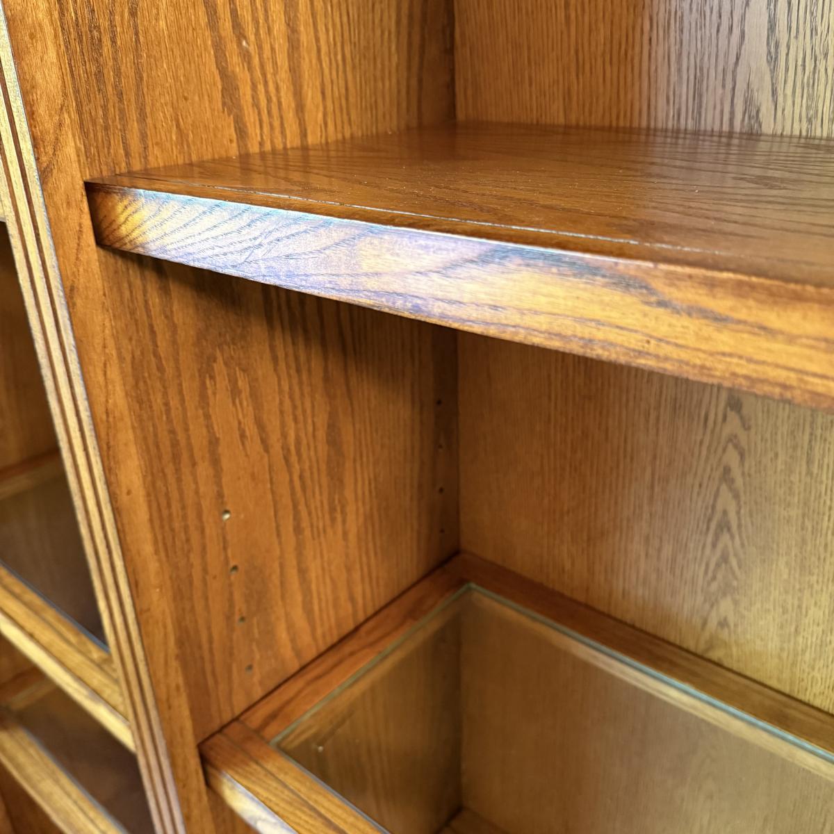 Large bookshelf measures 48” x 15” x 84”H. It has two permanent solid wood middle shelves and eight more adjustable glass/wood shelves between the left and right sides. Each top section has a light that turned on when plugged in. Shelf is one piece, it is heavy and sturdy. The top right side is separated, it appears to be an easy fix, another area on the right has a screw poking through to the front, see images. Bring help to load. Shelf is on the main level.