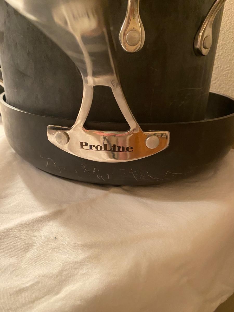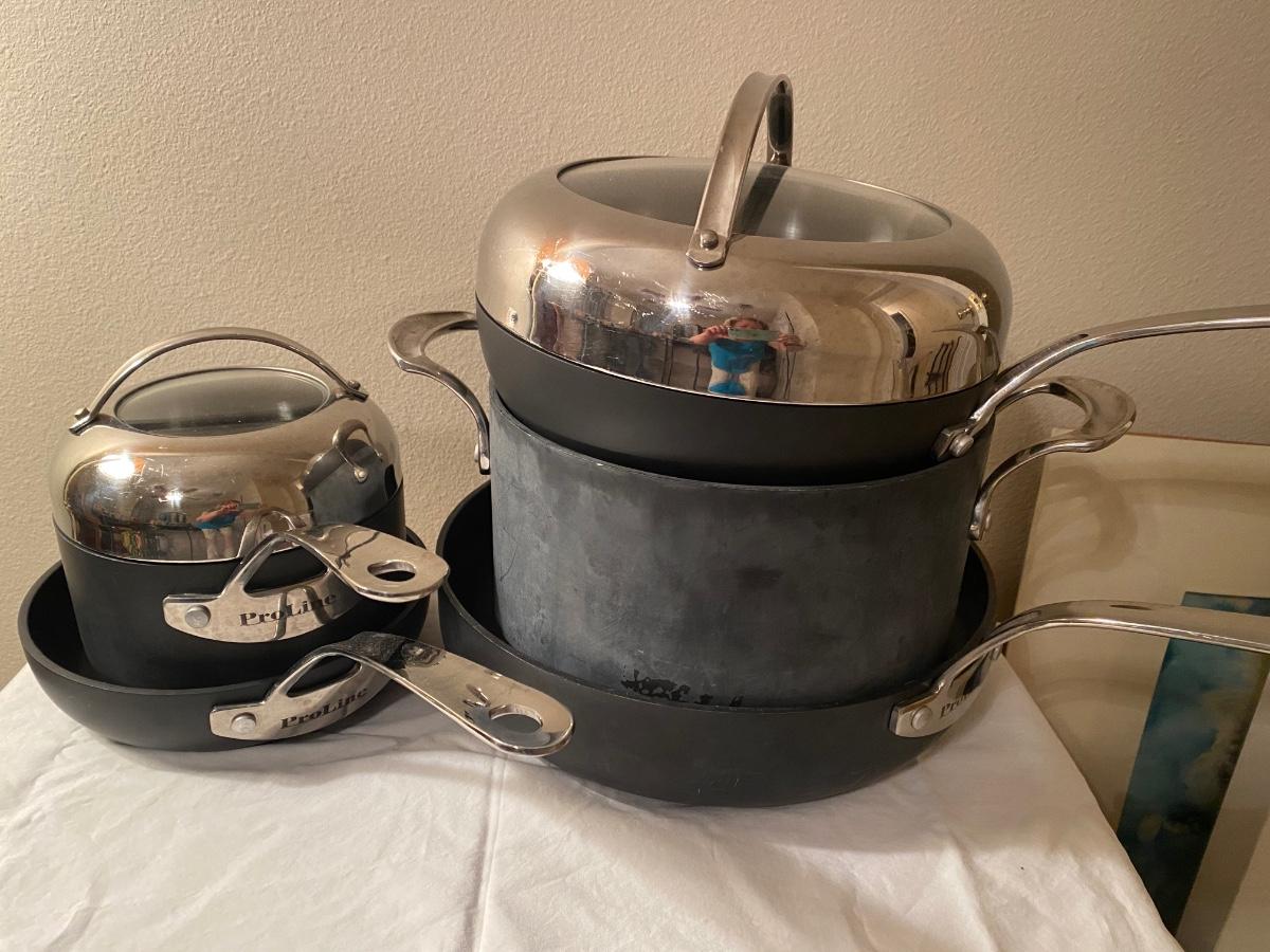 7-piece Proline Tools of the Trade set of pots, hard anodized nonstick ““ hardly used, in excellent condition. Large, small & medium fry pan, Dutch oven and 2-qt pot.