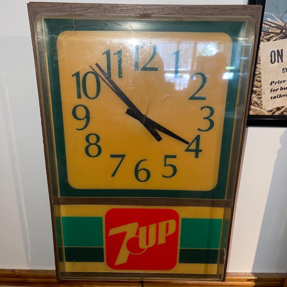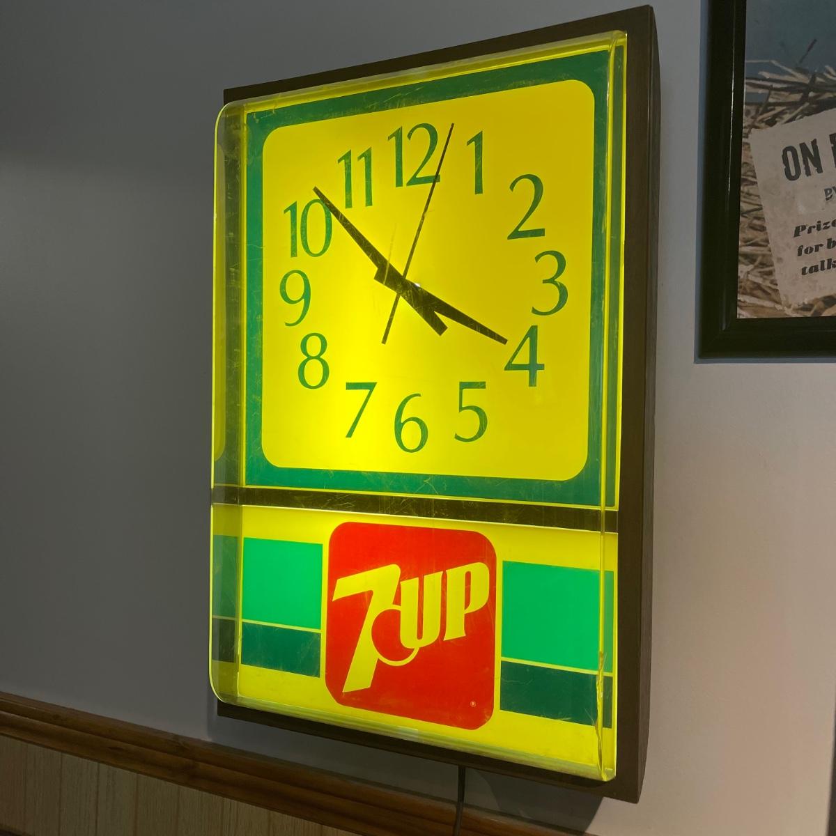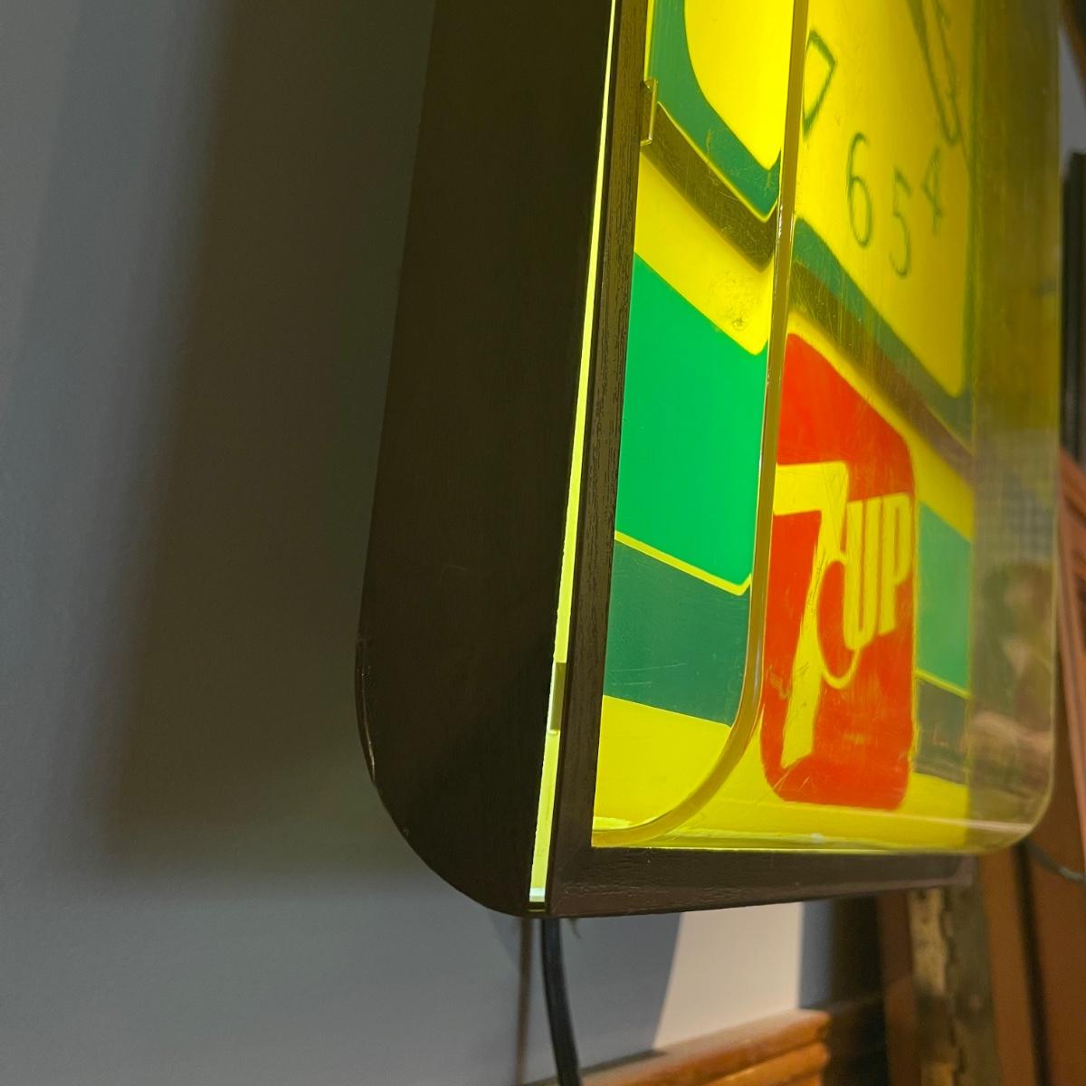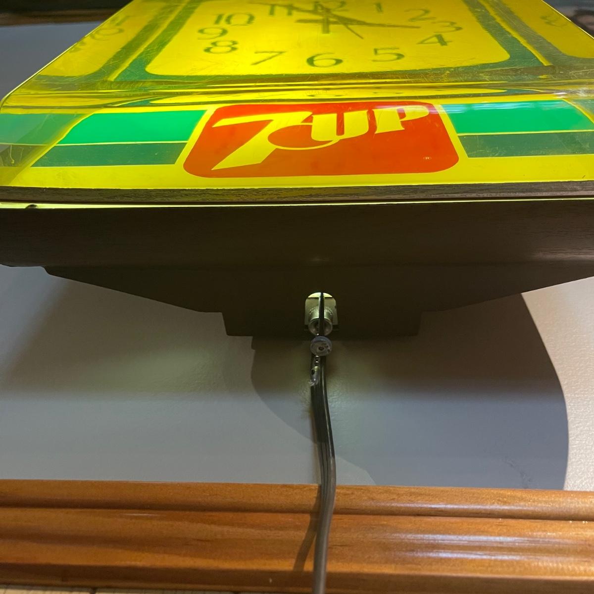 This 7UP illuminated clock measures 12” wide x 5.5” deep x 18” tall. When plugged in, the interior light turned on and the clock hands started to move. There are stickers on the back stating the model number and more information. The clear plastic on the front has some scratches and a crack; it seems to