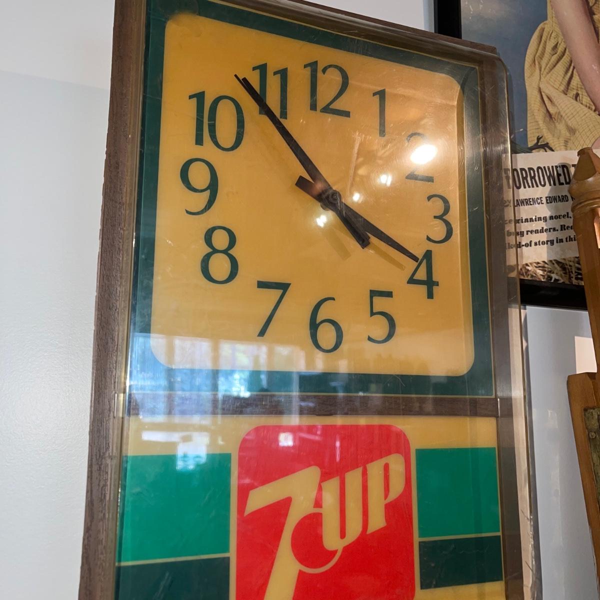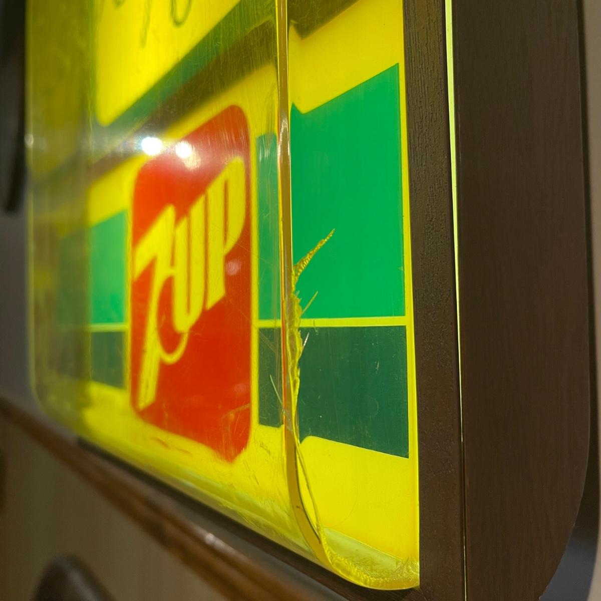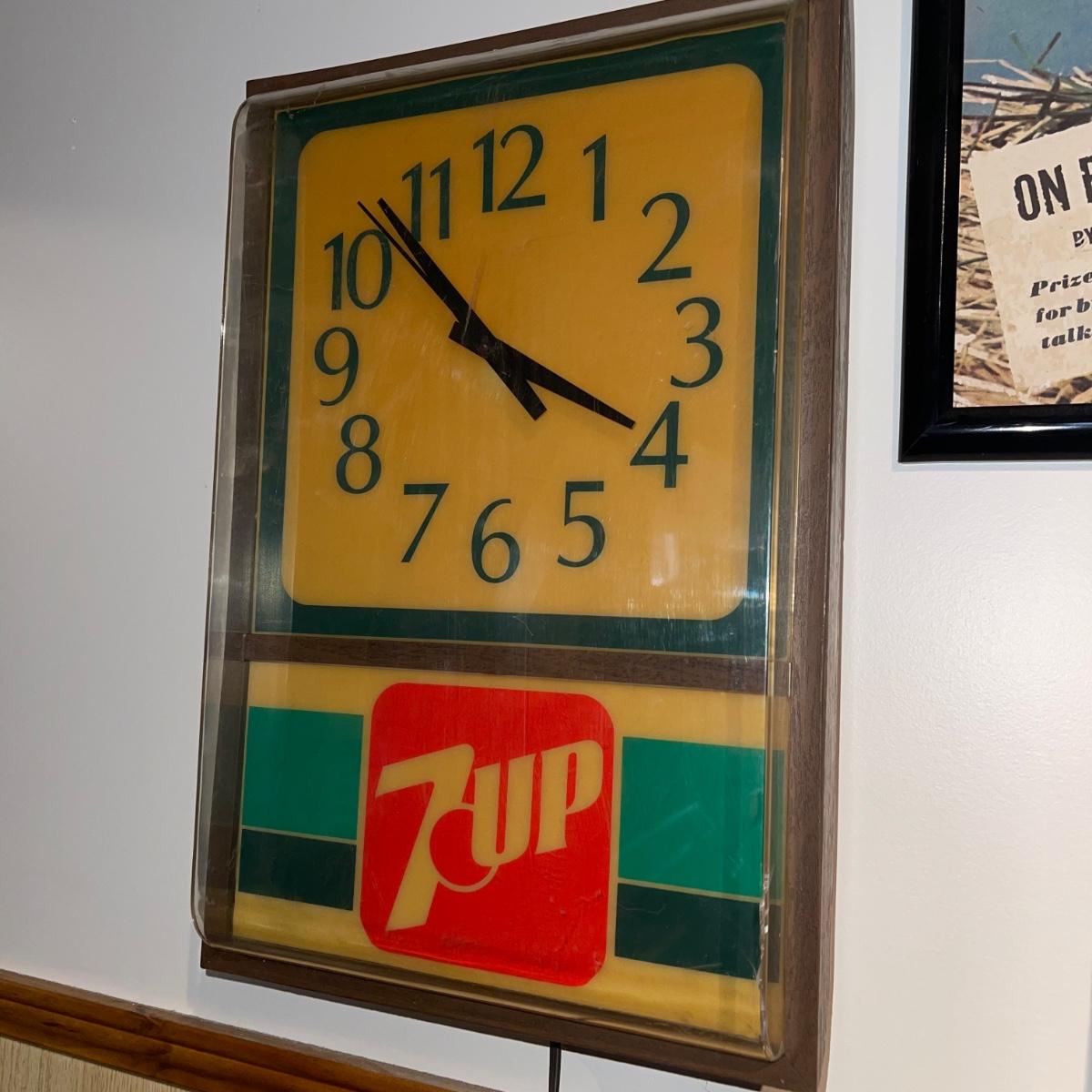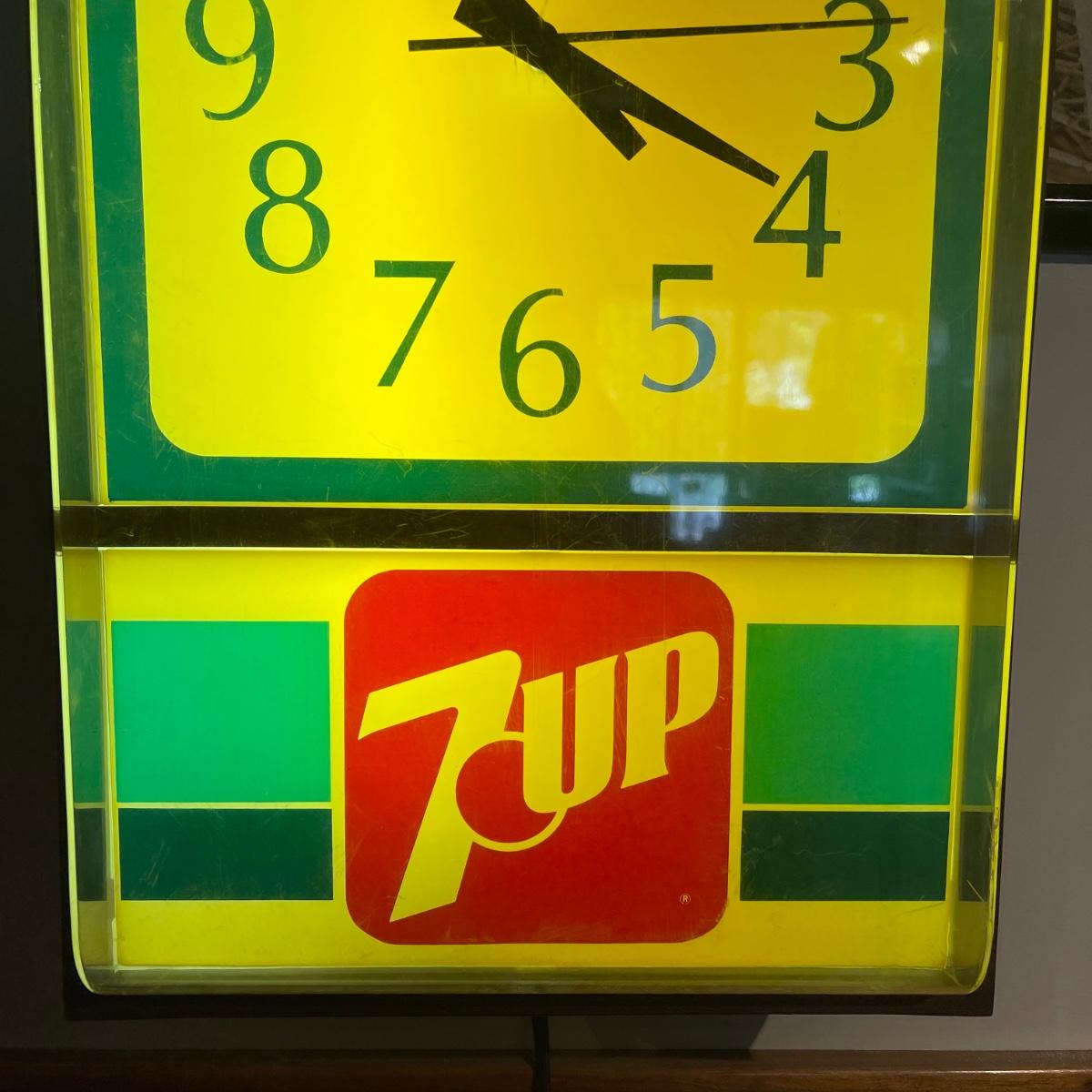 This 7UP illuminated clock measures 12” wide x 5.5” deep x 18” tall. When plugged in, the interior light turned on and the clock hands started to move. There are stickers on the back stating the model number and more information. The clear plastic on the front has some scratches and a crack; it seems to