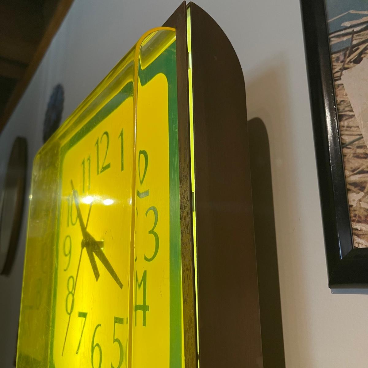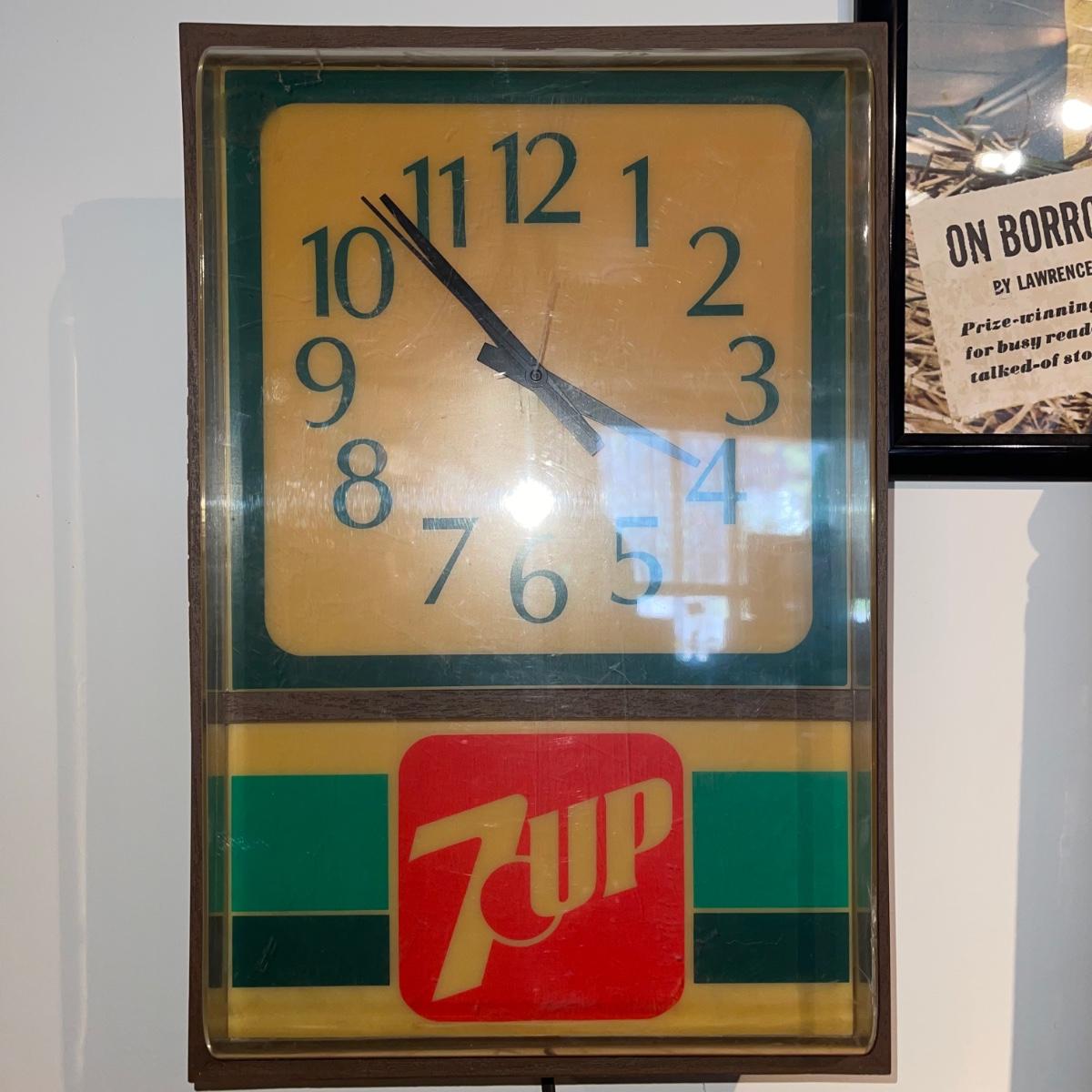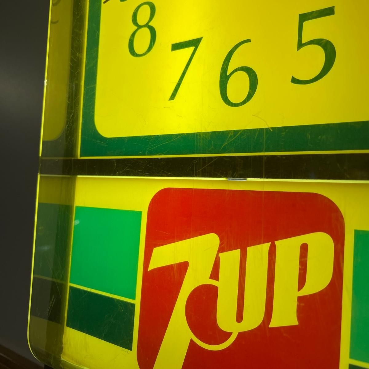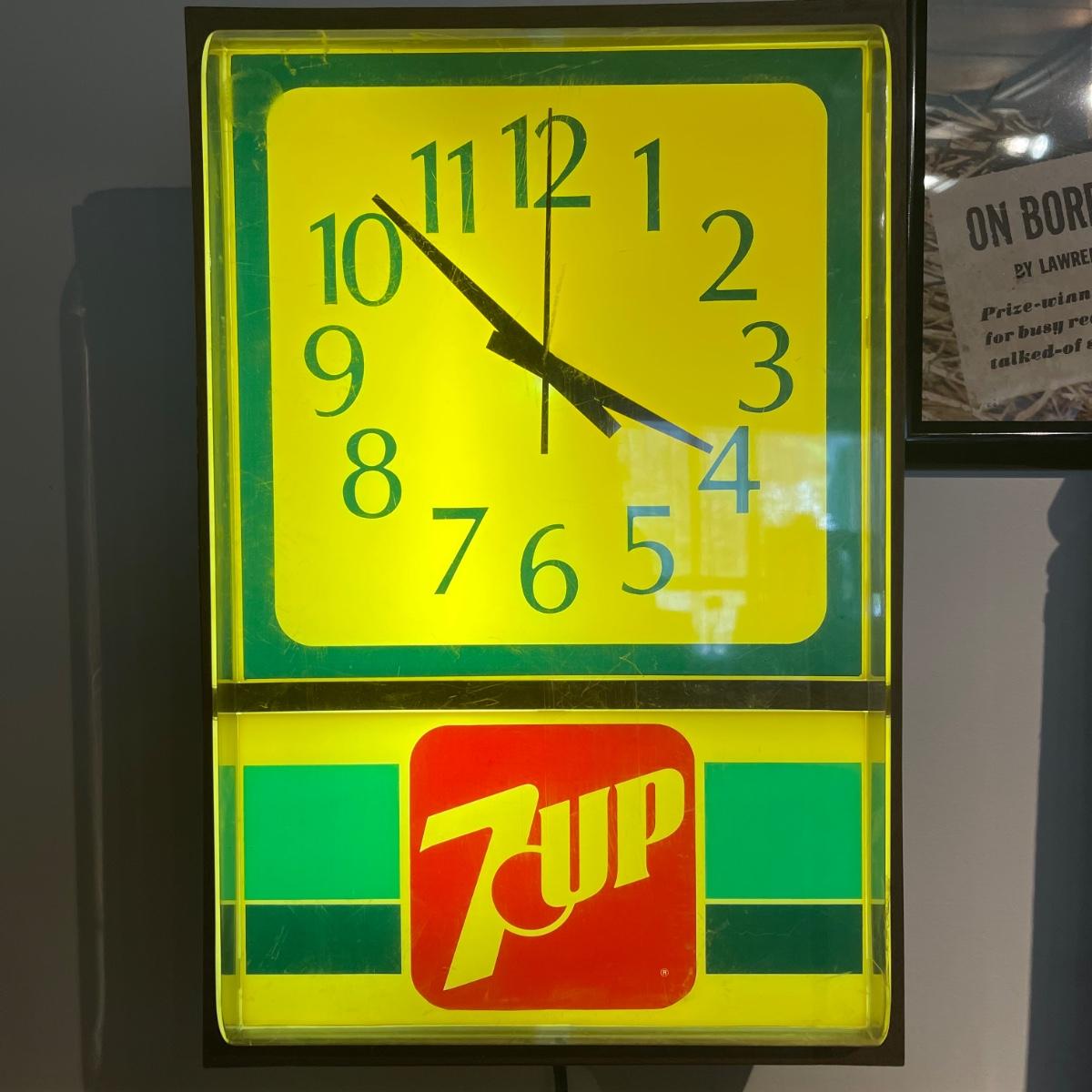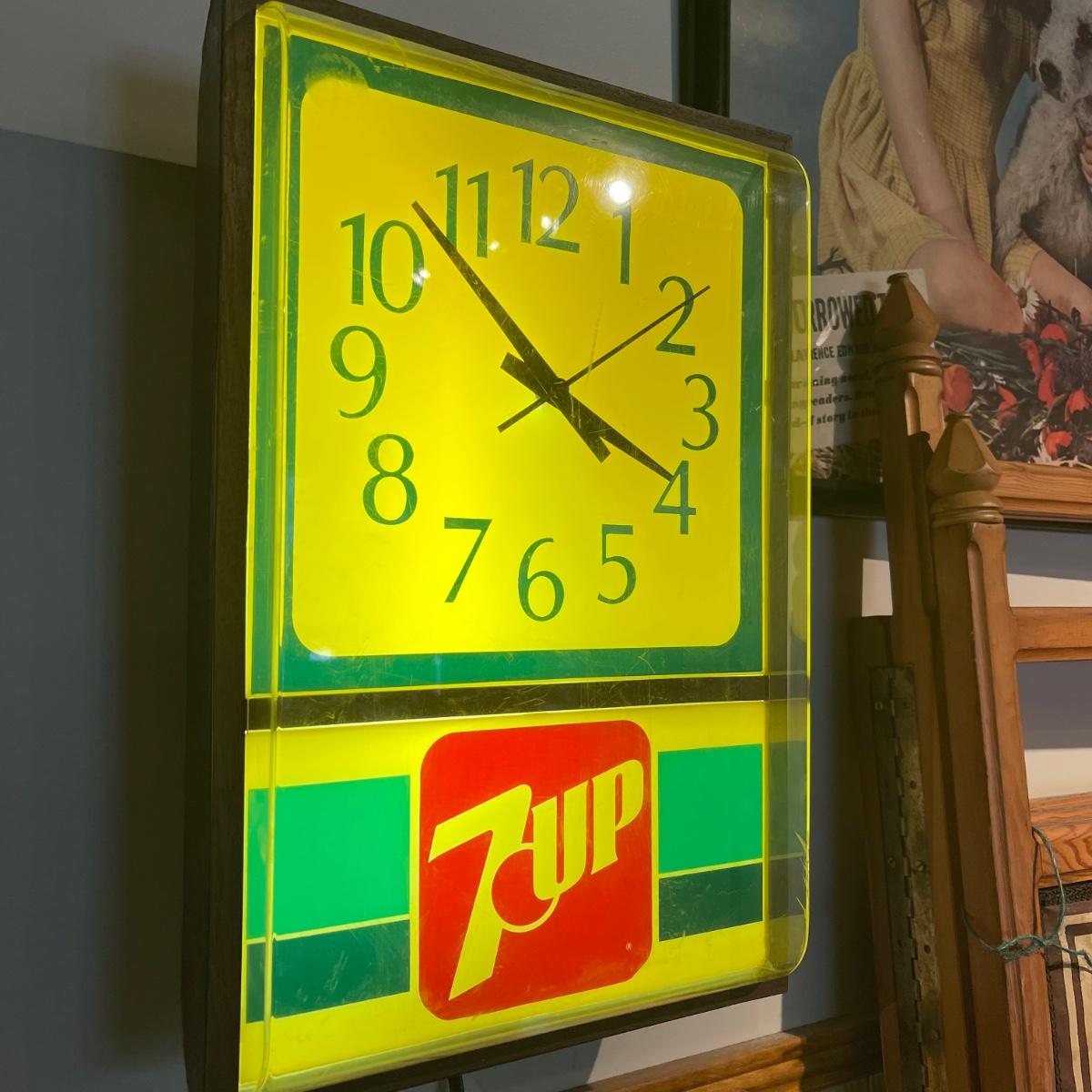 This 7UP illuminated clock measures 12” wide x 5.5” deep x 18” tall. When plugged in, the interior light turned on and the clock hands started to move. There are stickers on the back stating the model number and more information. The clear plastic on the front has some scratches and a crack; it seems to