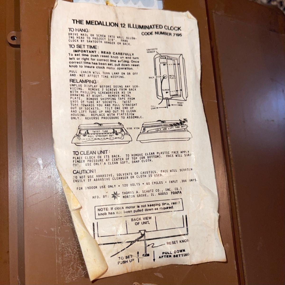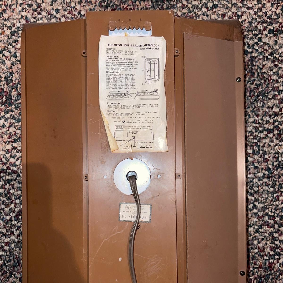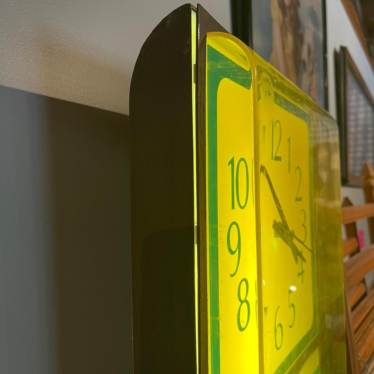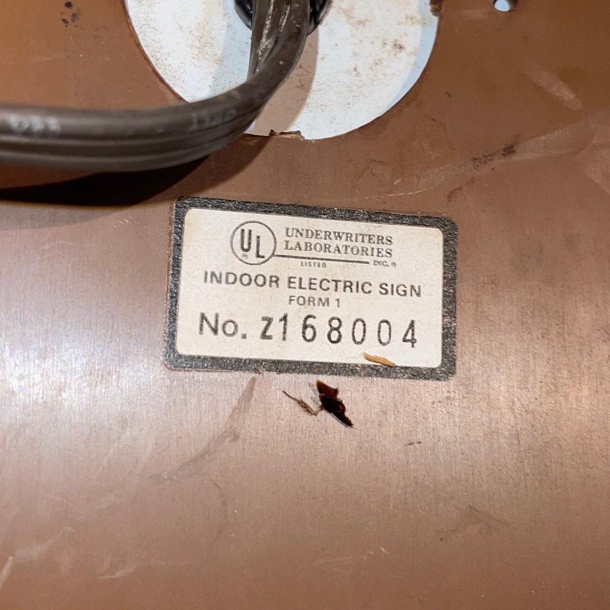 This 7UP illuminated clock measures 12” wide x 5.5” deep x 18” tall. When plugged in, the interior light turned on and the clock hands started to move. There are stickers on the back stating the model number and more information. The clear plastic on the front has some scratches and a crack; it seems to