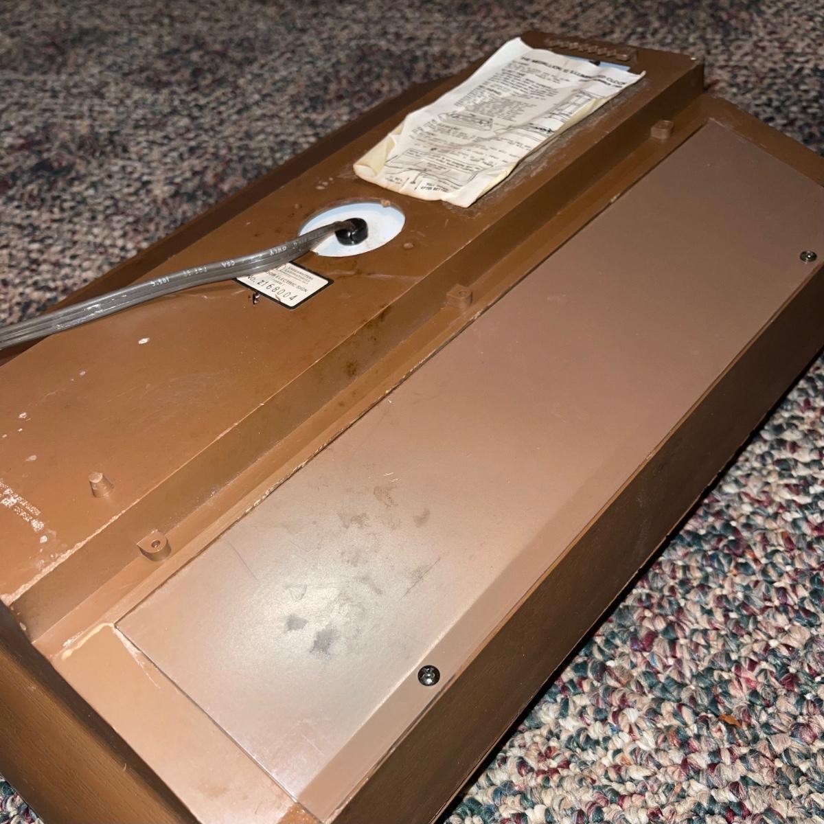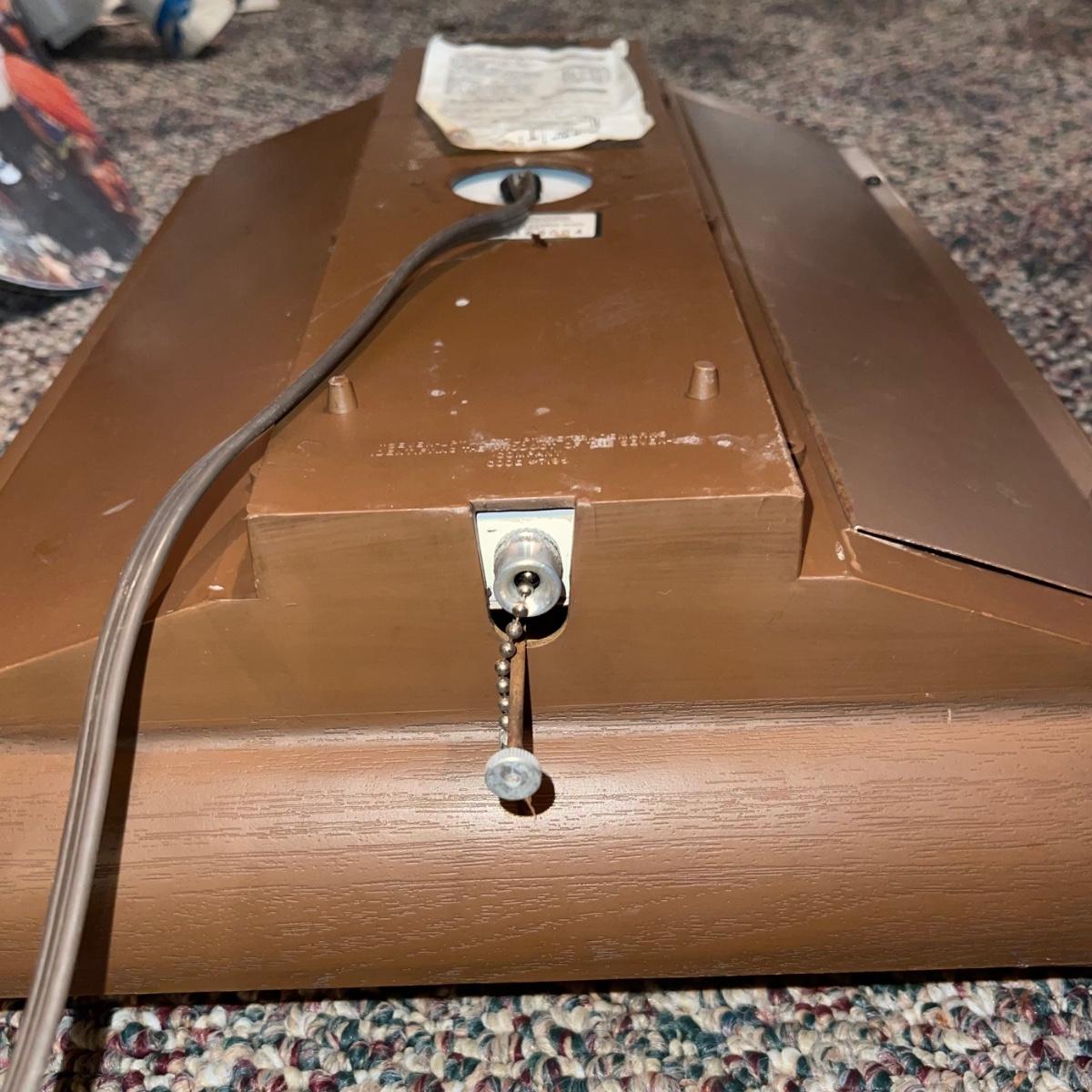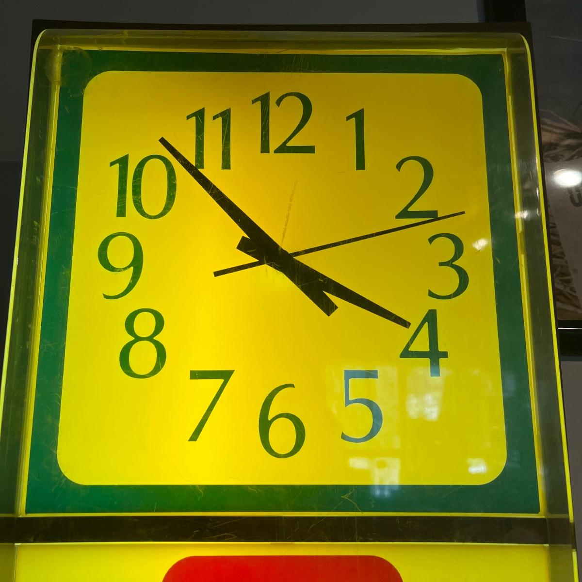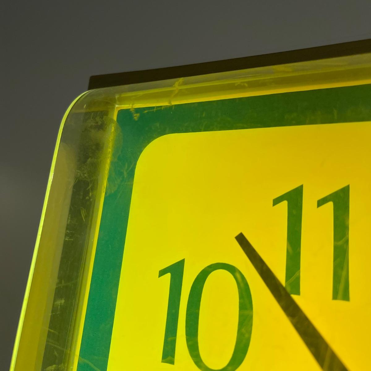 This 7UP illuminated clock measures 12” wide x 5.5” deep x 18” tall. When plugged in, the interior light turned on and the clock hands started to move. There are stickers on the back stating the model number and more information. The clear plastic on the front has some scratches and a crack; it seems to