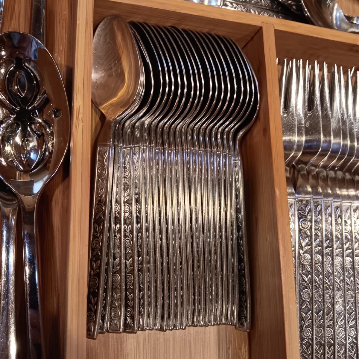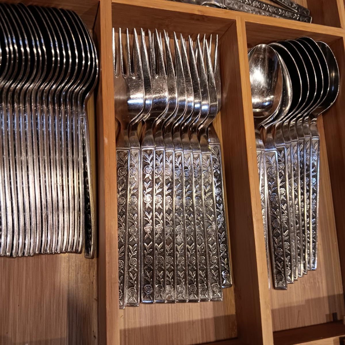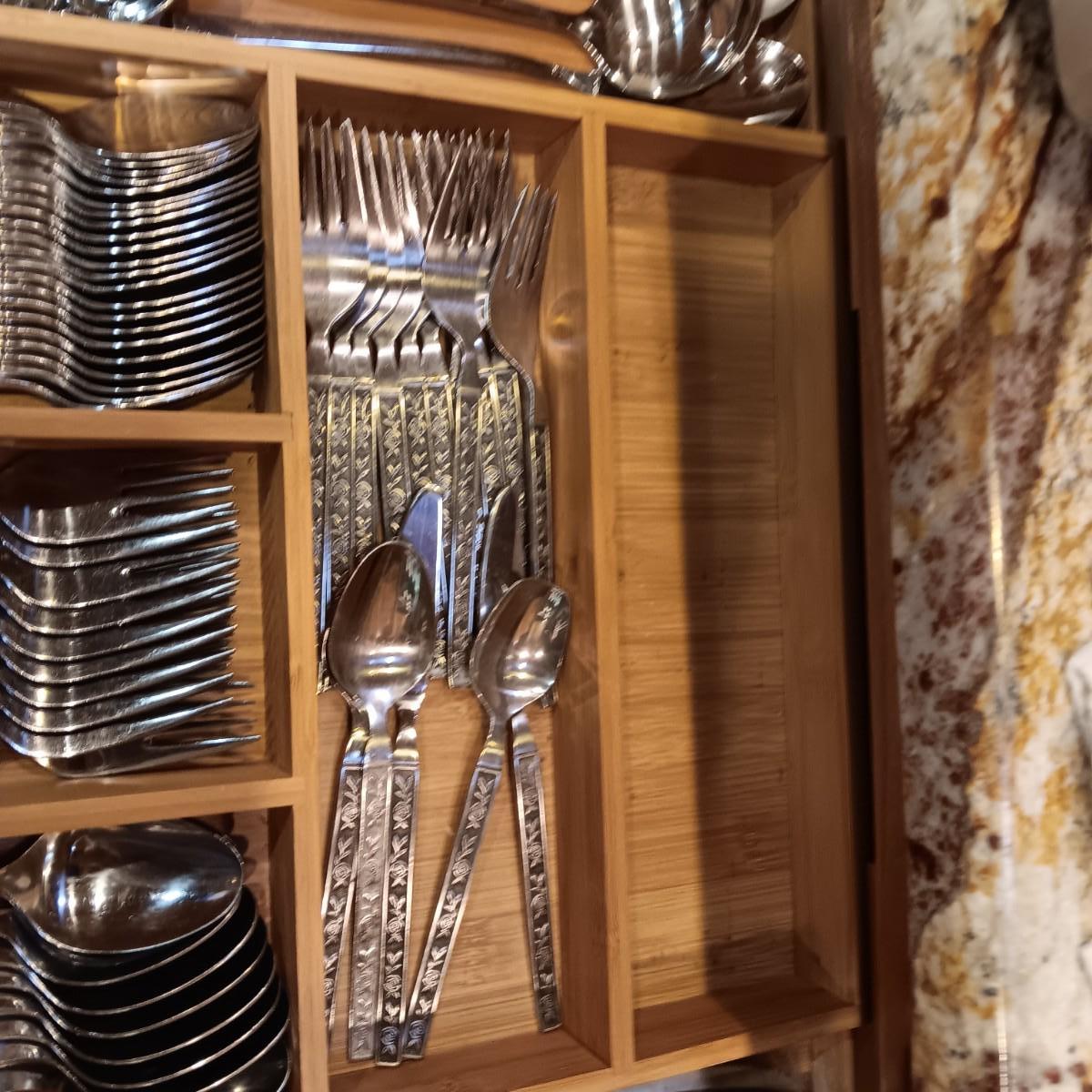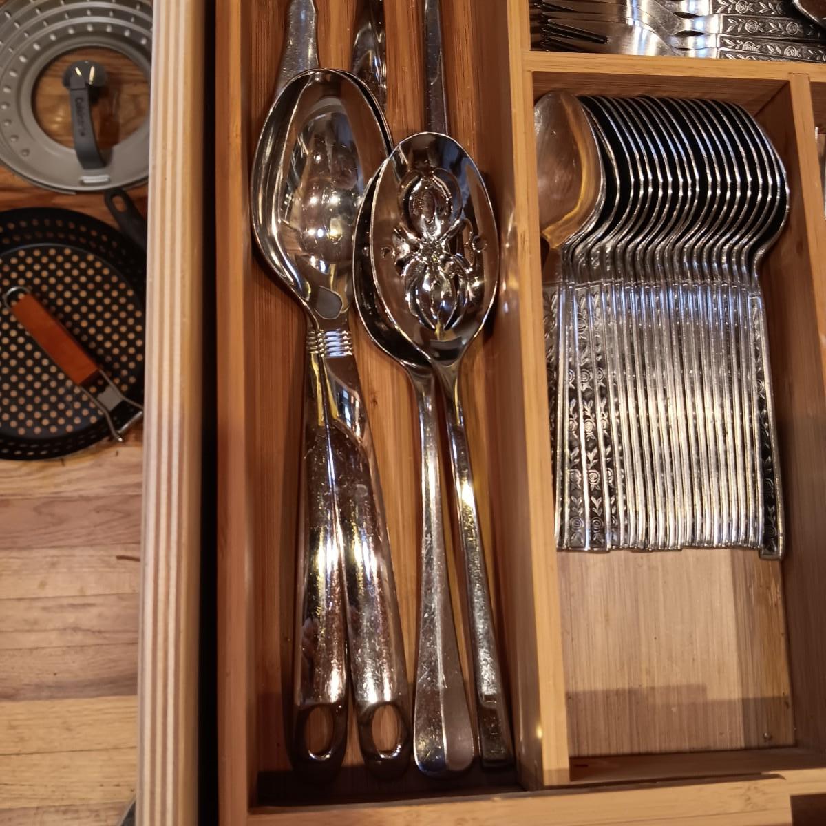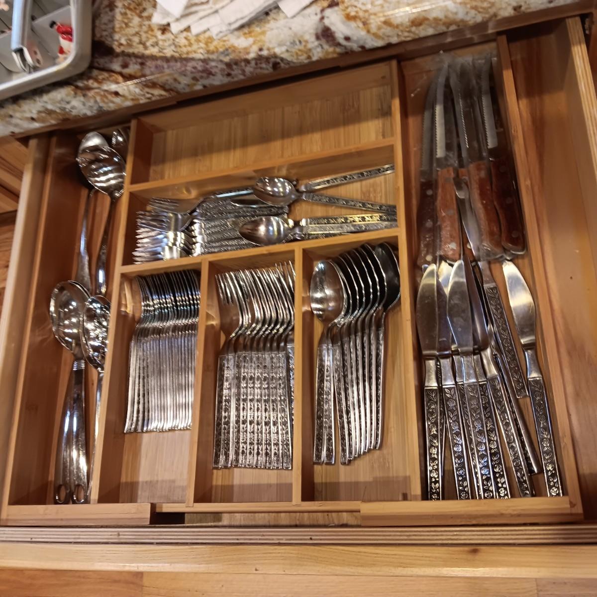 8 - 10 PLACE SETTING OF FLATWARE, SERVING UTENSILS, STEAK KNIVES AND BAMBOO DRAWER ORGANIZER
