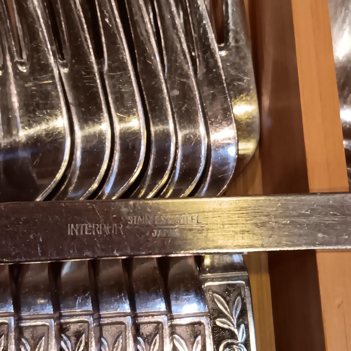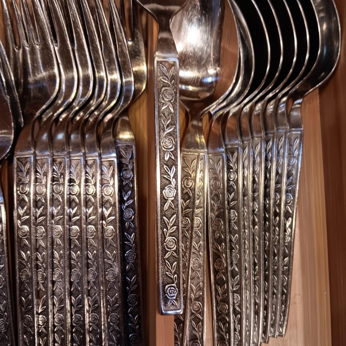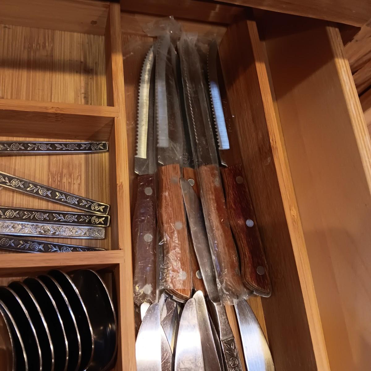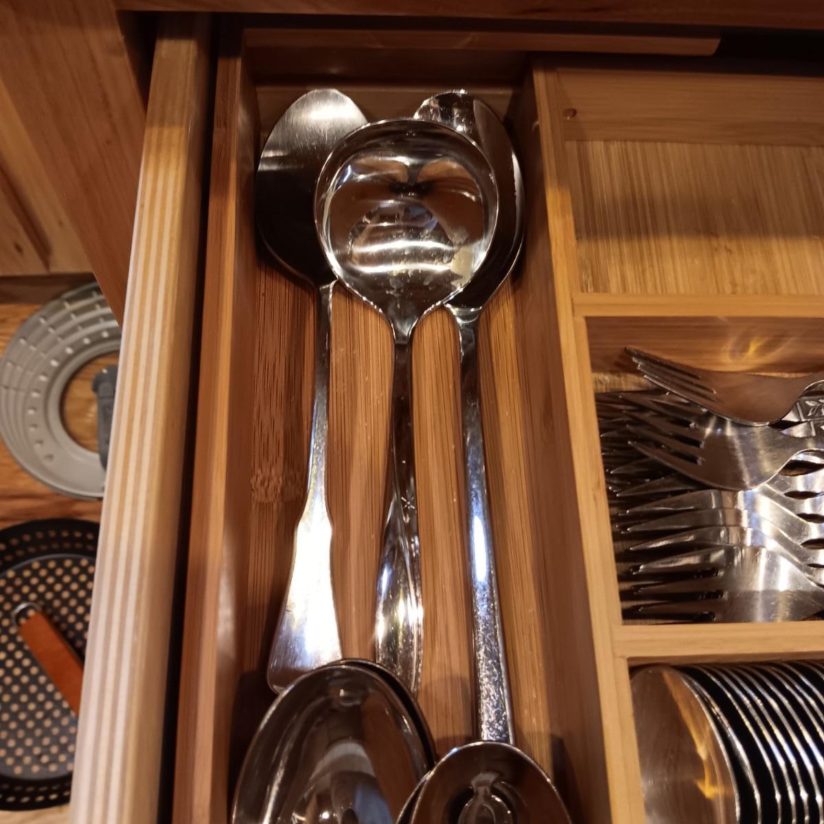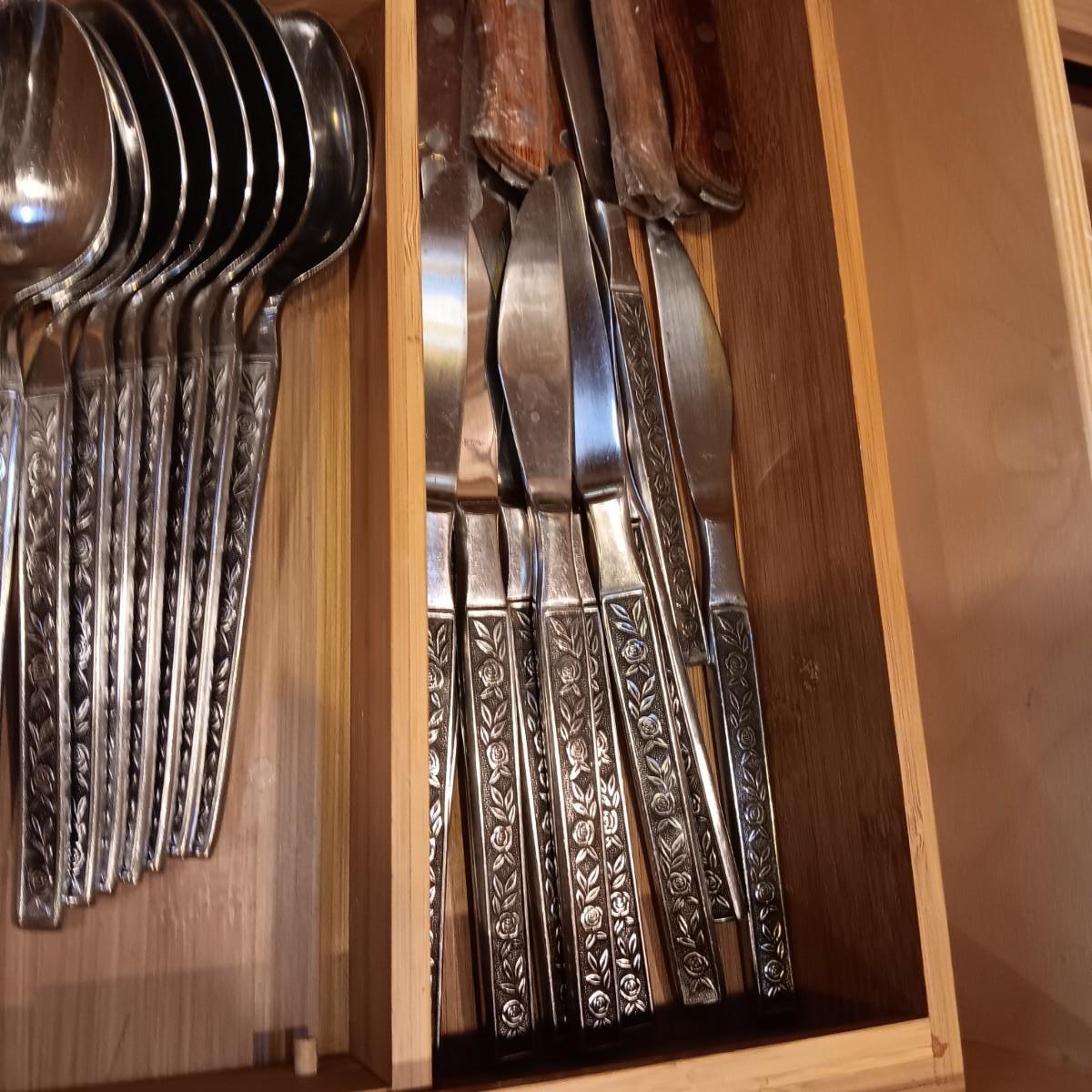 8 - 10 PLACE SETTING OF FLATWARE, SERVING UTENSILS, STEAK KNIVES AND BAMBOO DRAWER ORGANIZER