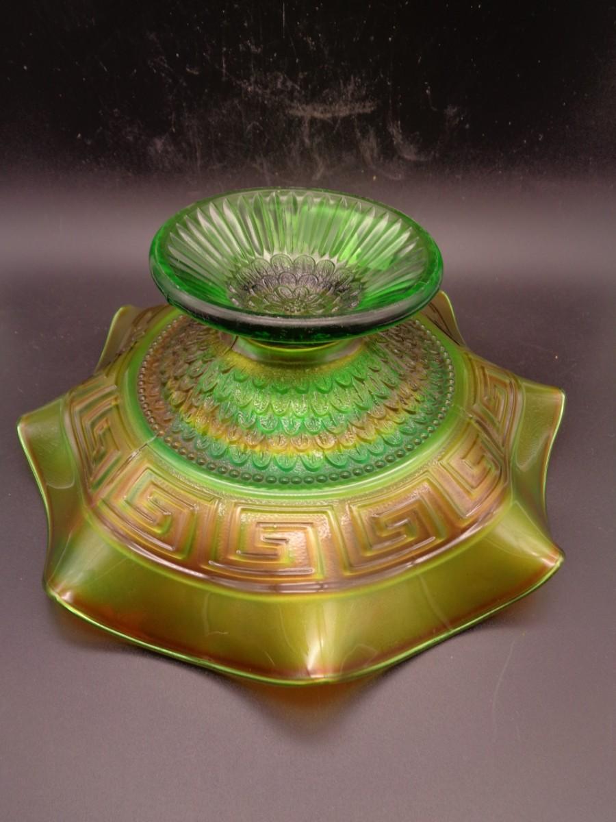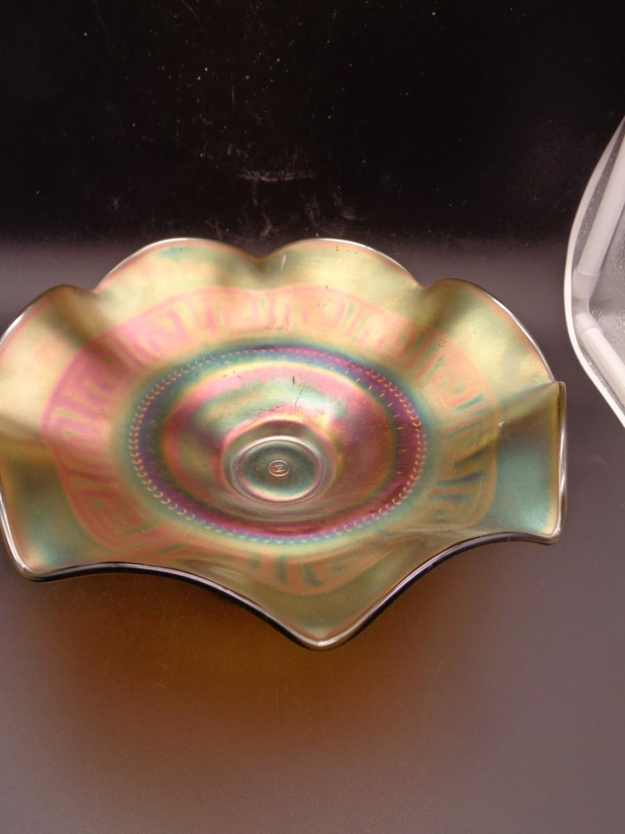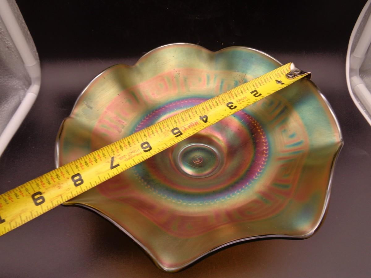 8 1/2" Northwood Green Carnival Glass "Greek Key & Scales" Ruffled Bowl #66