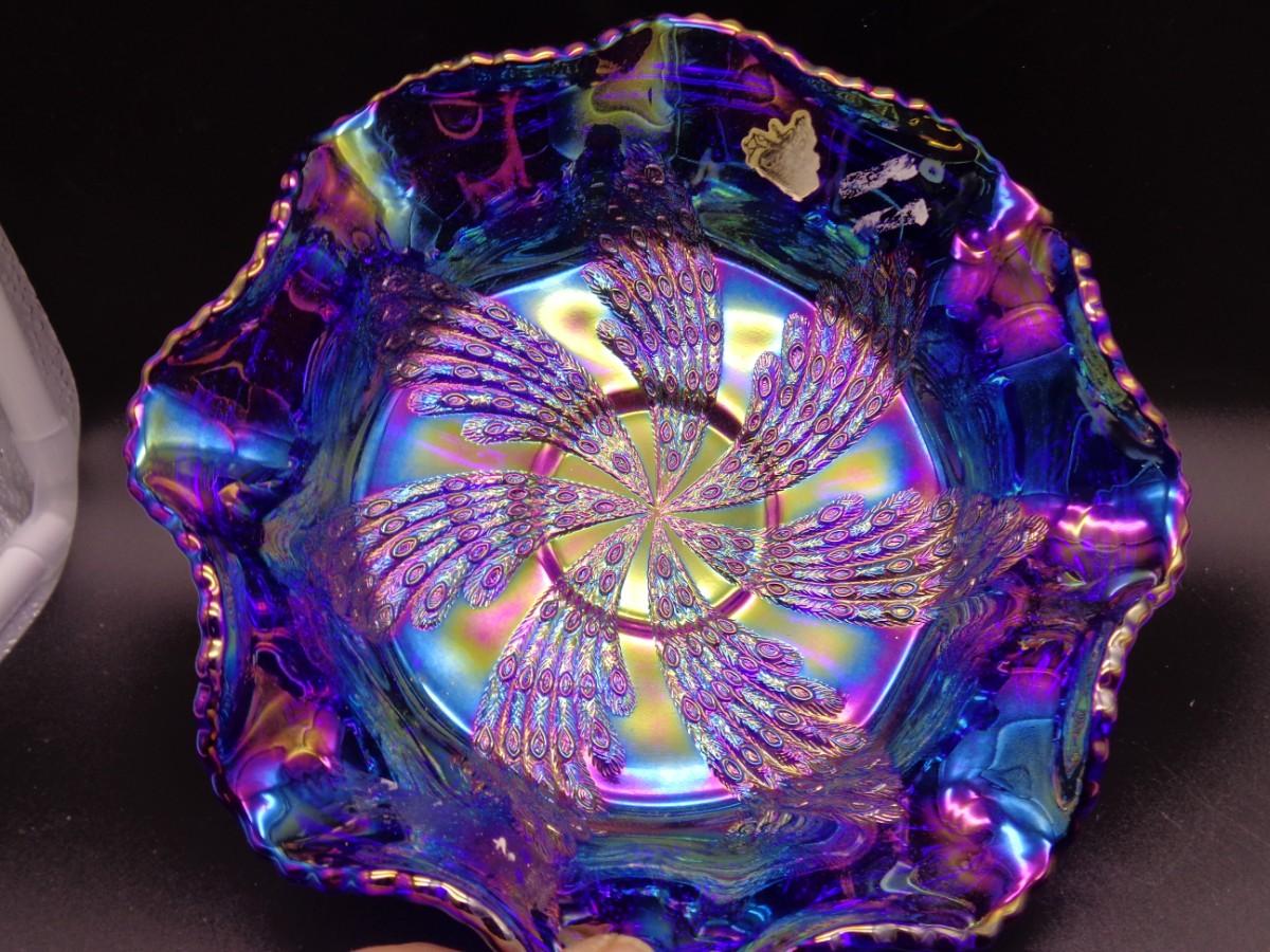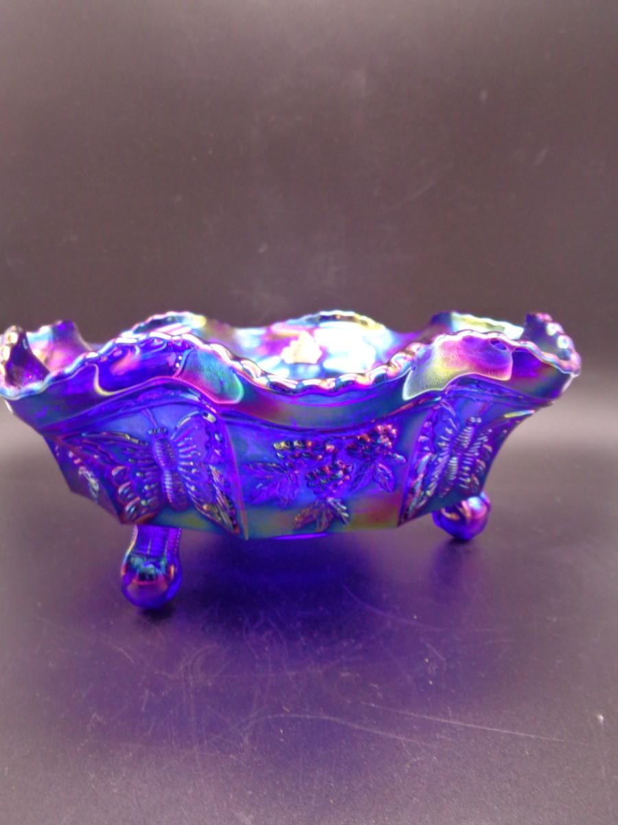 8 3/4" Blue Fenton "Fantail & Butterfly" Berry Bowl Carnival Glass #4
