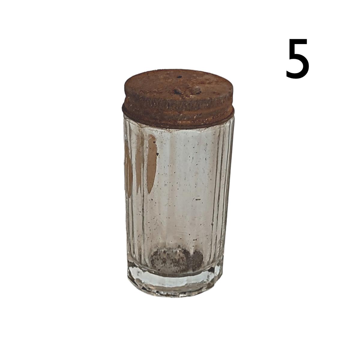 5. Vintage Clear Glass Dodecagon Shaker w/ Rusted Lid - 3"H