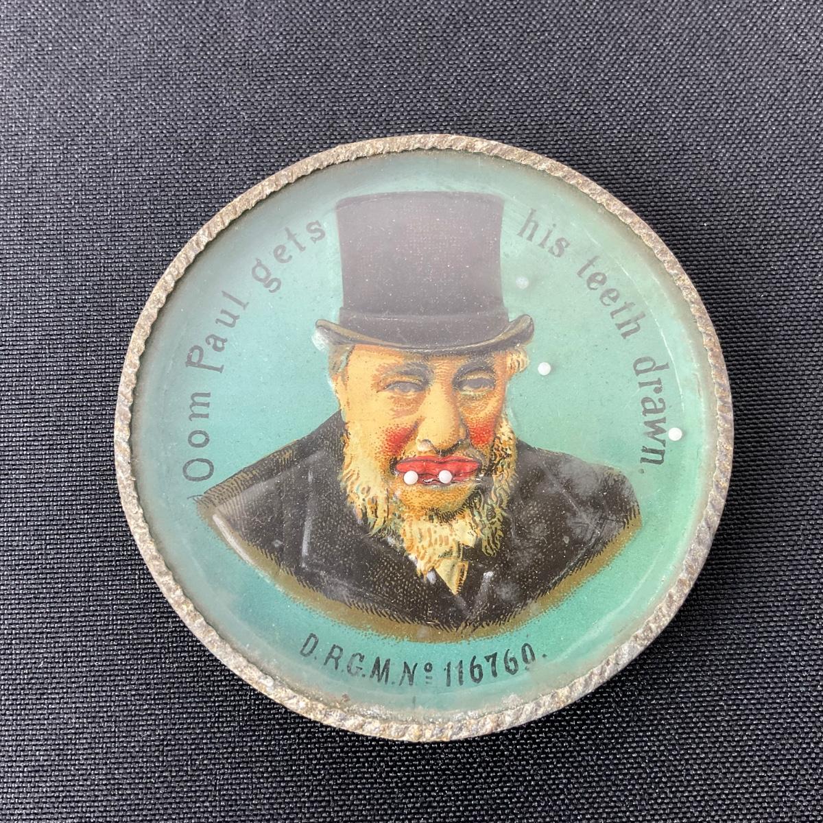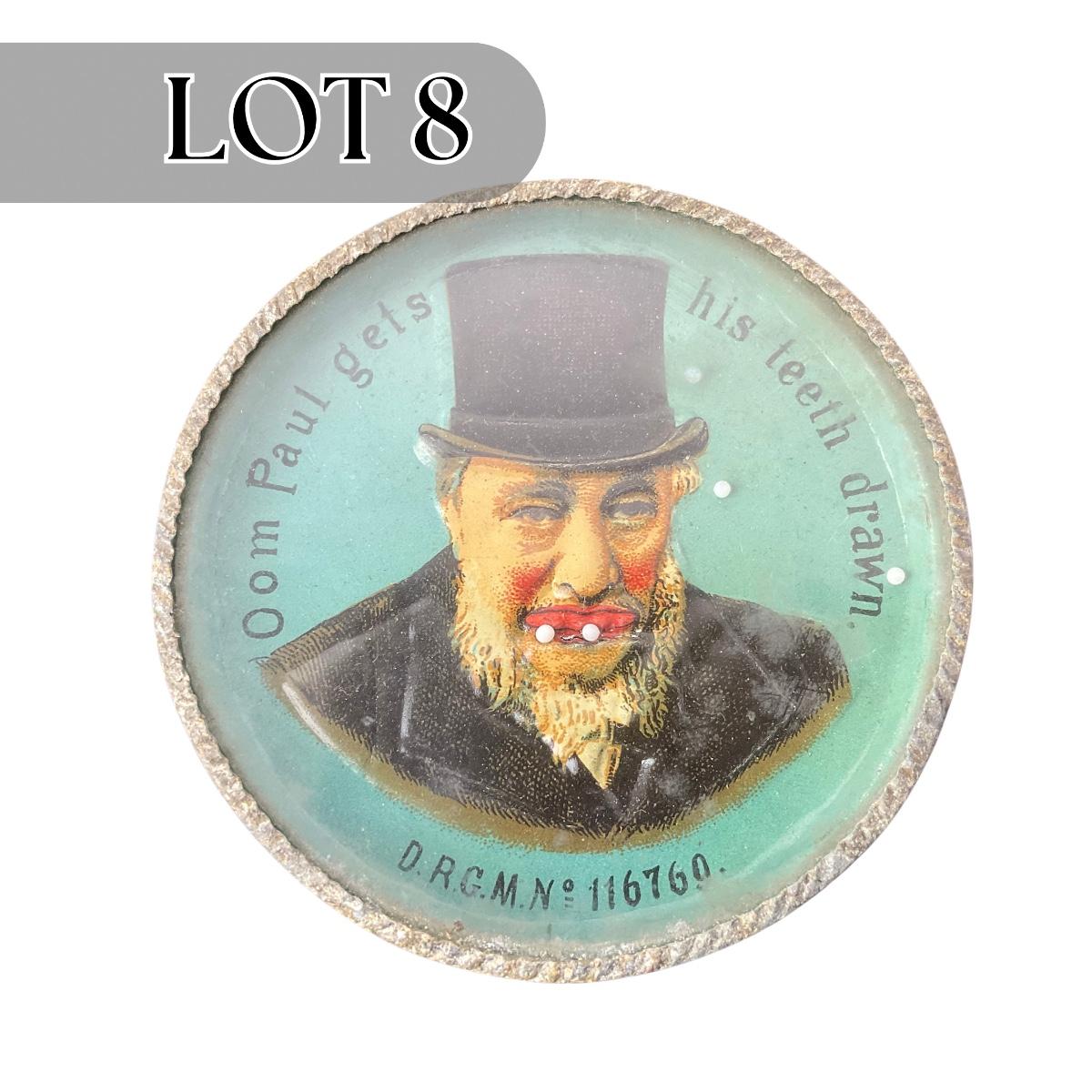 one antique small hand held game “Oom Paula gets his teeth drawn D.R.G.M.N 116760. This piece has a mirror back Please see photos for details and condition. Any condition statement is given as a courtesy to a client, is an opinion, and should not be treated as a statement of fact. Reference to condition written, oral or within a condition report shall not be regarded as a full account of condition and may not include all defects, alterations, or restorations. Absence of a condition report does not imply a lot is flawless or lacking imperfections or damage. Katherine’s Auction & Appraisal Service shall have no responsibility for any error or omission. Returns shall not be accepted on the basis of condition. ::: Shipping is available on this lot. If you require shipping you must let us know at the close of the auction. We will coordinate with you after the item has been won. Shipping fees will include insurance up to or exceeding the value of all items being mailed. If you have any questions regarding this lot please contact the auctioneer either via this website, by direct email or by phone. PICK UP TIMES and other important information can be found in the TERMS and DESCRIPTION of the auction. Please take a look for pertinent information. Thanks!