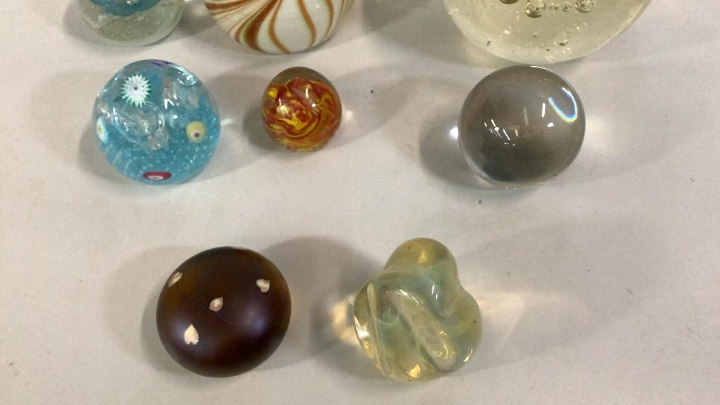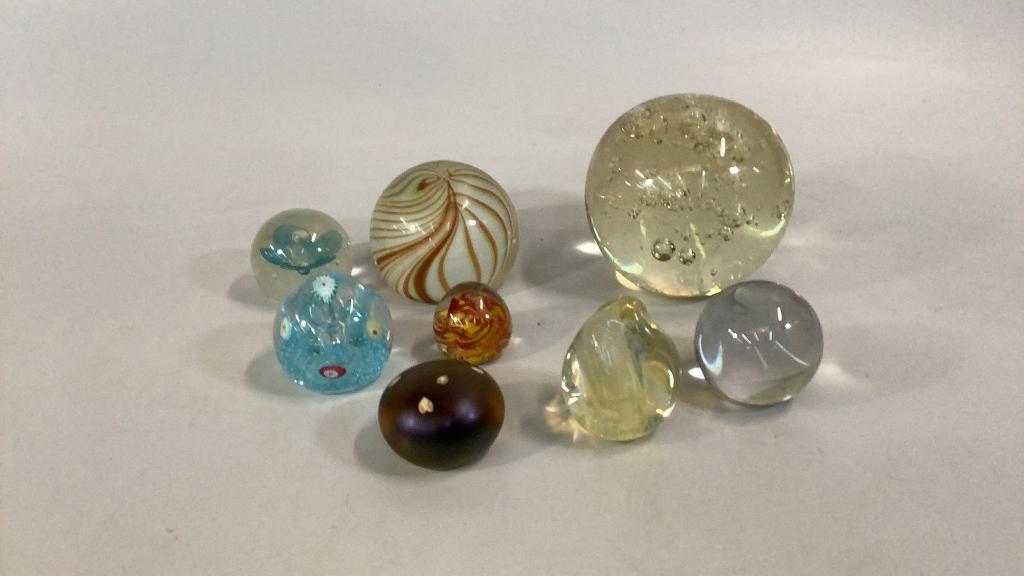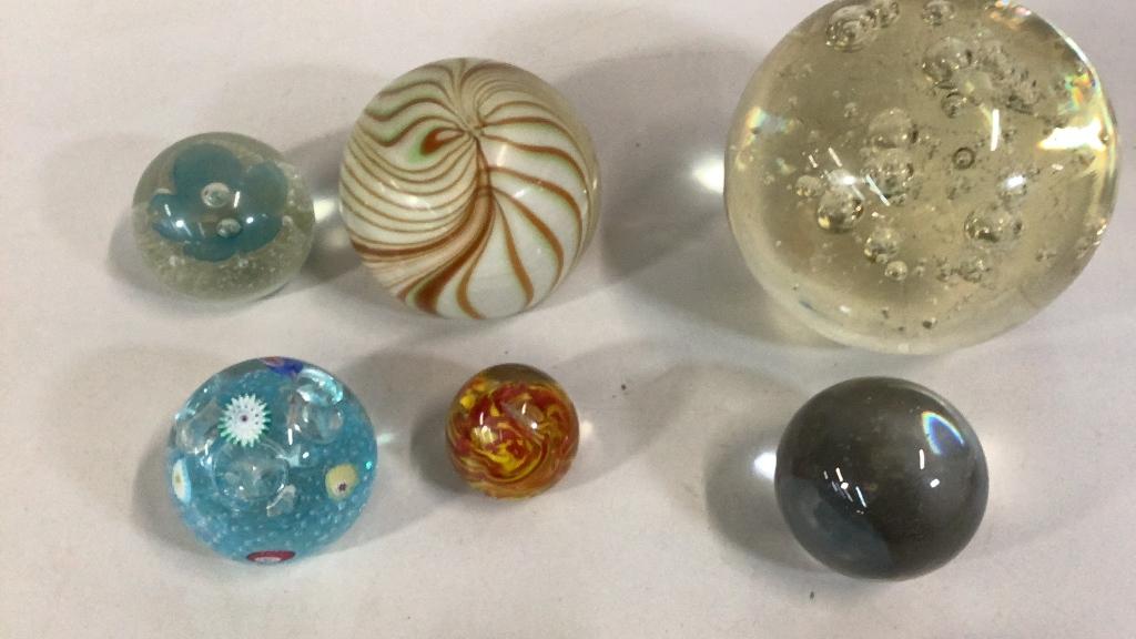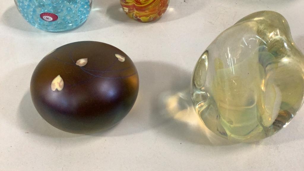 One signed Gilbert and Johnson( iridescent swirl front center), smaller lavender ball also signed but not determined, other no signature #81