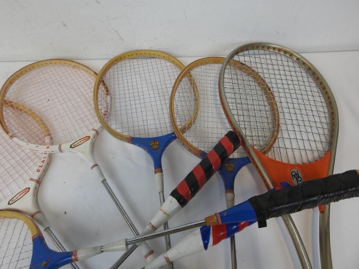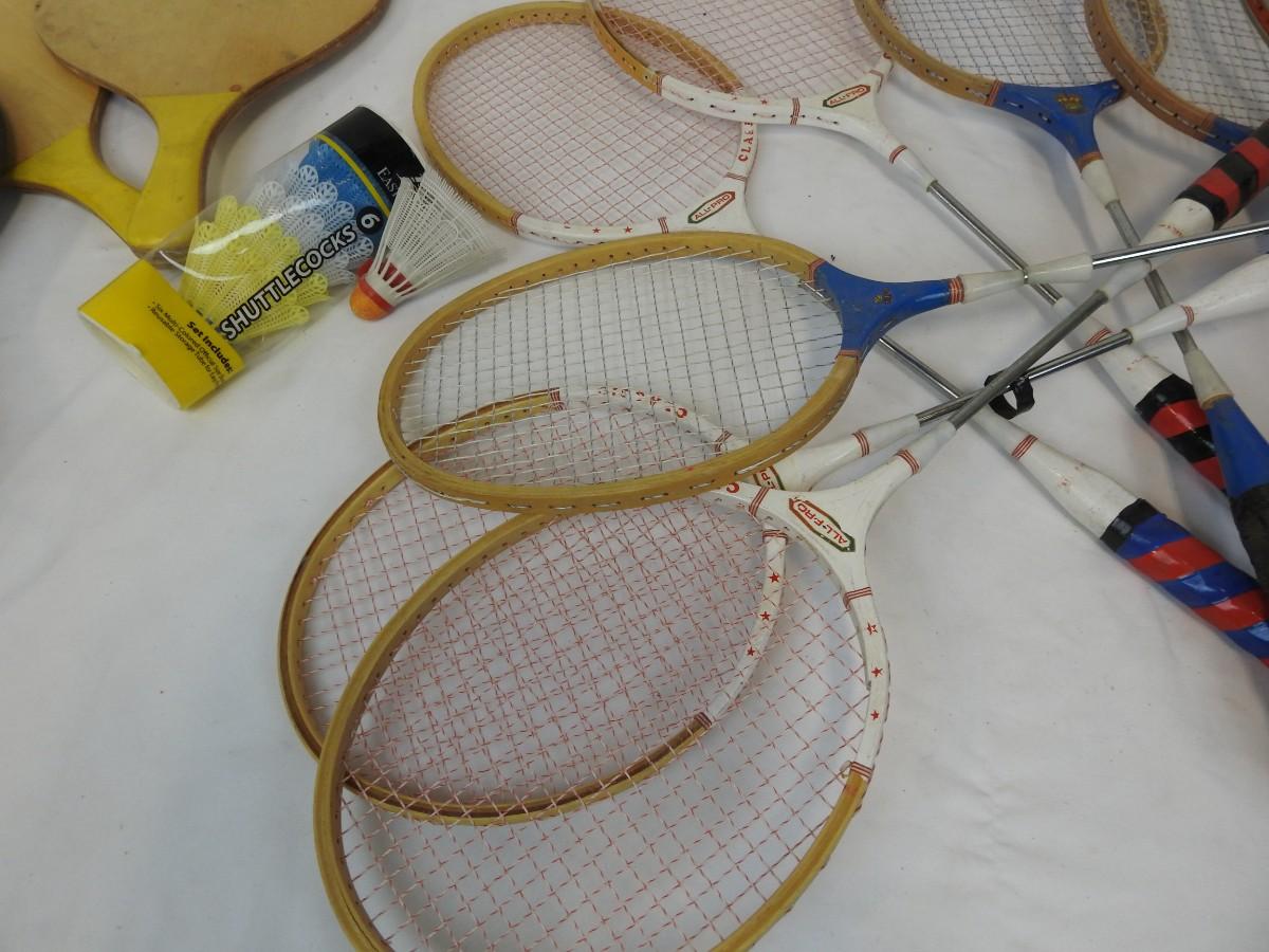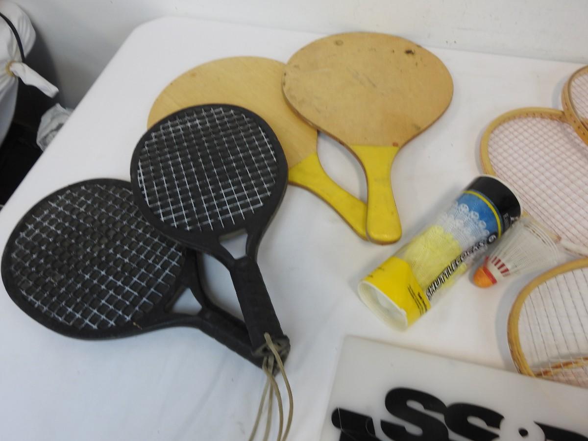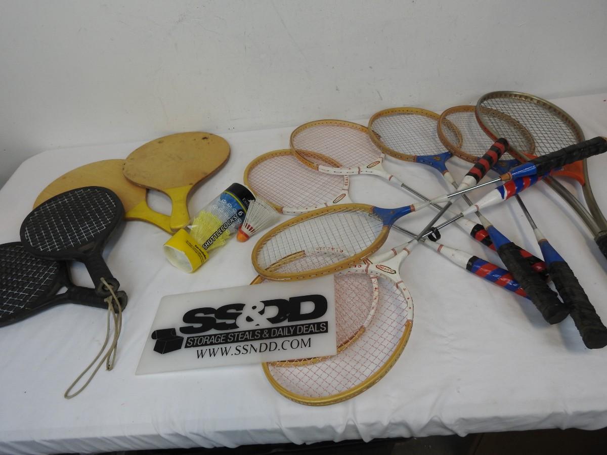 8 Badminton Raquets, 4 Paddles, and 7 Shuttlecocks