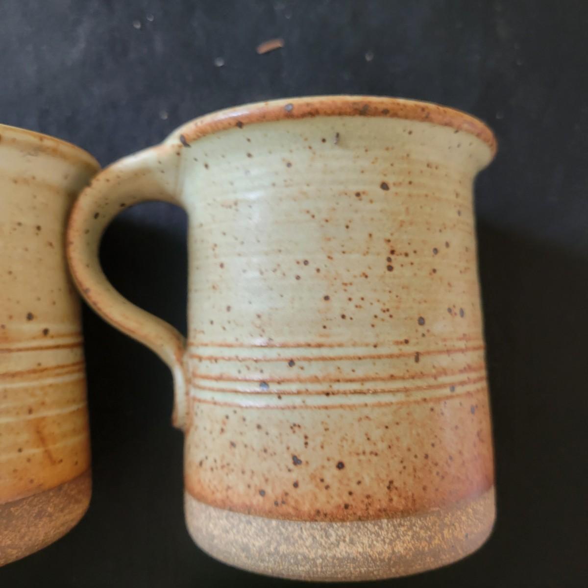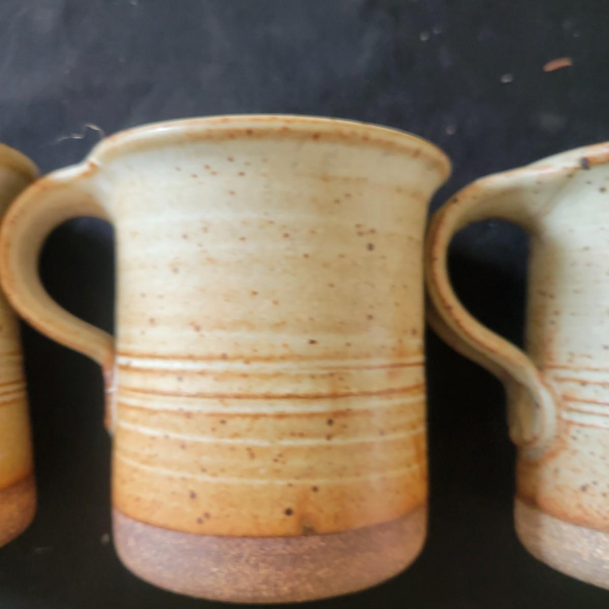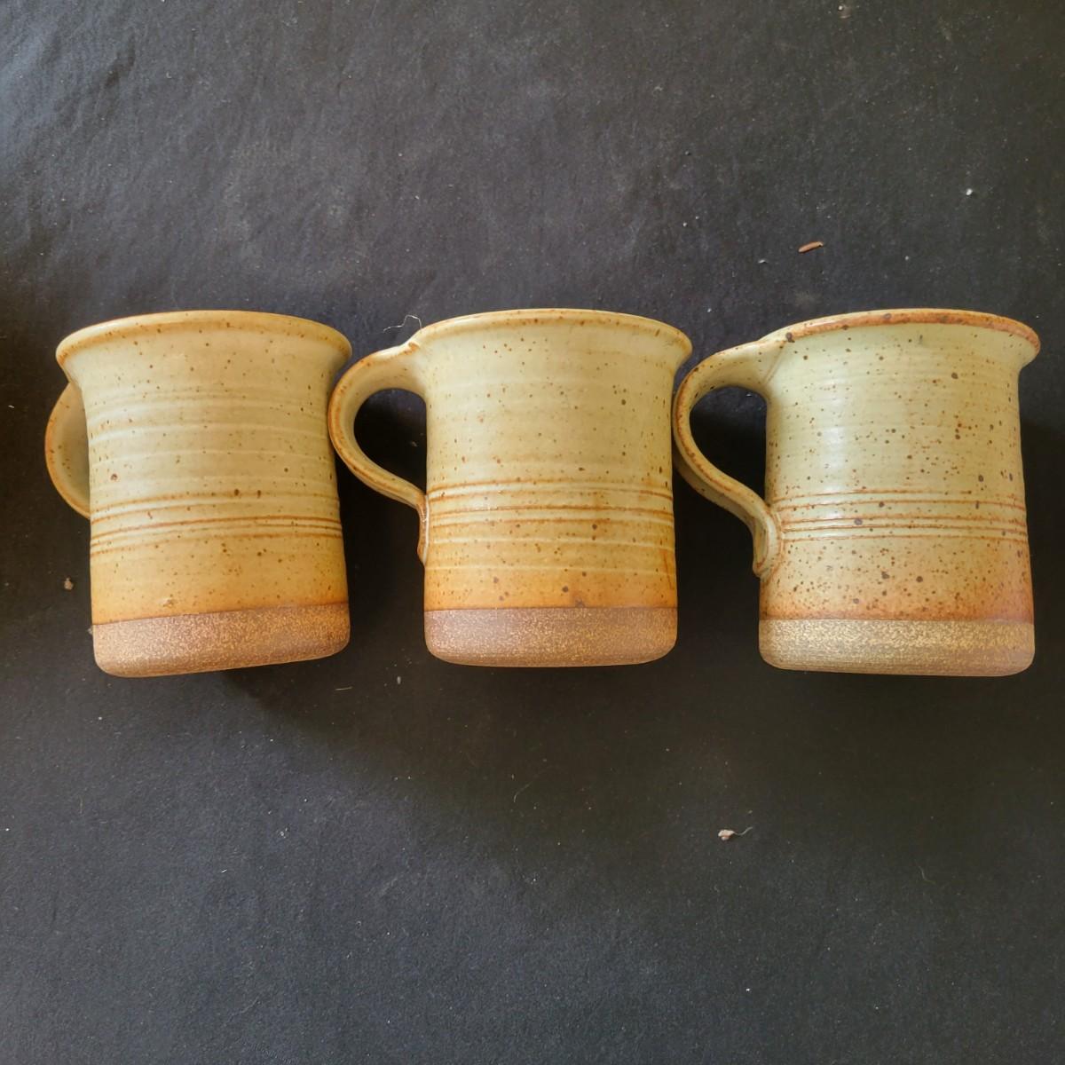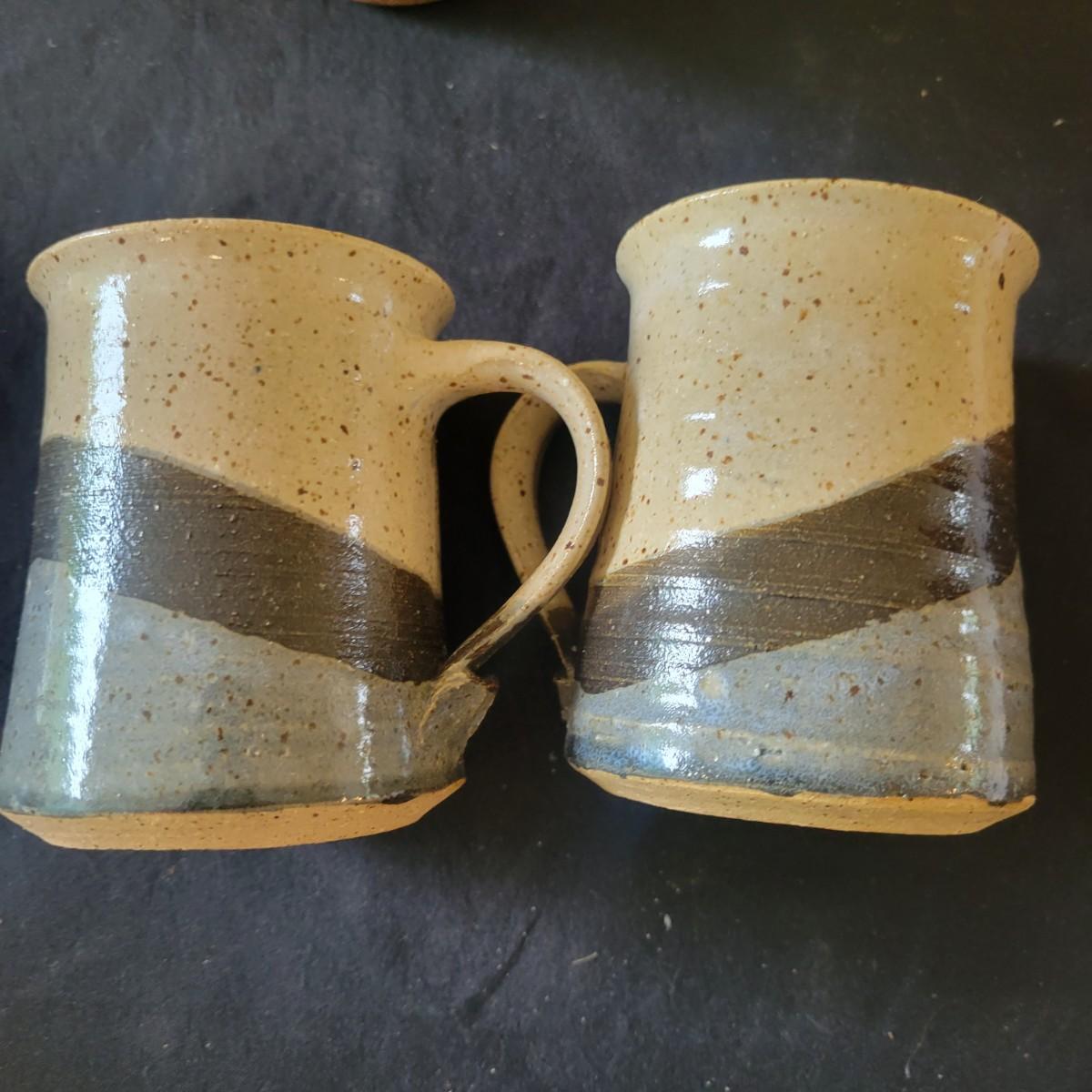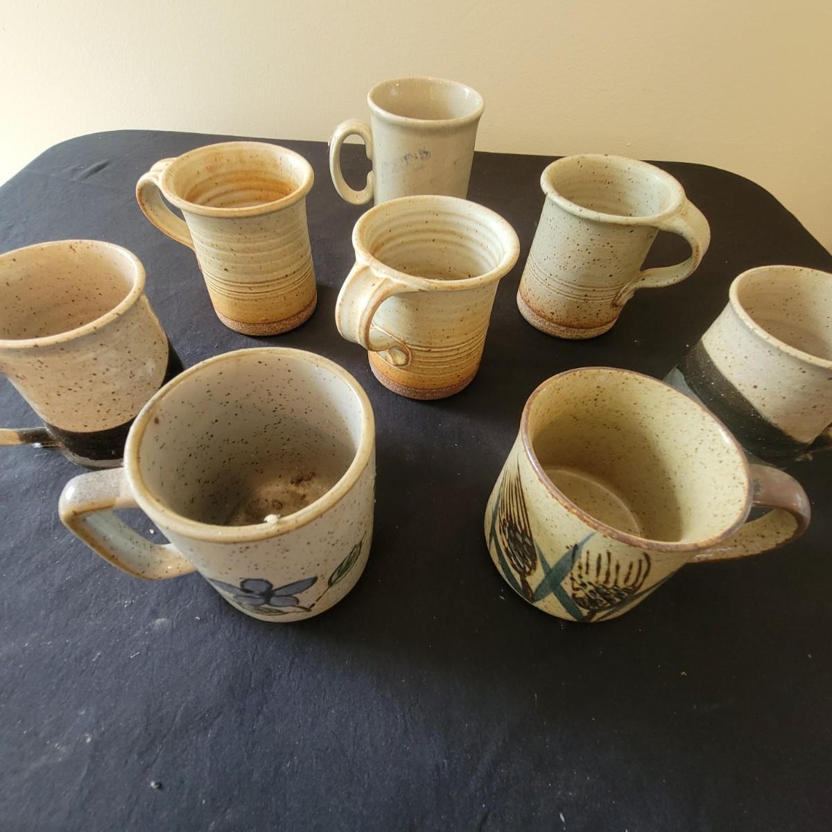 An assortment of ceramic coffee mugs with similar glazes. We have not found chips or breaks in any of them and most appear to be production volume ceramics. Three are random designs, three are of a matching set, and two are of a different matching set. Shipping available