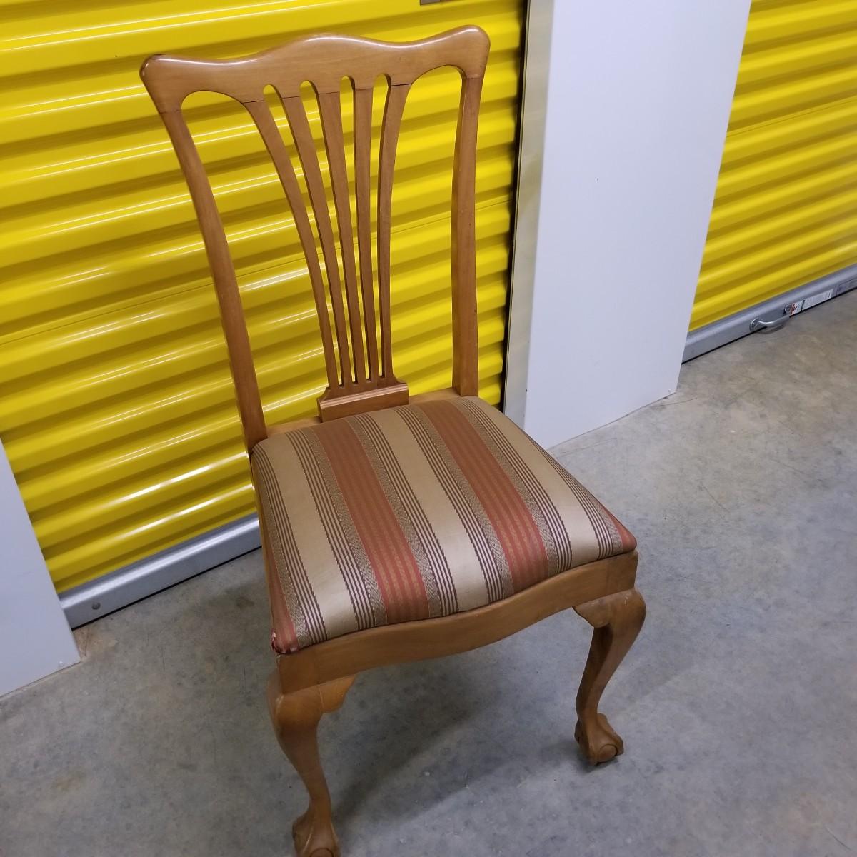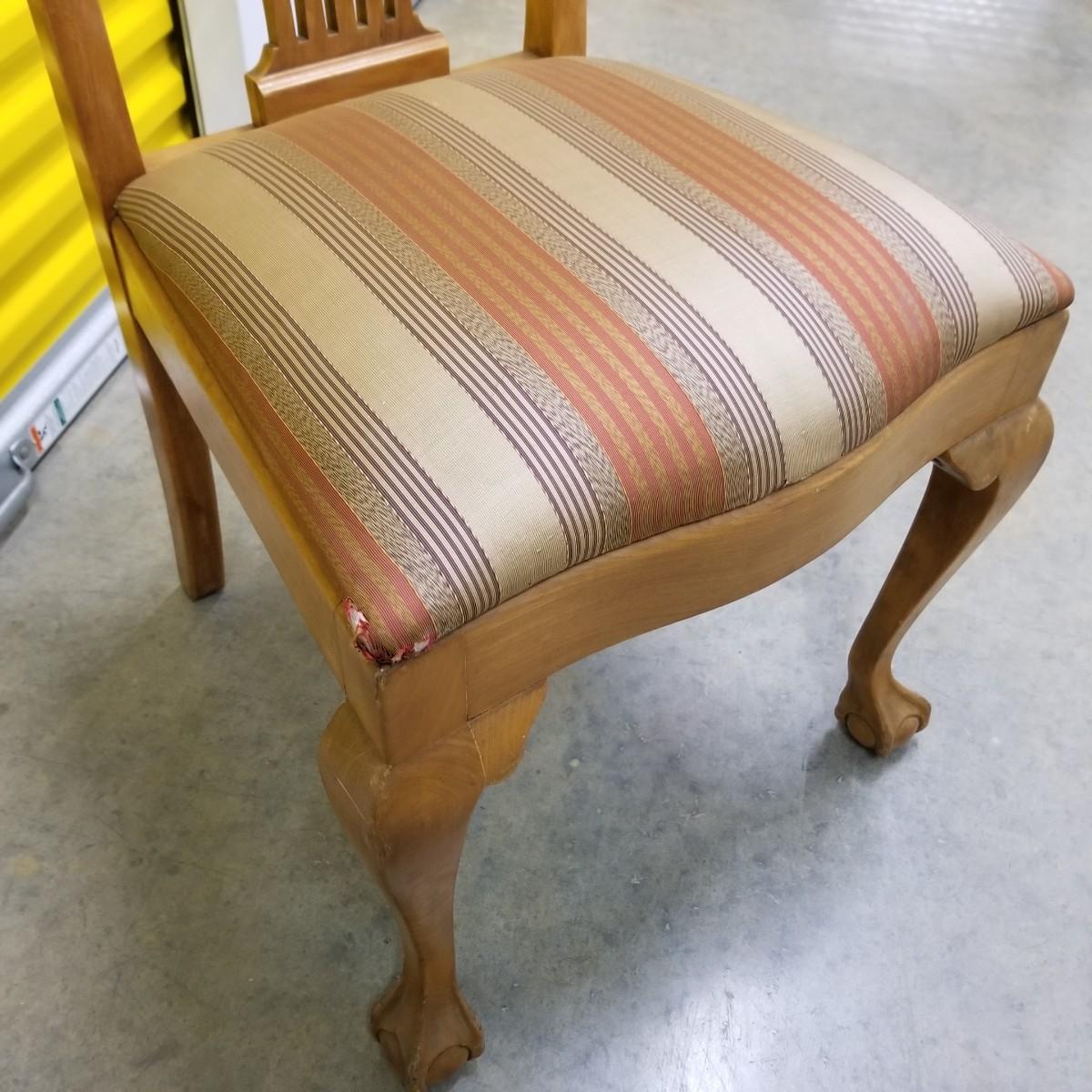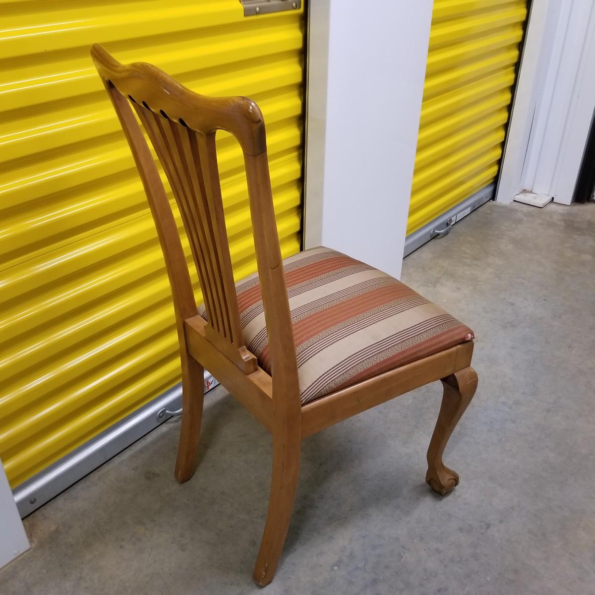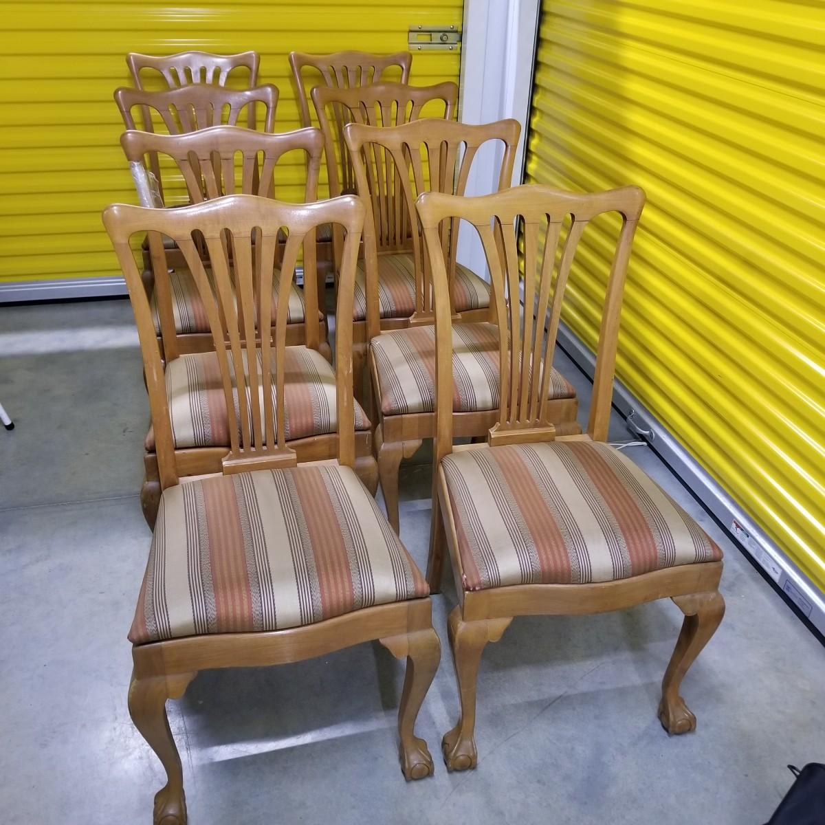 Set of eight dining room chairs with claw and ball feet.  Chairs appear to be oak. Upholstered seats in fair to good condition. Chairs measure 20"x19"x39.5" with a seat height of 21".  See photos for detail. Plan on late day pickup due to item position in storage area.  Local pickup only.