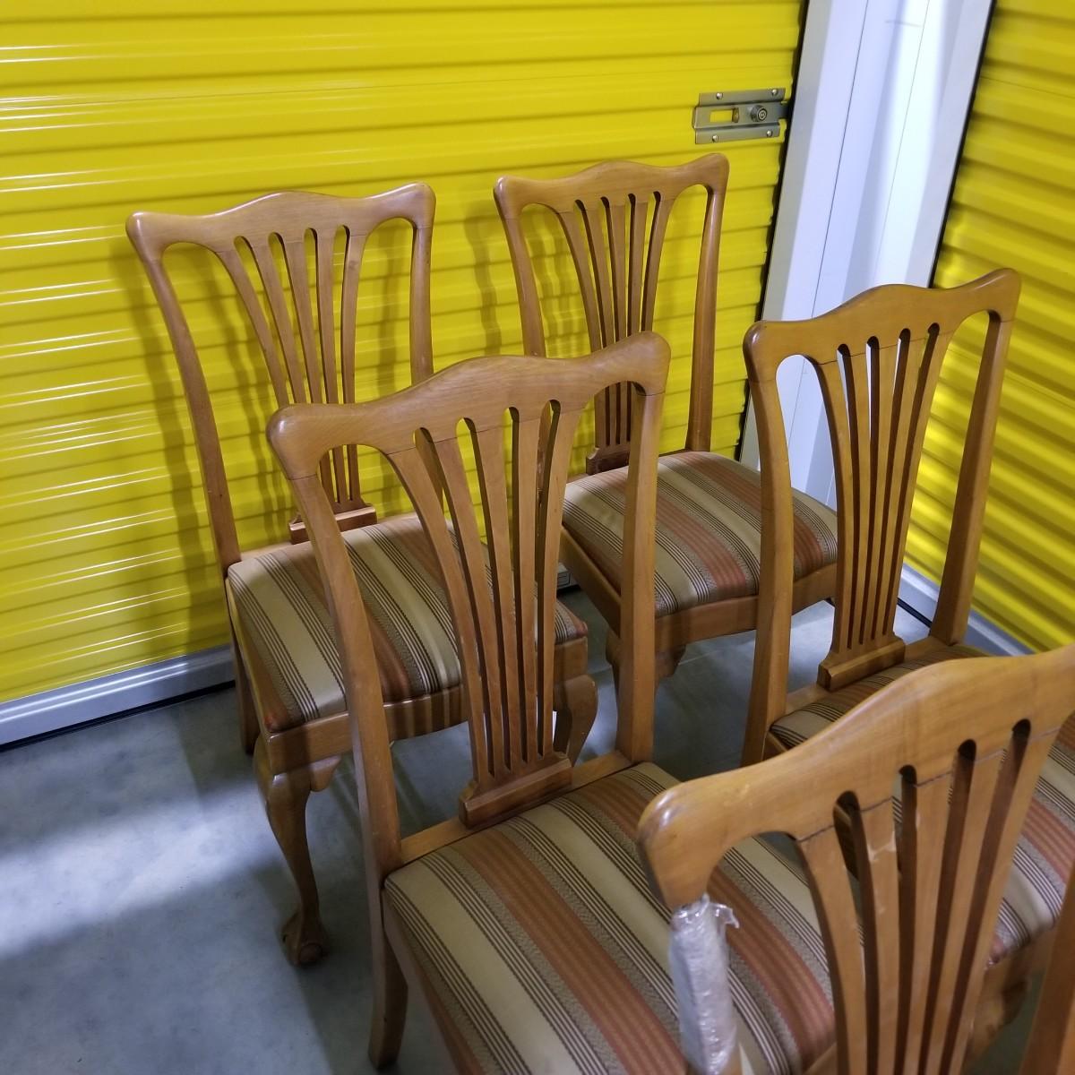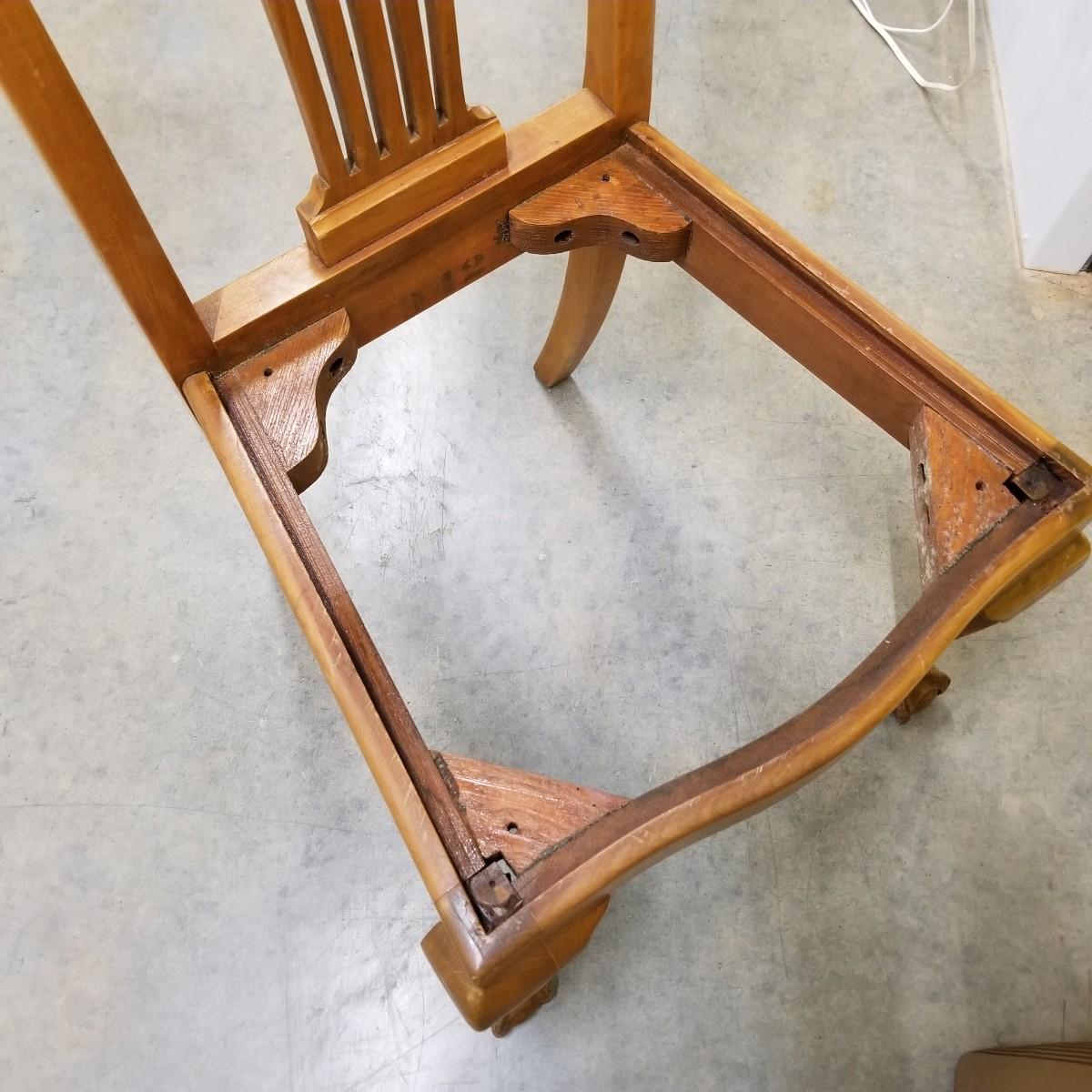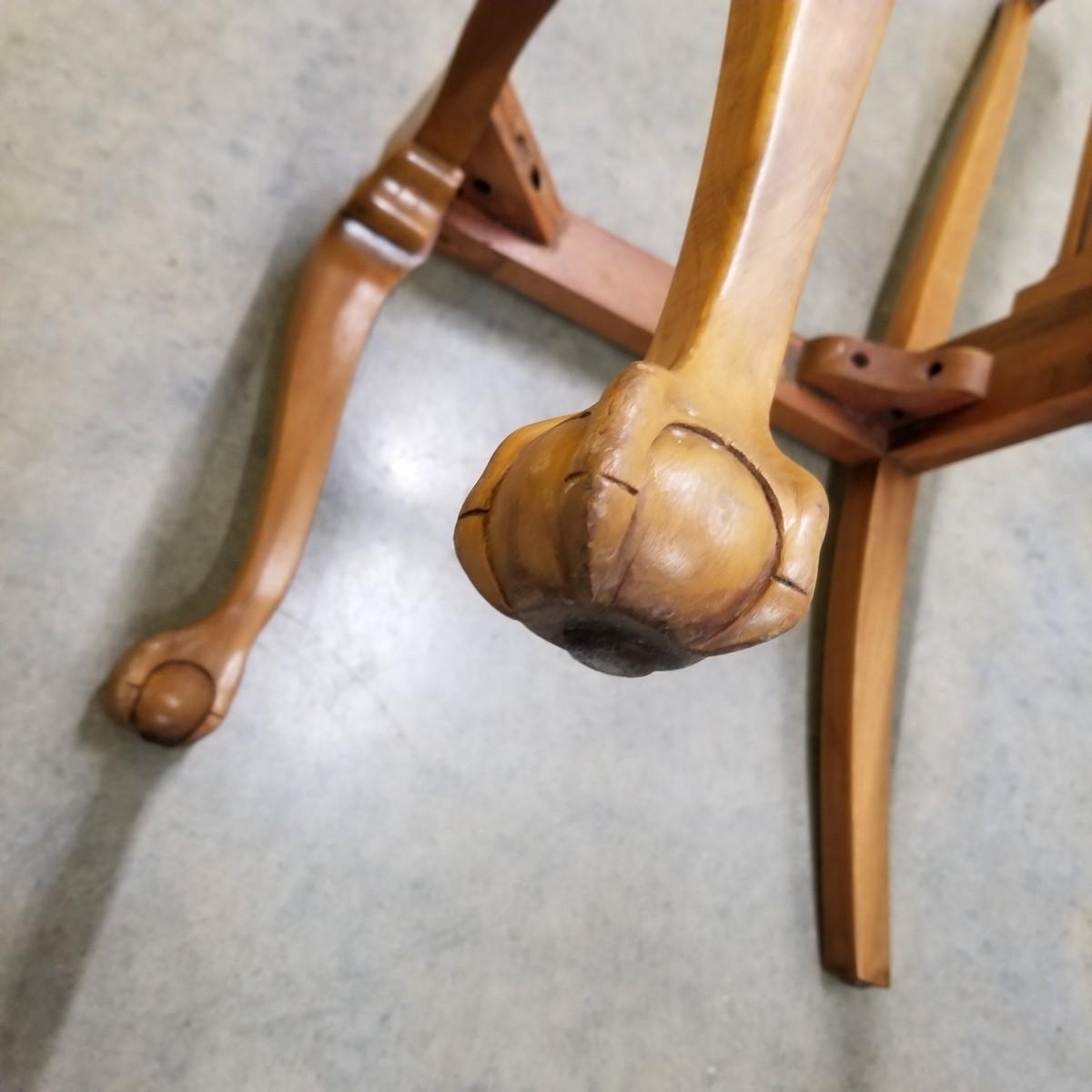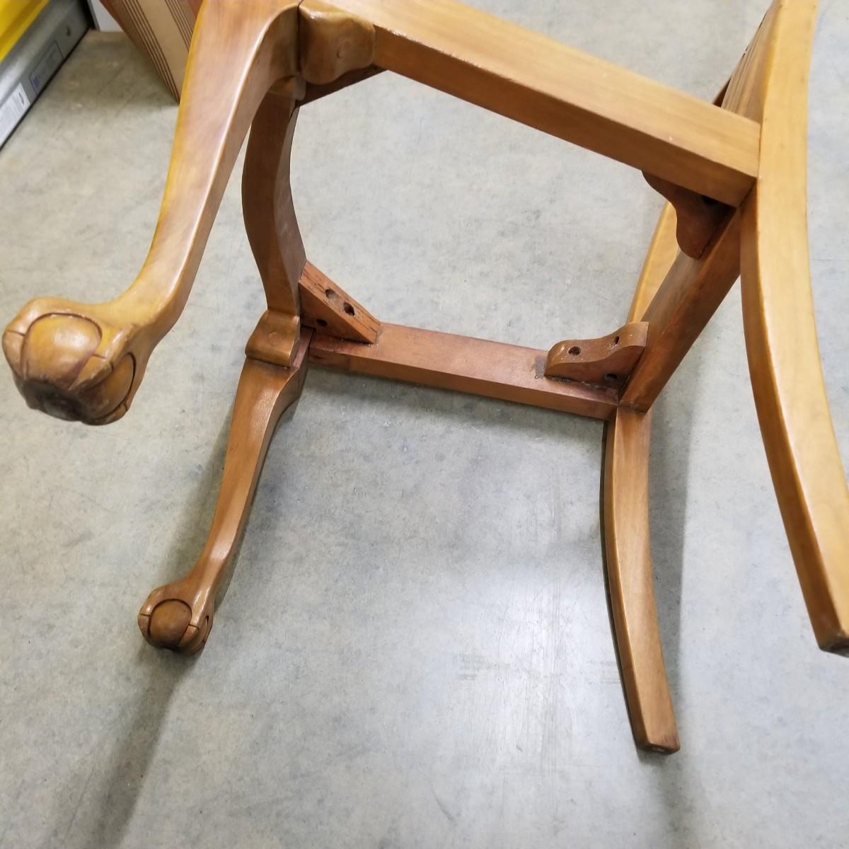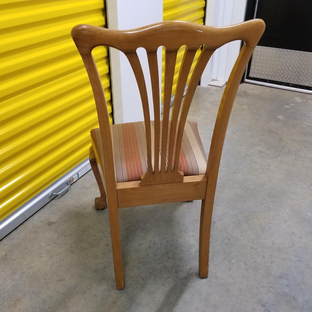 Set of eight dining room chairs with claw and ball feet.  Chairs appear to be oak. Upholstered seats in fair to good condition. Chairs measure 20"x19"x39.5" with a seat height of 21".  See photos for detail. Plan on late day pickup due to item position in storage area.  Local pickup only.