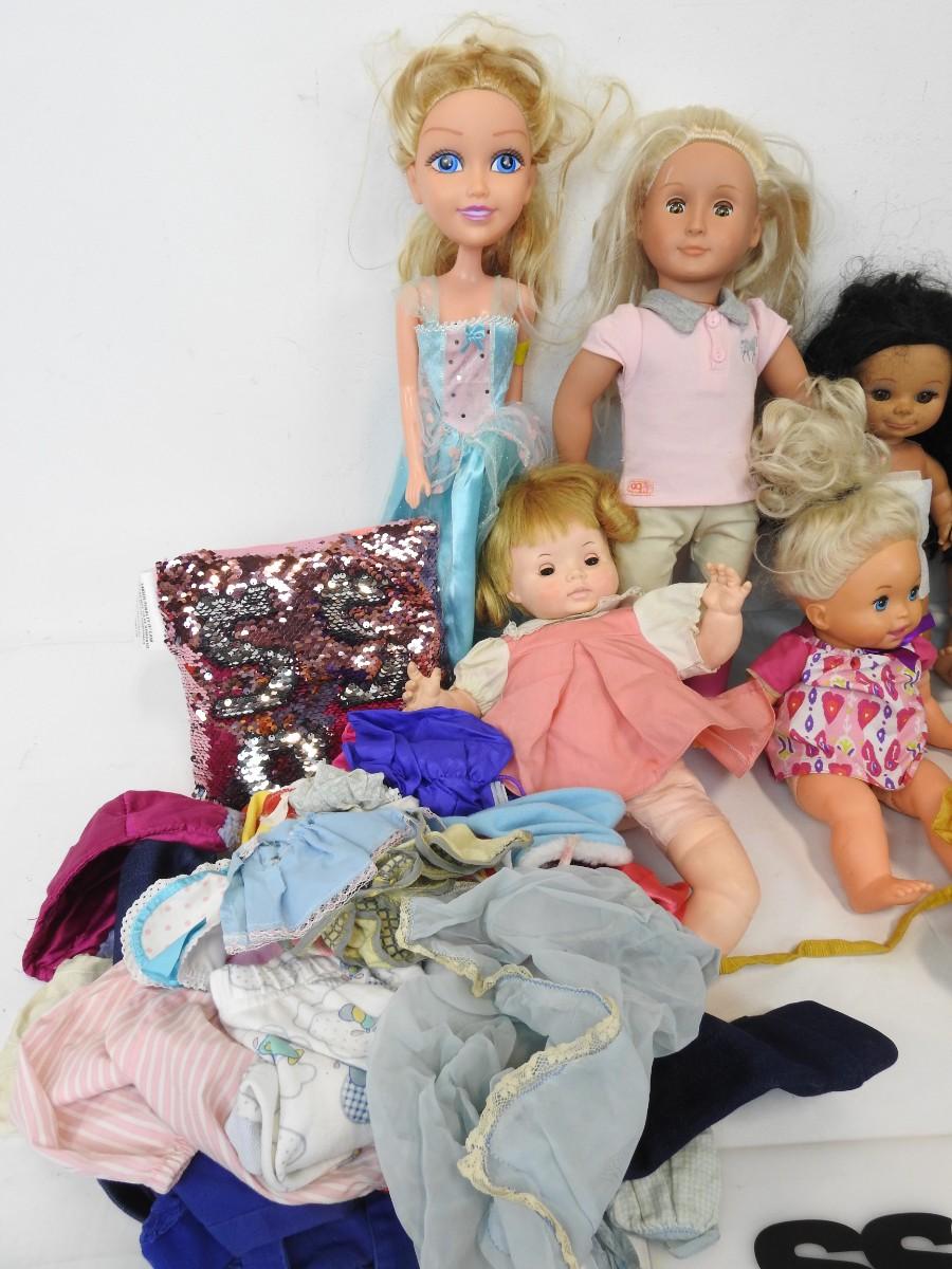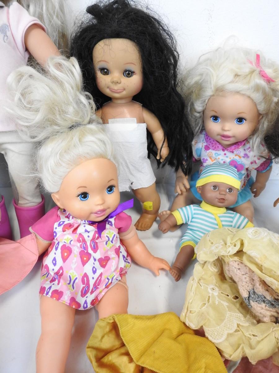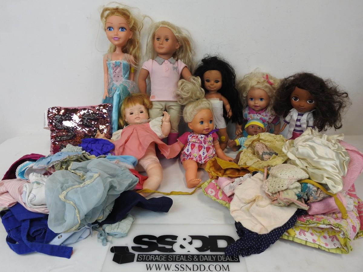 8 Dolls, Sequin Pillow, & various Doll Clothing