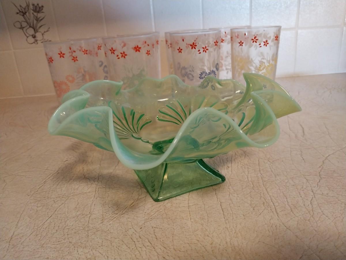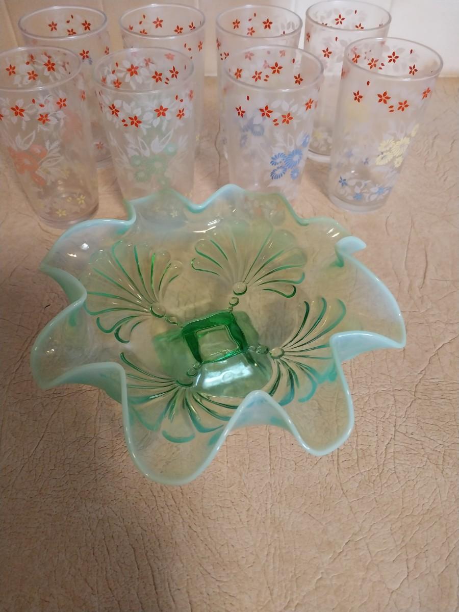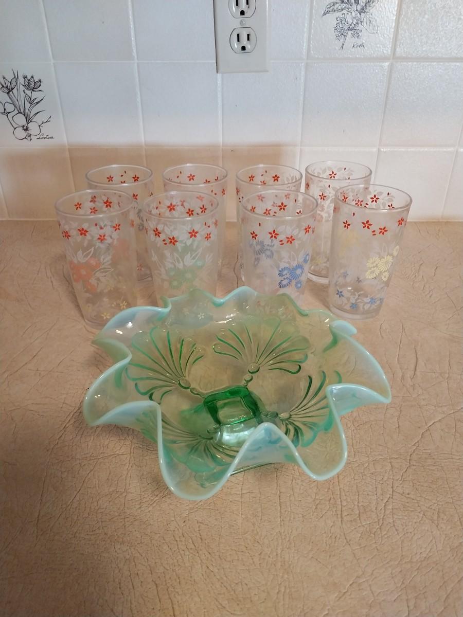8 FLORAL GLASSES AND A GREEN RUFFLED GLASS BOWL