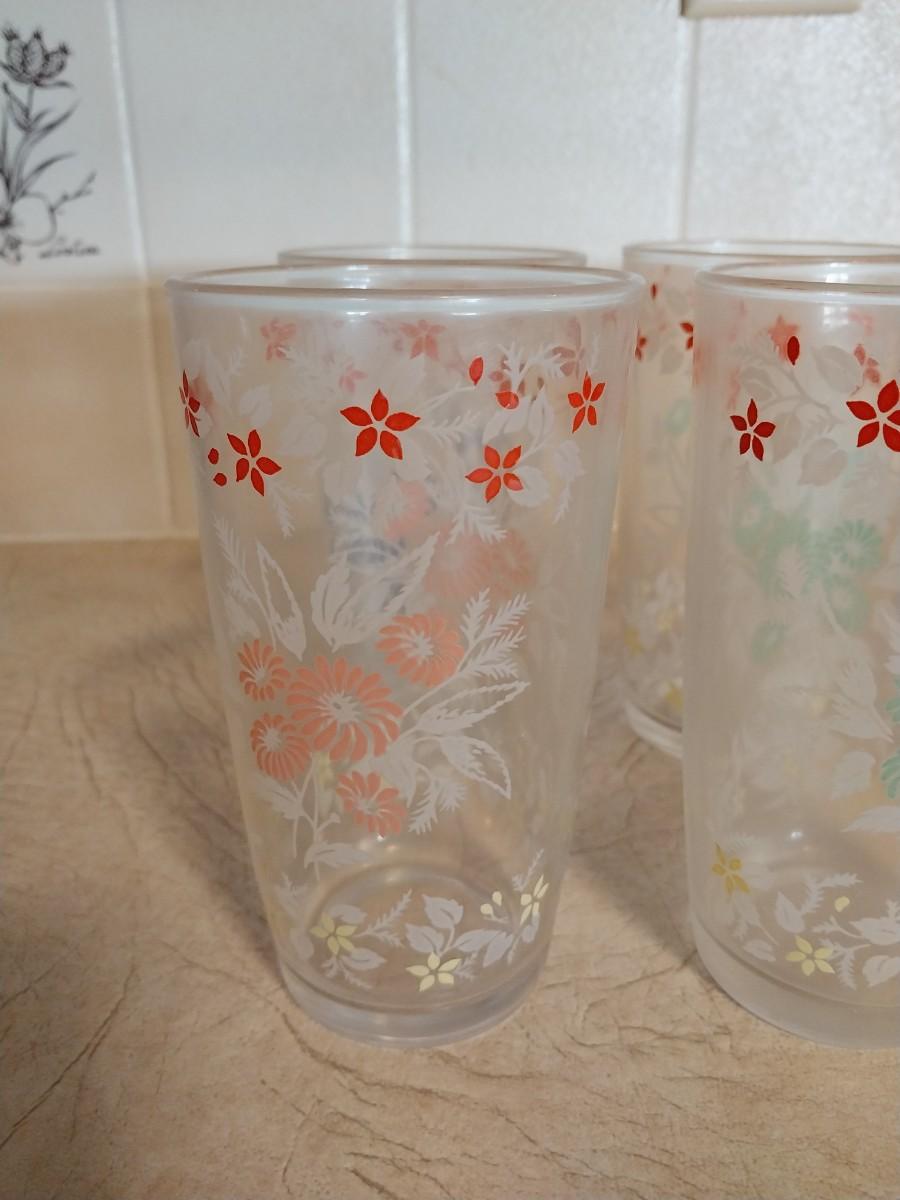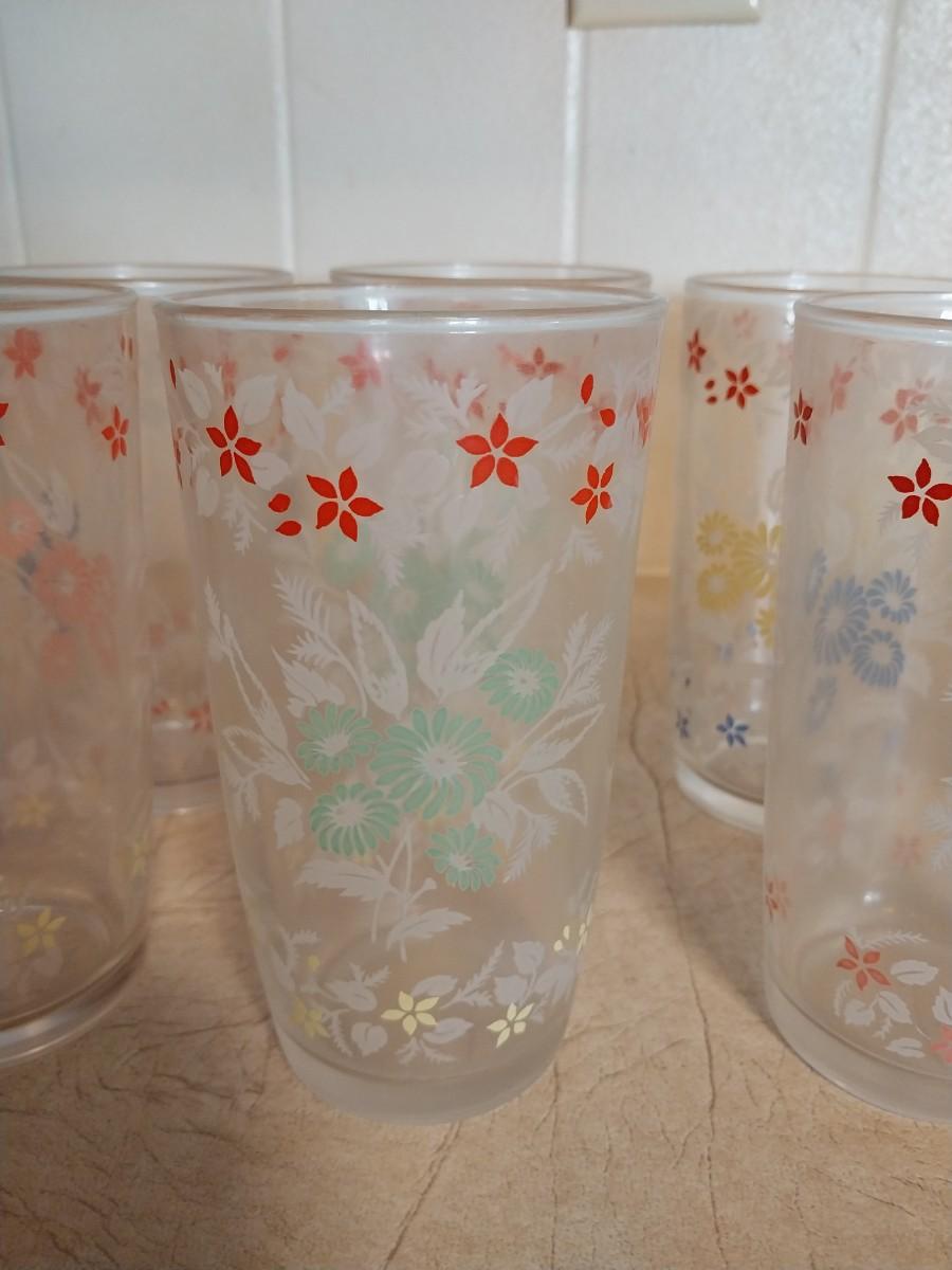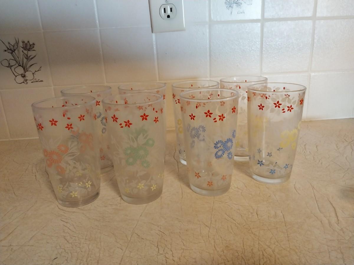 8 FLORAL GLASSES AND A GREEN RUFFLED GLASS BOWL