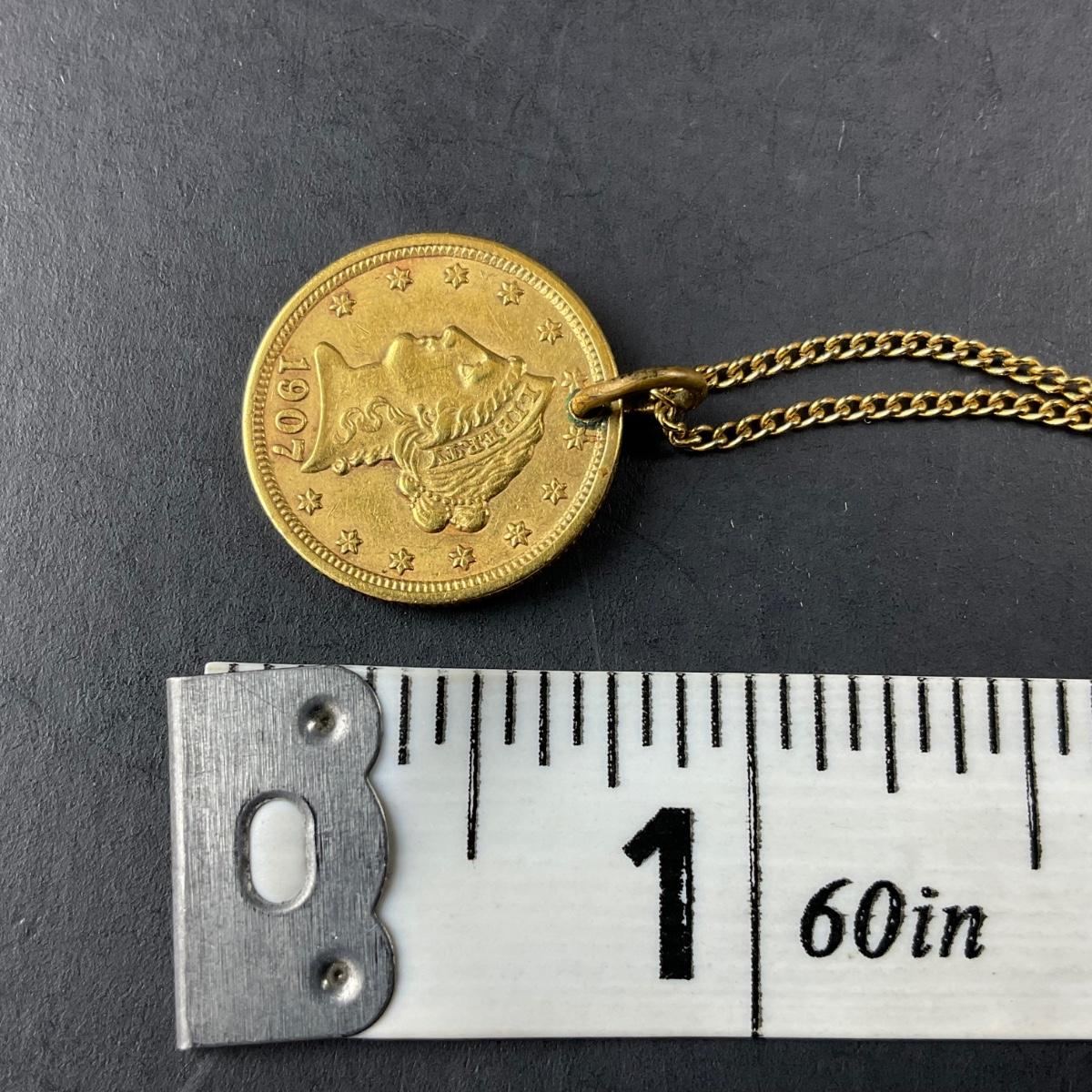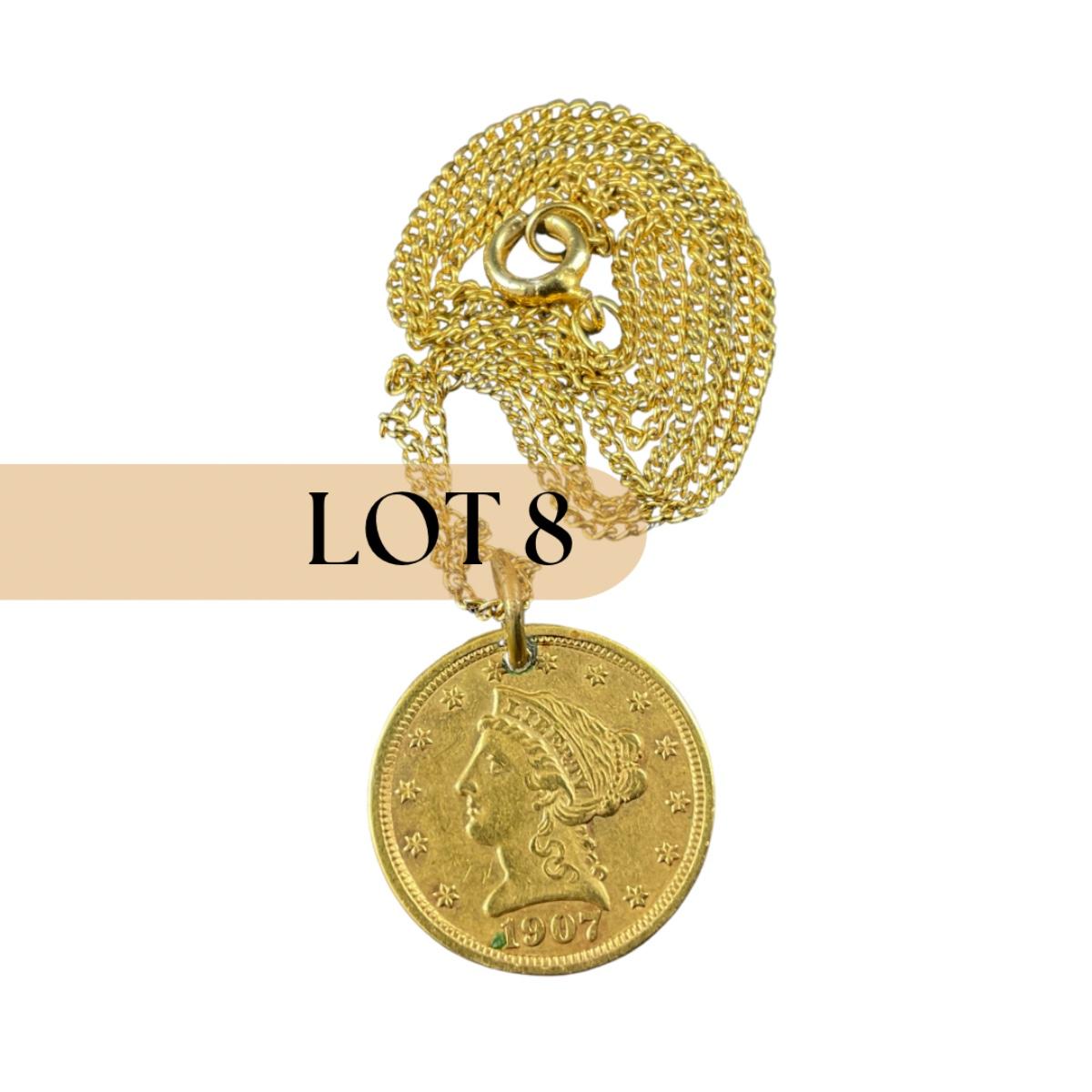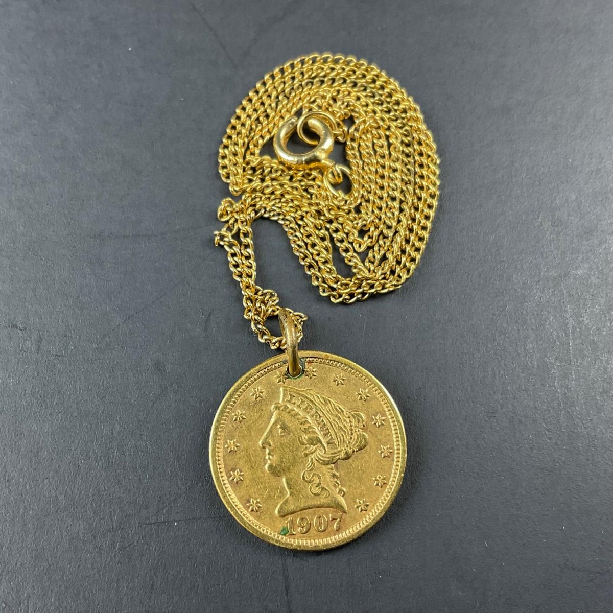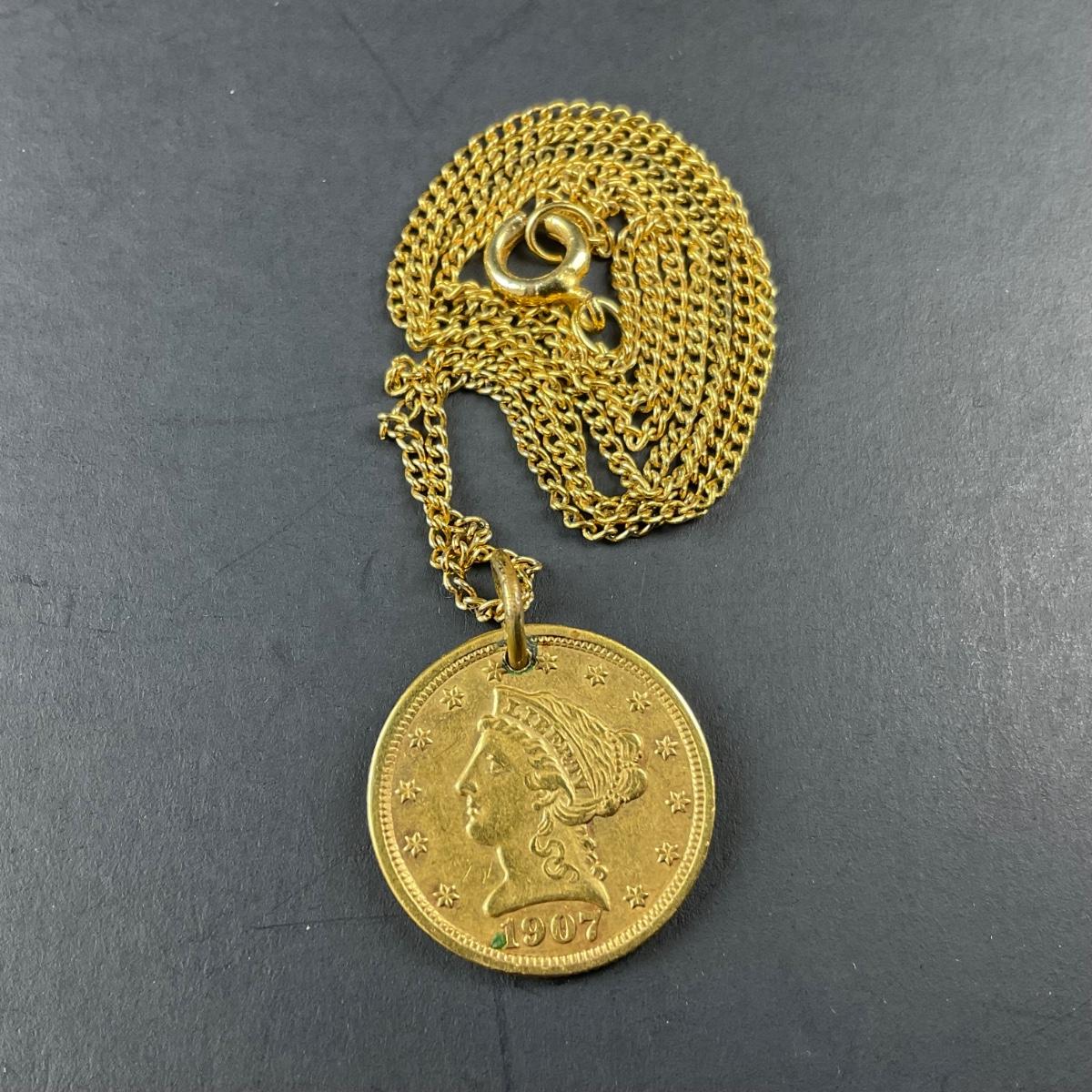 One 1907 Liberty Head (Cornet) 2 1/2 Dollar gold piece. Base metal chain and pendant link. Coin is tested and authentic. Please see photos for details and condition. Any condition statement is given as a courtesy to a client, is an opinion, and should not be treated as a statement of fact. Reference to condition written, oral or within a condition report shall not be regarded as a full account of condition and may not include all defects, alterations, or restorations. Absence of a condition report does not imply a lot is flawless or lacking imperfections or damage. Katherine’s Auction & Appraisal Service shall have no responsibility for any error or omission. Returns shall not be accepted on the basis of condition. ::: Shipping is available on this lot. If you require shipping you must let us know at the close of the auction. We will coordinate with you after the item has been won. Shipping fees will include insurance up to or exceeding the value of all items being mailed. If you have any questions regarding this lot please contact the auctioneer either via this website, by direct email or by phone. PICK UP TIMES and other important information can be found in the TERMS and DESCRIPTION of the auction. Please take a look for pertinent information. Thanks!