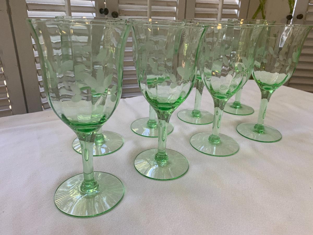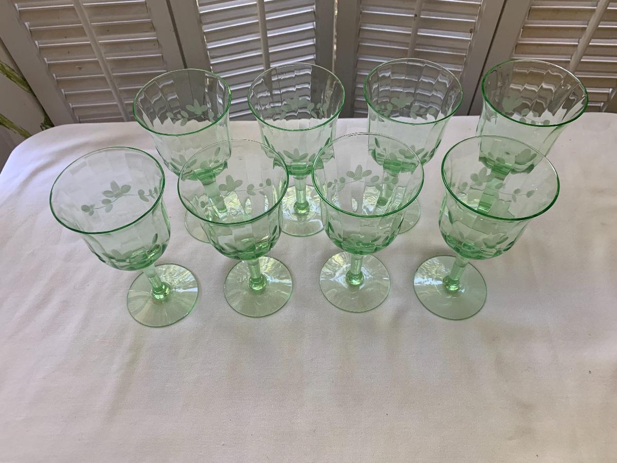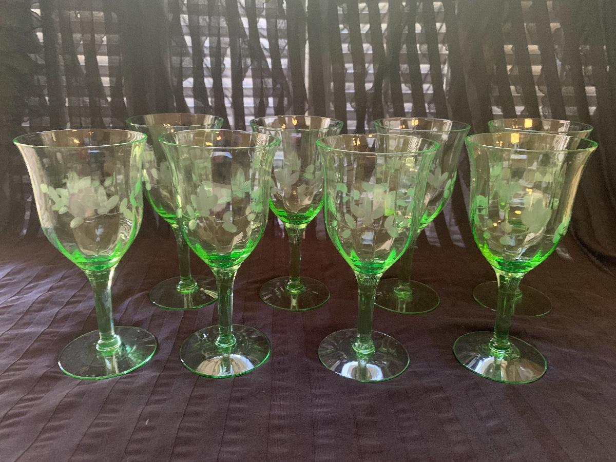 (8) Green Etched Crystal Wine Glasses- Beautiful